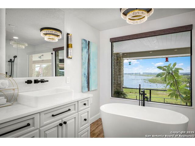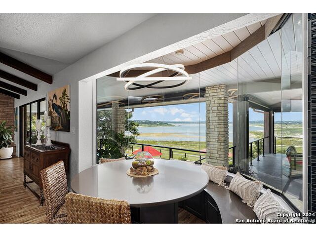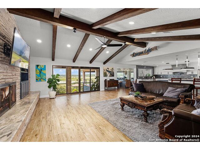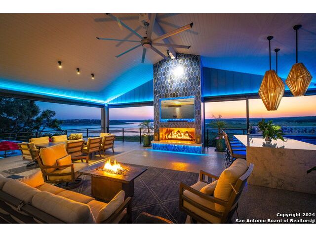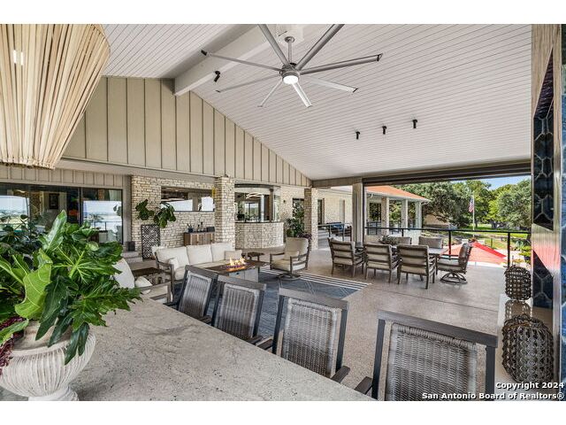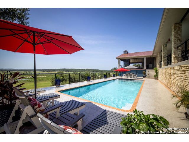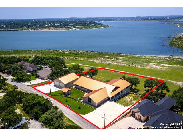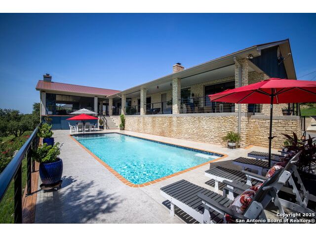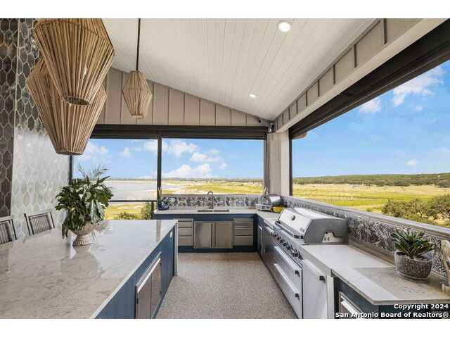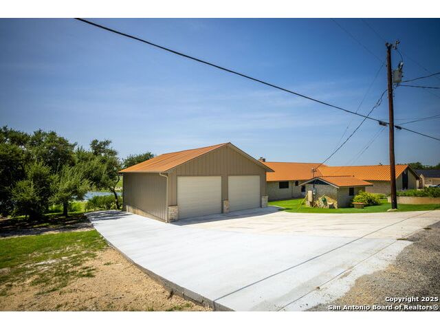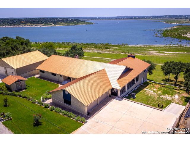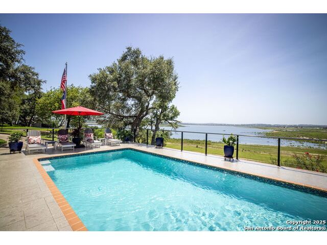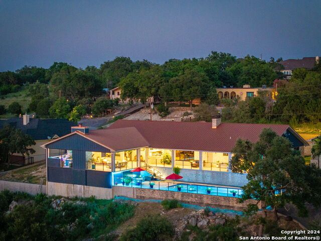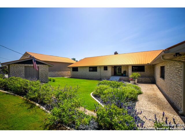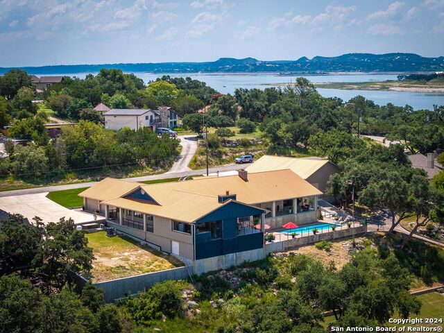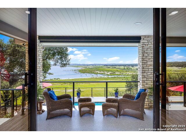 Situated on two acres with 296 feet of pristine Canyon Lake frontage, this rare gem blends luxury living with vibrant lakeside energy in one of Texas's most coveted destinations. This reimagined mid-century modern estate is the result of expert craftsmanship and soulful design, delivering a flawless fusion of comfort, style, and sophistication. Every element has been curated with exceptional care-from bold architectural features to top-tier finishes throughout. Cinematic views of Canyon Lake and the surrounding hill country greet you the moment you step through the custom-designed wrought iron pivot door. Inside, cathedral ceilings, hammered porcelain floors, and expansive windows bathe the living spaces in natural light, creating a serene indoor-outdoor connection. The chef-inspired kitchen is a showstopper-featuring Thermador appliances, a generous pantry, and a dramatic 9' x 5.5' waterfall Cambria quartz island. The open-concept design flows seamlessly into the living room, anchored by a striking chiseled granite fireplace that offers both warmth and wow factor. Slide open the glass doors to reveal a covered patio and expansive veranda with an outdoor kitchen-perfect for al fresco dining. From the tiled pool, soak in unobstructed lake views, or wander down to the private waterfront for boating, fishing, or peaceful reflection. A designer pool bath makes transitions from water to home effortless. The owner's wing is a sanctuary of comfort and elegance, offering tranquil lake views, private patio access, and spacious walk-in closets. The newly custom-designed en-suite bathroom is a spa-like retreat, featuring a luxurious soaking tub and a walk-in shower that overlooks the lake-perfect for unwinding while immersed in nature's beauty. Completing the estate is an attached 4-car garage and a 2,000-square-foot workshop with three oversized bays-ideal for car enthusiasts, boaters, or adventure seekers. Ask your agent for the complete property brochure and additional photography. And on a personal note... As a close friend of the owners, I've had the joy of witnessing this extraordinary transformation from the inside out. This home has been the setting for countless moments of love, laughter, and connection. It's not just a house-it's a vibe, a feeling, a place where people come together. When you're here, you don't just want to stay-you feel like you already belong.