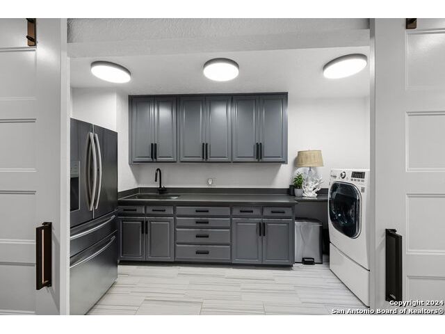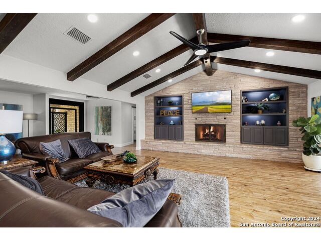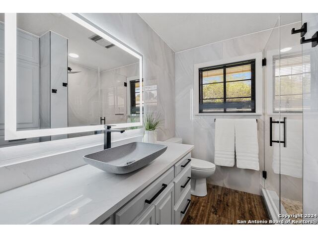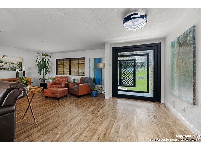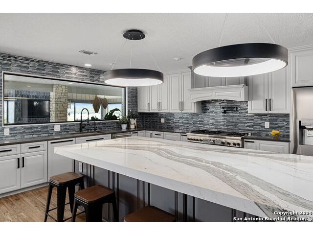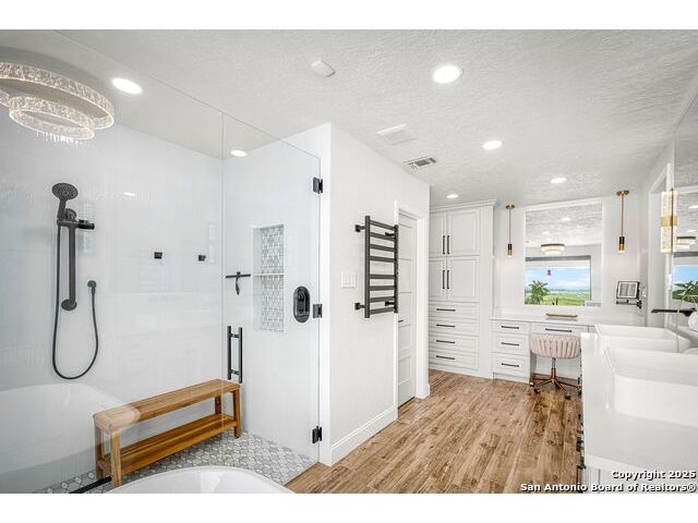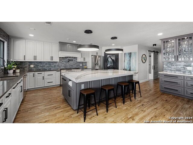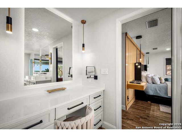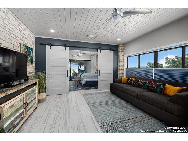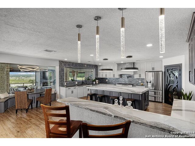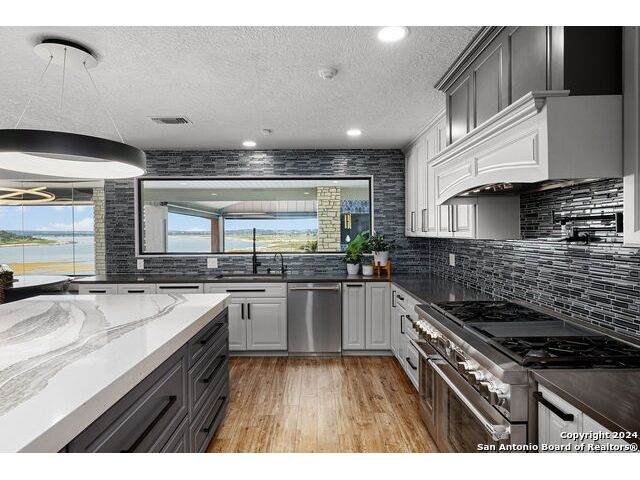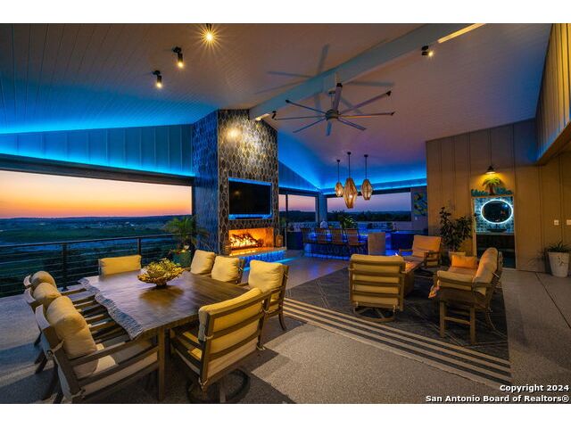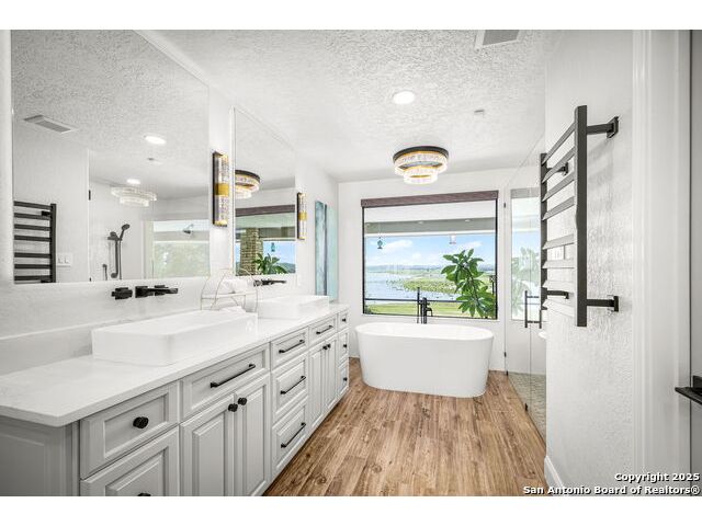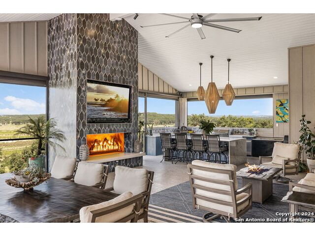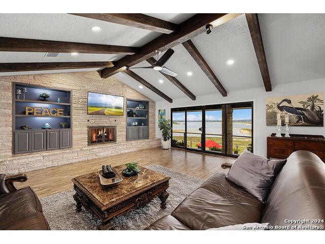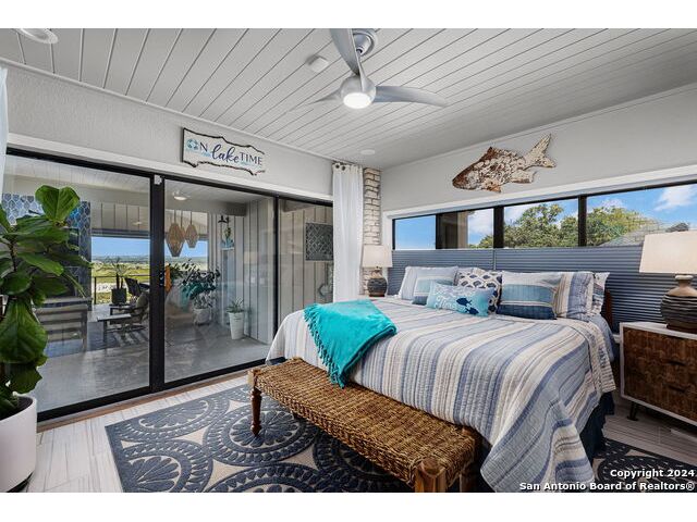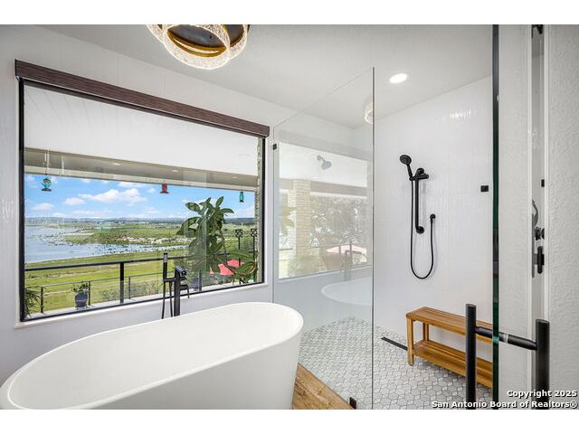 Situated on two acres with 296 feet of pristine Canyon Lake frontage, this rare gem blends luxury living with vibrant lakeside energy in one of Texas's most coveted destinations. This reimagined mid-century modern estate is the result of expert craftsmanship and soulful design, delivering a flawless fusion of comfort, style, and sophistication. Every element has been curated with exceptional care-from bold architectural features to top-tier finishes throughout. Cinematic views of Canyon Lake and the surrounding hill country greet you the moment you step through the custom-designed wrought iron pivot door. Inside, cathedral ceilings, hammered porcelain floors, and expansive windows bathe the living spaces in natural light, creating a serene indoor-outdoor connection. The chef-inspired kitchen is a showstopper-featuring Thermador appliances, a generous pantry, and a dramatic 9' x 5.5' waterfall Cambria quartz island. The open-concept design flows seamlessly into the living room, anchored by a striking chiseled granite fireplace that offers both warmth and wow factor. Slide open the glass doors to reveal a covered patio and expansive veranda with an outdoor kitchen-perfect for al fresco dining. From the tiled pool, soak in unobstructed lake views, or wander down to the private waterfront for boating, fishing, or peaceful reflection. A designer pool bath makes transitions from water to home effortless. The owner's wing is a sanctuary of comfort and elegance, offering tranquil lake views, private patio access, and spacious walk-in closets. The newly custom-designed en-suite bathroom is a spa-like retreat, featuring a luxurious soaking tub and a walk-in shower that overlooks the lake-perfect for unwinding while immersed in nature's beauty. Completing the estate is an attached 4-car garage and a 2,000-square-foot workshop with three oversized bays-ideal for car enthusiasts, boaters, or adventure seekers. Ask your agent for the complete property brochure and additional photography. And on a personal note... As a close friend of the owners, I've had the joy of witnessing this extraordinary transformation from the inside out. This home has been the setting for countless moments of love, laughter, and connection. It's not just a house-it's a vibe, a feeling, a place where people come together. When you're here, you don't just want to stay-you feel like you already belong.