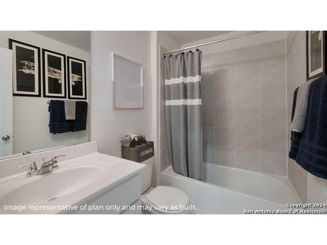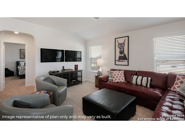 Step into The Landry, our largest two-story home at The Canyons at Amhurst in San Antonio, TX. is one of our larger floor plans. This layout features 5 bedrooms, 3.5 bathrooms and a 2-car garage. The Landry also offers 4 classic front exteriors and 2678 square feet of comfortable living. The Landry features classic designs and modern features that blend seamlessly to create the perfect space for you and your loved ones. The covered front patio (per plan) opens into a beautiful foyer and formal dining room with abundant natural light from multiple windows. The dining room leads into an open-concept kitchen with stainless steel appliances, quartz countertops, white subway tile backsplash, and an angled kitchen island that faces the spacious living room, perfect for entertaining! The private main bedroom suite is also located off the living room. Your bedroom area is spacious and you'll relax in style with large windows and quality carpet flooring. The ensuite bathroom features ceramic tile flooring, desirable double vanity sinks, separate garden tub and walk-in shower, a private water closet, and large walk-in closet with plenty of shelving. The second story of The Landry has so much to offer! A large loft area is waiting for you at the top of the stairs. Whether you use this space as a game room, office, or a media room, there is sure to be comfort. Your remaining 4 bedrooms are all located off the loft and include large windows, quality carpet flooring and spacious closets. You will also find 2 full bathrooms upstairs, complete with bath tub and shower combos and single vanity sinks. This floor plan even has a linen closet! Additional features include tall 9-foot ceilings, 2-inch faux wood blinds throughout the home, luxury vinyl plank flooring in the entry, family room, kitchen, and dining area, ceramic tile in the bathrooms and utility room, pre-plumb for water softener loop, and full yard landscaping and irrigation. You'll enjoy added security in your new home with our Home is Connected features. Using one central hub that talks to all the devices in your home, you can control the lights, thermostat and locks, all from your cellular device.