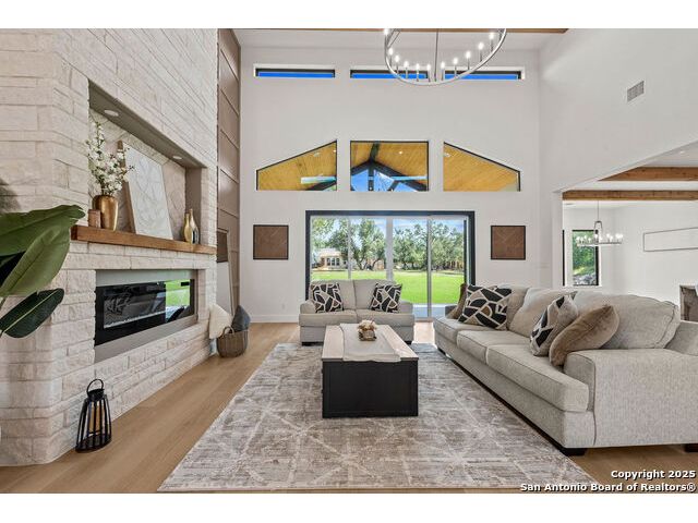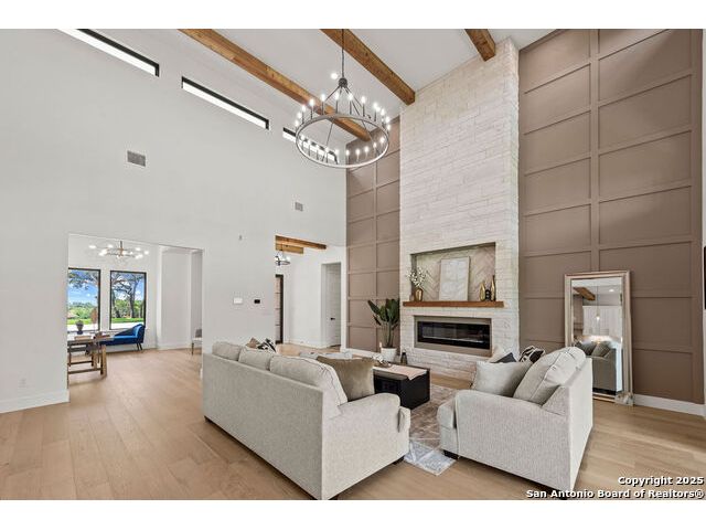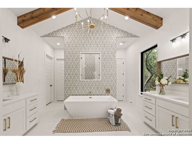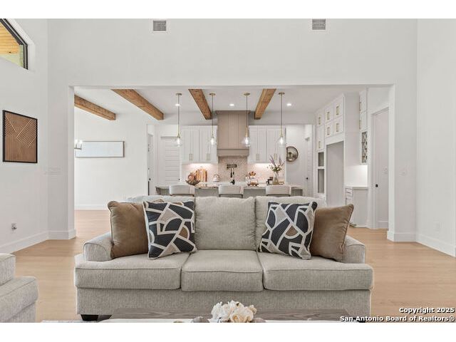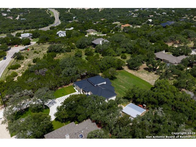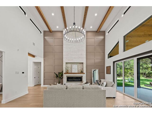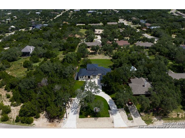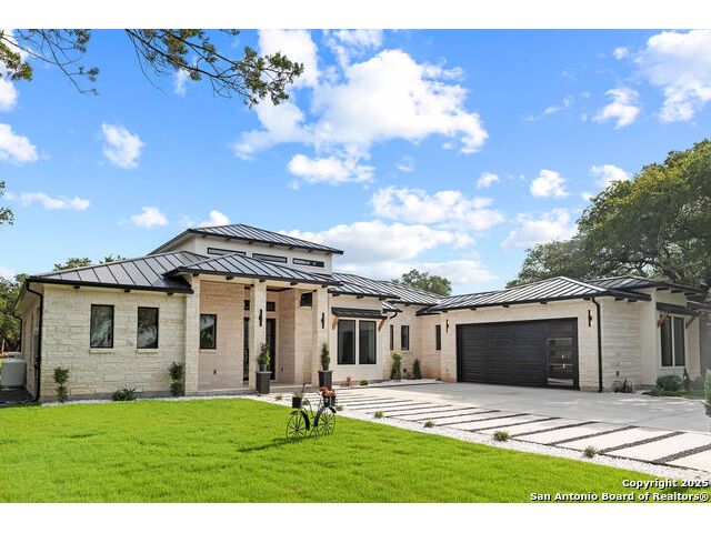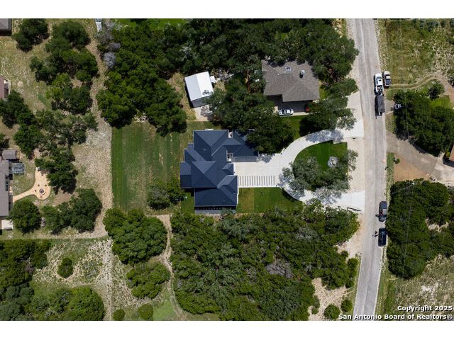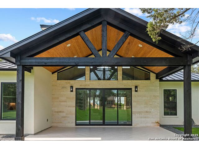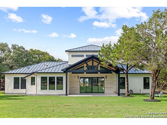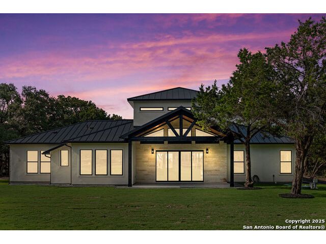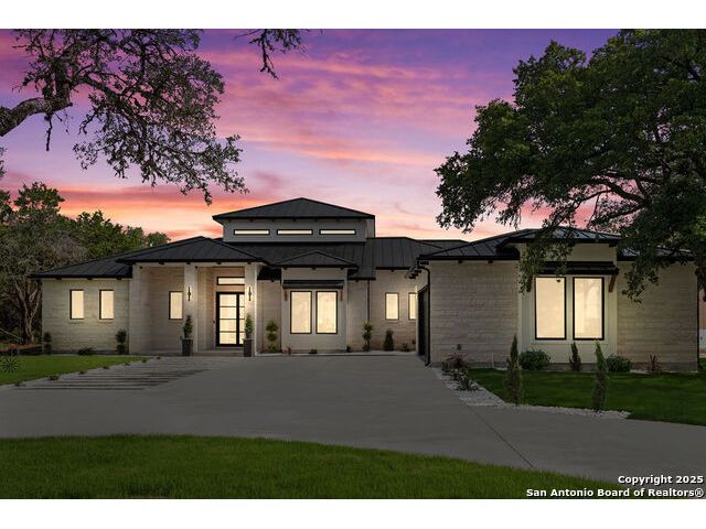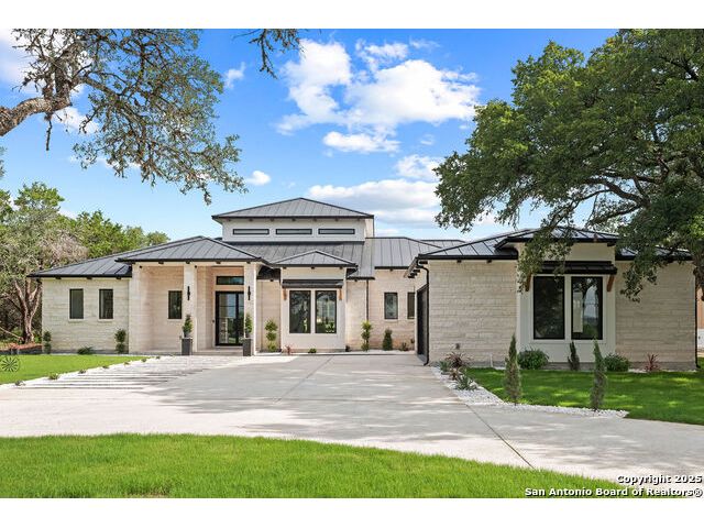Masterful design meets modern luxury in this one-of-a-kind home crafted by ACH Homes. A true show-stopper, this stunning residence features sleek, contemporary finishes and bold geometric-inspired design elements throughout-delivering exceptional style and sophistication at every turn. The front of the property features stunning limestone masonry, lush landscaping, and a modern circular driveway that adorns this 0.56-acre lot. The living area is bright and open, with exposed beams, high ceilings, and a stunning fireplace. Many windows offer a view of the Hill Country sunsets. You have an elegant dining room. Perfect for entertaining. This gourmet kitchen is designed to impress even the most discerning chef. Cedar wood beams and gold hardware bring warmth and elegance to the space, a marble island, a built-in oven and microwave, pendant lighting, and a sleek pot filler above the cooktop. A spacious walk-in pantry provides storage, and the built-in wine rack adds a touch of sophistication. Thoughtfully designed to accommodate a Sub-Zero refrigerator, this kitchen strikes a balance between beauty and practicality. Your spacious primary is spacious and serene. Wood beams and an accent wall lend this space an elegant feel. French doors lead you to a stunning ensuite with gold accents. It has a large walk-in shower, a Picturesque window, his/her vanities, a water closet, a soaking tub with a gorgeous tile accent wall, and a WIC. Feel like you're stepping into a spa every time you walk into this exquisite space. Two additional bathrooms and baths are spacious and bright. When it is time to relax, venture out to the expansive covered patio. Entertain in style in this space. It is located a short distance from Canyon Lake and Yogi Bear's Jellystone Park. Rent tubes to float down the river, jet ski on the lake, hike the various trails near the home, browse the boutique shops in town, be close to main roads, do lake activities, Wimberley shopping, San Antonio, and more.