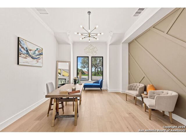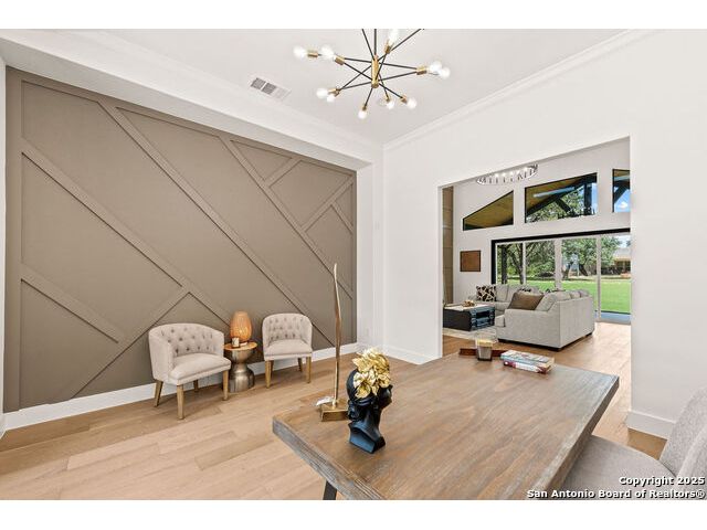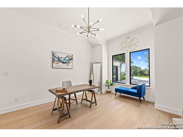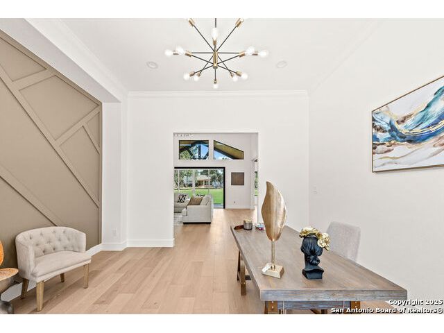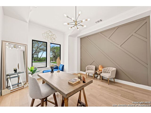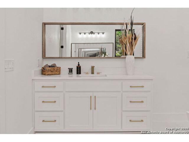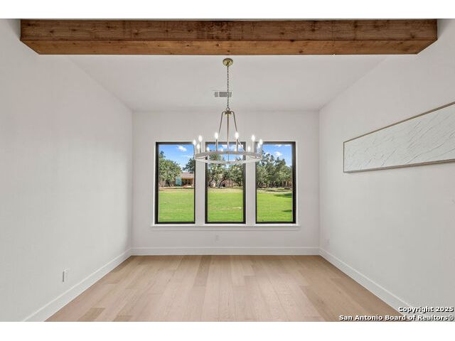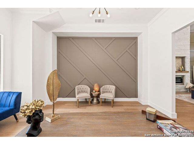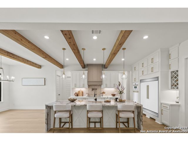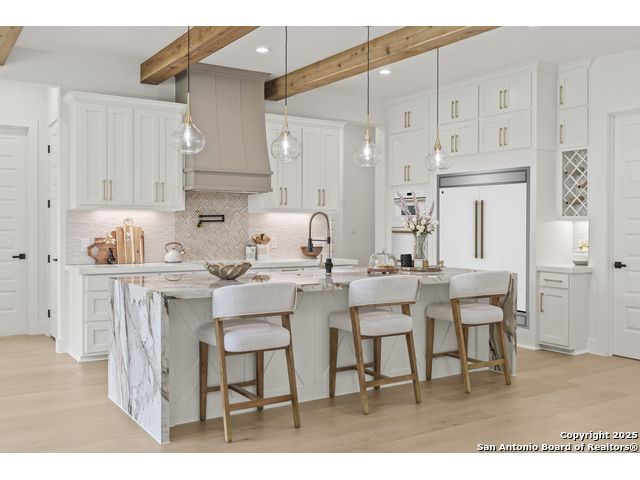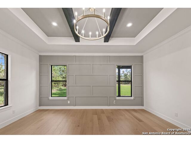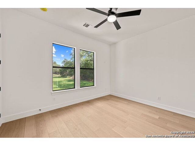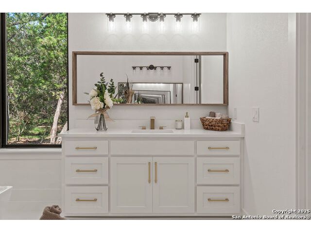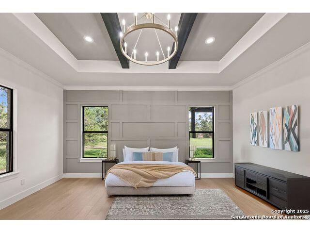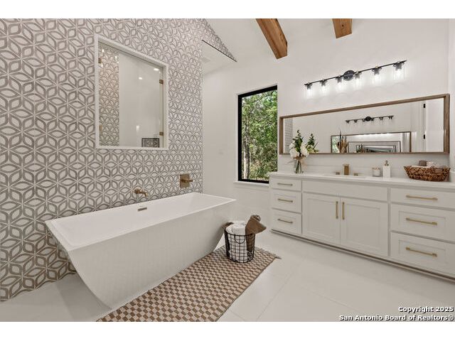 Masterful design meets modern luxury in this one-of-a-kind home crafted by ACH Homes. A true show-stopper, this stunning residence features sleek, contemporary finishes and bold geometric-inspired design elements throughout-delivering exceptional style and sophistication at every turn. The front of the property features stunning limestone masonry, lush landscaping, and a modern circular driveway that adorns this 0.56-acre lot. The living area is bright and open, with exposed beams, high ceilings, and a stunning fireplace. Many windows offer a view of the Hill Country sunsets. You have an elegant dining room. Perfect for entertaining. This gourmet kitchen is designed to impress even the most discerning chef. Cedar wood beams and gold hardware bring warmth and elegance to the space, a marble island, a built-in oven and microwave, pendant lighting, and a sleek pot filler above the cooktop. A spacious walk-in pantry provides storage, and the built-in wine rack adds a touch of sophistication. Thoughtfully designed to accommodate a Sub-Zero refrigerator, this kitchen strikes a balance between beauty and practicality. Your spacious primary is spacious and serene. Wood beams and an accent wall lend this space an elegant feel. French doors lead you to a stunning ensuite with gold accents. It has a large walk-in shower, a Picturesque window, his/her vanities, a water closet, a soaking tub with a gorgeous tile accent wall, and a WIC. Feel like you're stepping into a spa every time you walk into this exquisite space. Two additional bathrooms and baths are spacious and bright. When it is time to relax, venture out to the expansive covered patio. Entertain in style in this space. It is located a short distance from Canyon Lake and Yogi Bear's Jellystone Park. Rent tubes to float down the river, jet ski on the lake, hike the various trails near the home, browse the boutique shops in town, be close to main roads, do lake activities, Wimberley shopping, San Antonio, and more.