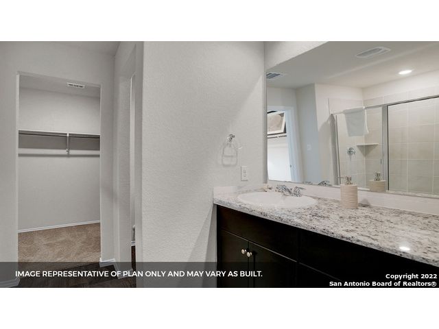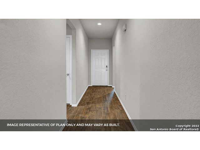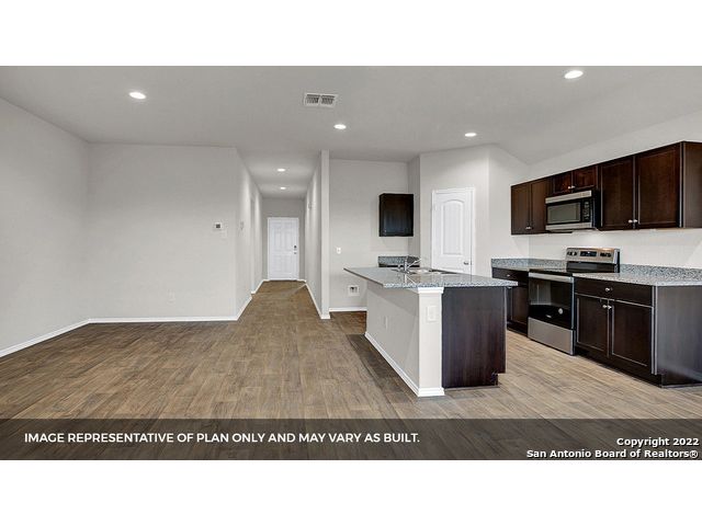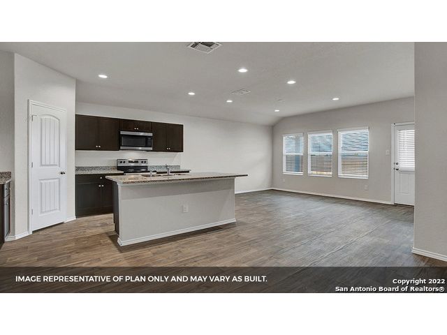 The Easton plan located at beautiful Brookstone Creek in San Antonio, TX offers a perfect balance of style, comfort, and functionality within a spacious 1680 square foot, single-story layout. Featuring 4 bedrooms and two full bathrooms, this home is designed with you and your loved ones in mind. A welcoming elongated foyer guides you into the heart of the home, where an open-concept kitchen, dining area and living room create a bright, airy space ideal for gatherings and everyday life. The kitchen stands out with stainless steel appliances, a gas cooking range, quartz countertops, a spacious kitchen island and a farmhouse style sink. Stylish flat panel cabinetry and classic white subway tile backsplash complete the modern look in this home. The primary bedroom suite, privately located at the rear of the home, offers a relaxing retreat with a walk-in shower, dual vanity sinks and a massive walk-in closet. At the front of the home, the secondary bedrooms provide privacy and flexibility - perfect for children, guests or home offices. Each features quality carpet flooring, large windows and ample closet space for comfort and convenience. This home includes our HOME IS CONNECTED base package. Using one central hub that talks to all the devices in your home, you can control the lights, thermostat and locks, all from your cellular device. Additional highlights of The Easton include vinyl plan flooring throughout the main living areas, a covered patio (per plan), full yard landscaping with irrigation and a pre-plumbed water softener loop. The Easton brings practical elegance to life in Brookstone Creek! We're ready to welcome you home!