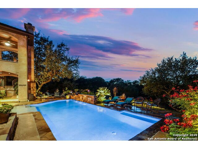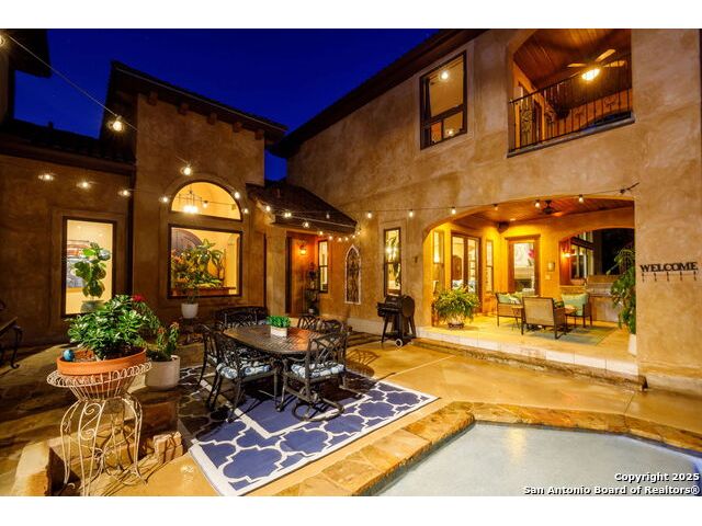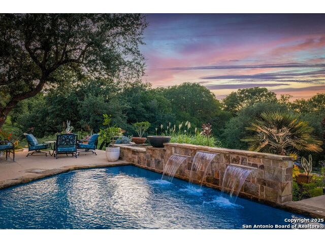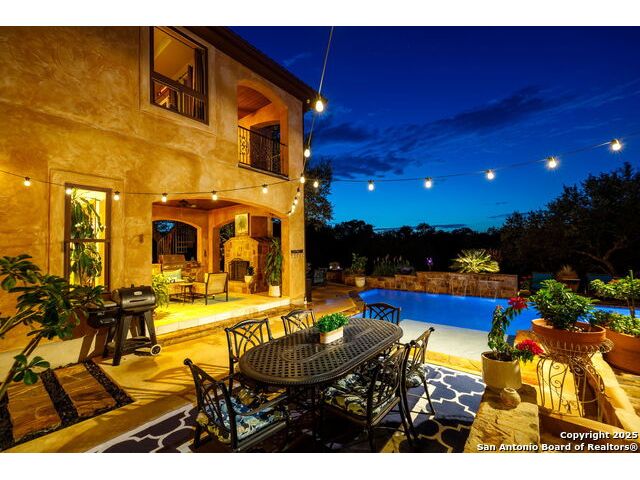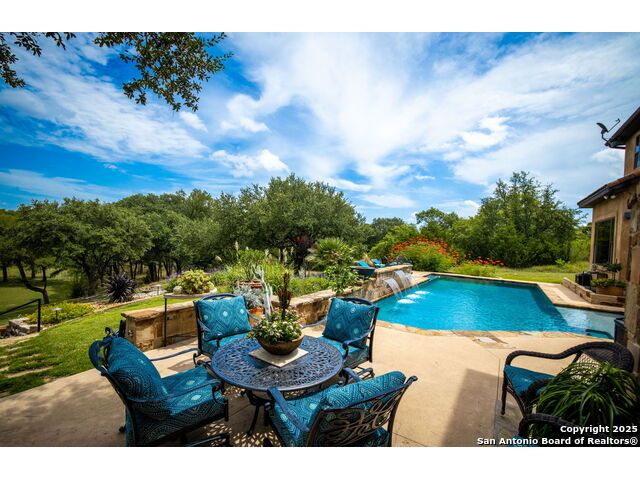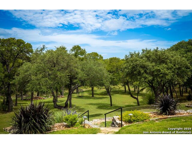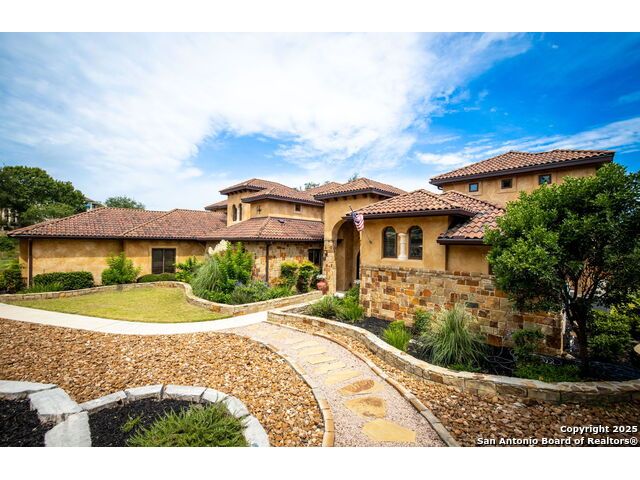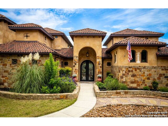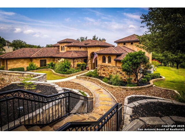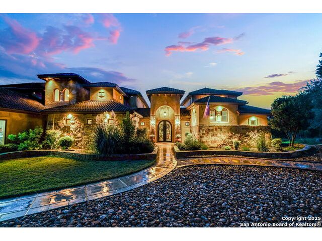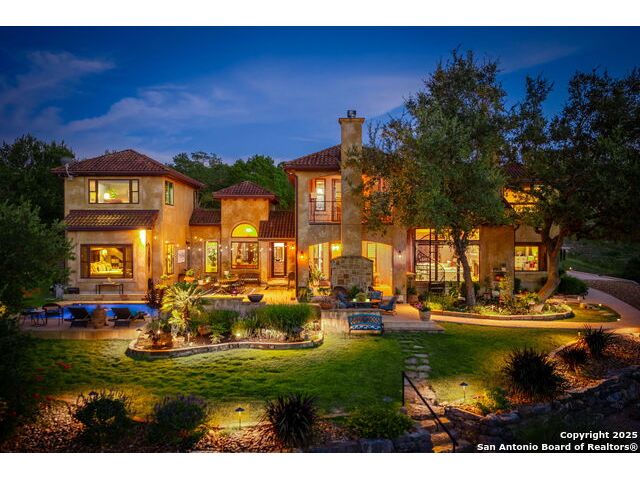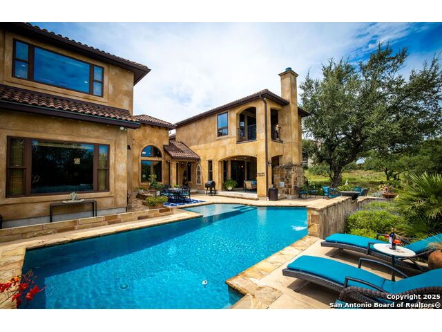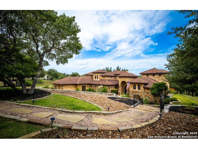 Tuscan-inspired luxury in the heart of the Texas Hill Country awaits in this impeccably designed custom home in the exclusive gated community of Las Brisas at Canyon Lake. Set on 1.4 beautifully landscaped, park-like acres with stunning hill country views and private access to Tom Creek, this stone-and-stucco masterpiece features an exterior hand-troweled pulverized granite finish that never needs painting. Enjoy kayaking, hiking, or simply relaxing by the fire pit under starry skies, with easy walks to the community nature area to the left of the property and Canyon Lake cove to the right. Indoors, discover timeless craftsmanship with hand-troweled walls in the living, dining, and master suite, glazed finishes, and an impressive foyer ceiling artwork feature. Entertain effortlessly with an open-concept great room filled with large picture windows framing the breathtaking views, a gourmet chef's kitchen with Thermador dual-fuel range (6 gas burners, 2 electric ovens, griddle), a plumbed Miele coffee maker, and custom knotty alder cabinetry designed for ultimate functionality. A large butler pantry/laundry room, utility closet with electronic storage, and thoughtful custom shelving add practical elegance. Music lovers will appreciate the 8-zone built-in speaker system throughout the home, controlled by HoloWhas, while the upstairs game room impresses with a full wet bar (kegerator, sink, beverage refrigerator), surround-sound readiness, custom shades, and balcony access with panoramic hill country views. Outdoor living shines with a Cody Pool featuring remote-controlled waterfall, lighting, and cleaner, an outdoor wood-burning fireplace with gas option, gas grill and burner, outdoor spiral staircase, and three patio areas including one covered. The oversized 3-car garage features epoxy flooring and Aladdin app-controlled access for the large door. The primary suite is a luxurious retreat with hardwood floors, spa-like bath, custom closet with cabinetry and a "closet within a closet" design, private access to an office/multi-purpose room perfect as an exercise space or studio, and ceiling fans for comfort. Additional features include travertine tile throughout the downstairs, hardwood floors in upstairs rooms and stairs, a wheelchair-accessible downstairs guest suite, family tree mural on the upstairs landing, programmable front entry and eaves lighting via the Lutron app, Hydrawise app-controlled sprinkler system, Emtek door handles with bolt locks on backyard doors, custom shades in all bedrooms and the upstairs game room, a water softener system, and exceptional sound insulation for quiet, peaceful living. Residents of Las Brisas enjoy unmatched amenities, including a waterfront community park and infinity-edge pool overlooking the turquoise lake, a pavilion with grill, fire pit, waterfalls along Tom Creek, miles of hiking and ATV trails, and a private nature preserve. All this is conveniently located on Canyon Lake's south shore for easy access to Gruene, Wimberley, Blanco, New Braunfels, San Marcos, Hill Country wineries, shopping, dining, music venues, and top medical facilities. Experience refined Hill Country living with authentic Tuscan flair in this move-in-ready masterpiece. Schedule your private tour today.
