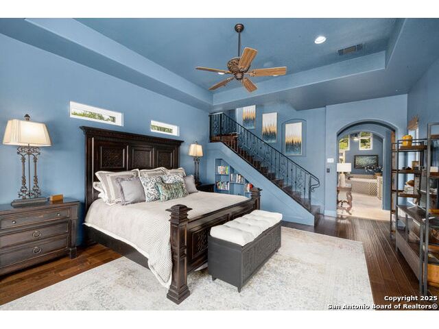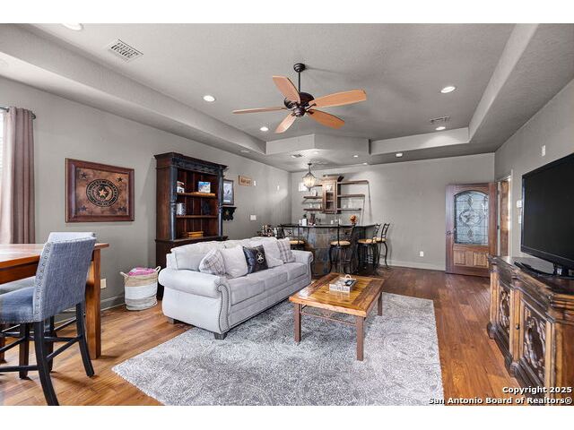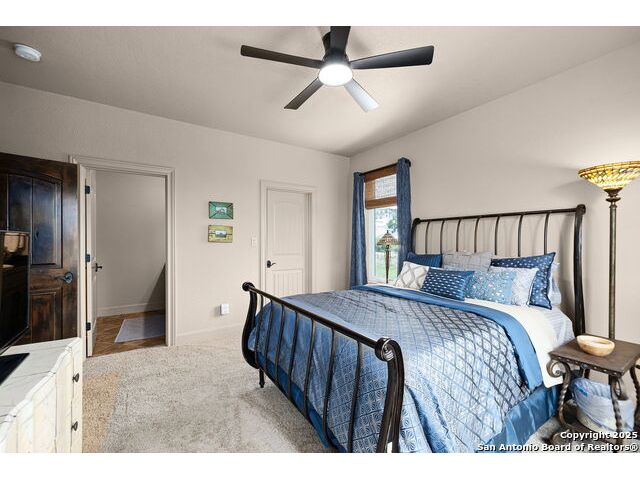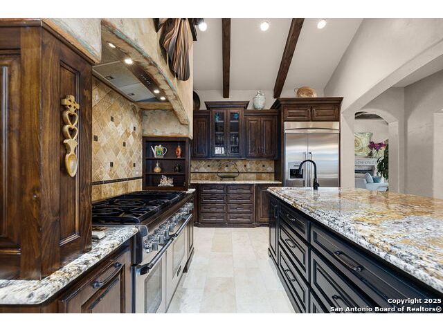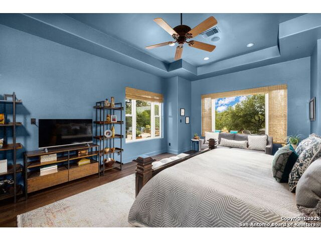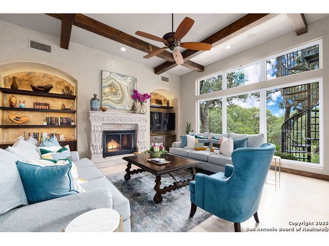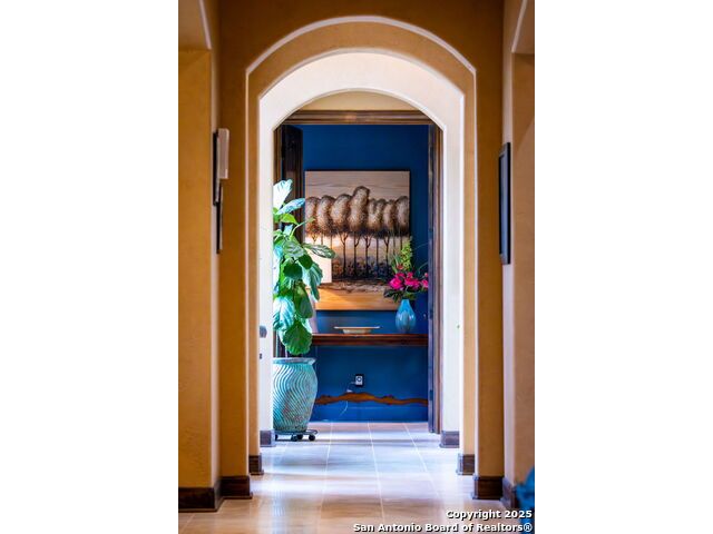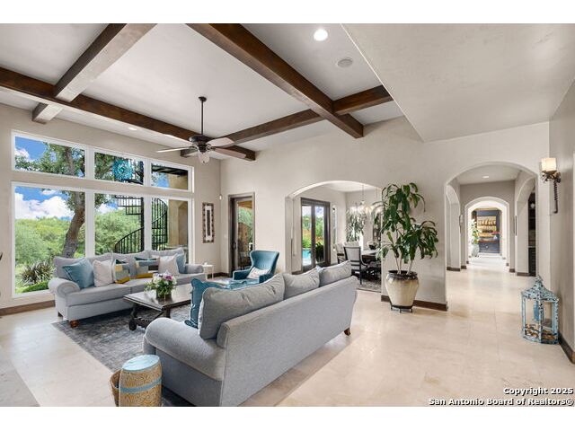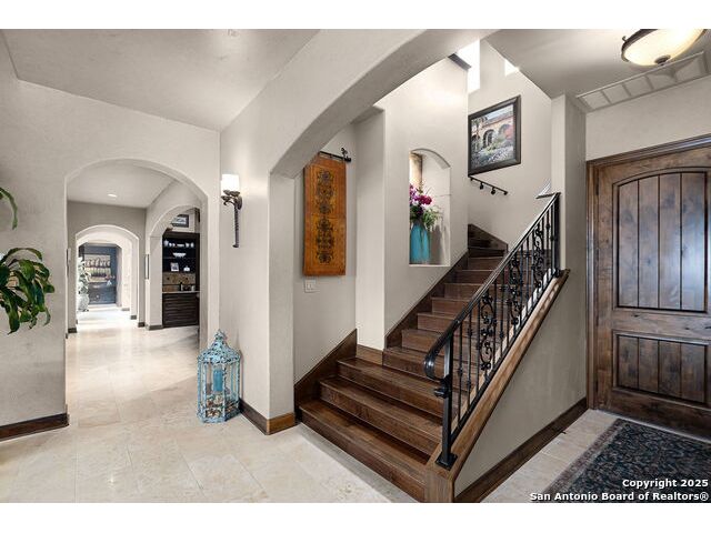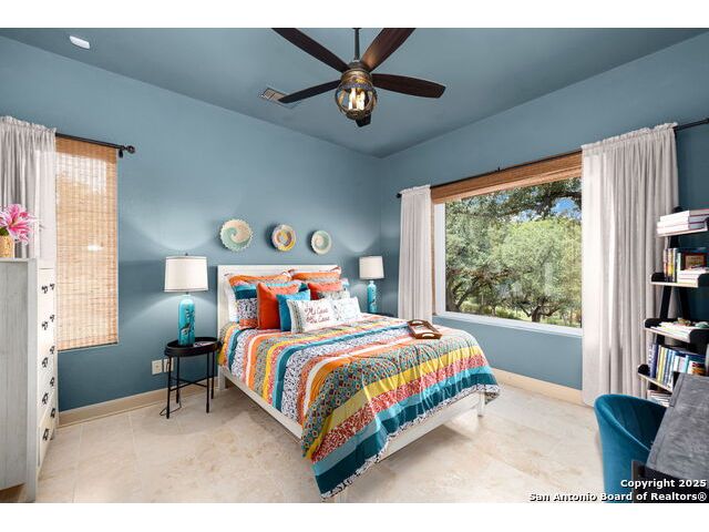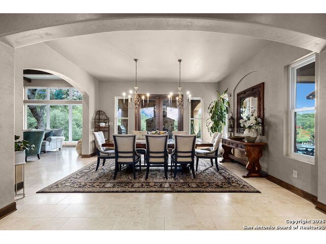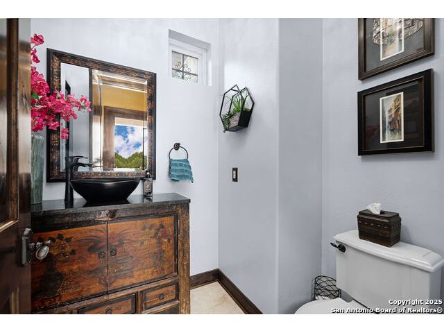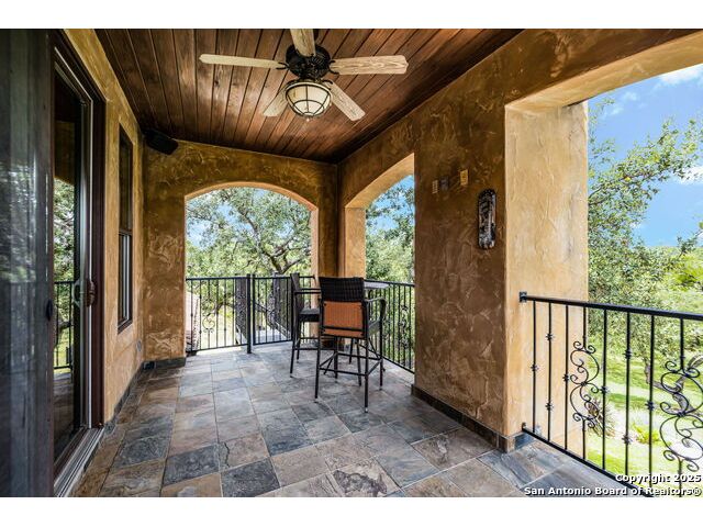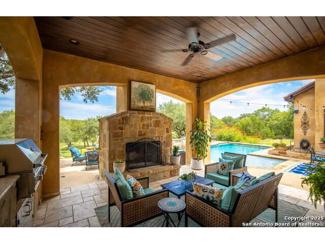Tuscan-inspired luxury in the heart of the Texas Hill Country awaits in this impeccably designed custom home in the exclusive gated community of Las Brisas at Canyon Lake. Set on 1.4 beautifully landscaped, park-like acres with stunning hill country views and private access to Tom Creek, this stone-and-stucco masterpiece features an exterior hand-troweled pulverized granite finish that never needs painting. Enjoy kayaking, hiking, or simply relaxing by the fire pit under starry skies, with easy walks to the community nature area to the left of the property and Canyon Lake cove to the right. Indoors, discover timeless craftsmanship with hand-troweled walls in the living, dining, and master suite, glazed finishes, and an impressive foyer ceiling artwork feature. Entertain effortlessly with an open-concept great room filled with large picture windows framing the breathtaking views, a gourmet chef's kitchen with Thermador dual-fuel range (6 gas burners, 2 electric ovens, griddle), a plumbed Miele coffee maker, and custom knotty alder cabinetry designed for ultimate functionality. A large butler pantry/laundry room, utility closet with electronic storage, and thoughtful custom shelving add practical elegance. Music lovers will appreciate the 8-zone built-in speaker system throughout the home, controlled by HoloWhas, while the upstairs game room impresses with a full wet bar (kegerator, sink, beverage refrigerator), surround-sound readiness, custom shades, and balcony access with panoramic hill country views. Outdoor living shines with a Cody Pool featuring remote-controlled waterfall, lighting, and cleaner, an outdoor wood-burning fireplace with gas option, gas grill and burner, outdoor spiral staircase, and three patio areas including one covered. The oversized 3-car garage features epoxy flooring and Aladdin app-controlled access for the large door. The primary suite is a luxurious retreat with hardwood floors, spa-like bath, custom closet with cabinetry and a "closet within a closet" design, private access to an office/multi-purpose room perfect as an exercise space or studio, and ceiling fans for comfort. Additional features include travertine tile throughout the downstairs, hardwood floors in upstairs rooms and stairs, a wheelchair-accessible downstairs guest suite, family tree mural on the upstairs landing, programmable front entry and eaves lighting via the Lutron app, Hydrawise app-controlled sprinkler system, Emtek door handles with bolt locks on backyard doors, custom shades in all bedrooms and the upstairs game room, a water softener system, and exceptional sound insulation for quiet, peaceful living. Residents of Las Brisas enjoy unmatched amenities, including a waterfront community park and infinity-edge pool overlooking the turquoise lake, a pavilion with grill, fire pit, waterfalls along Tom Creek, miles of hiking and ATV trails, and a private nature preserve. All this is conveniently located on Canyon Lake's south shore for easy access to Gruene, Wimberley, Blanco, New Braunfels, San Marcos, Hill Country wineries, shopping, dining, music venues, and top medical facilities. Experience refined Hill Country living with authentic Tuscan flair in this move-in-ready masterpiece. Schedule your private tour today.