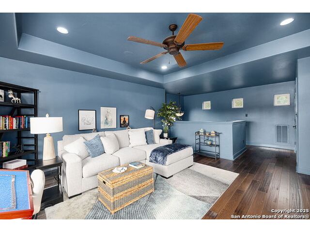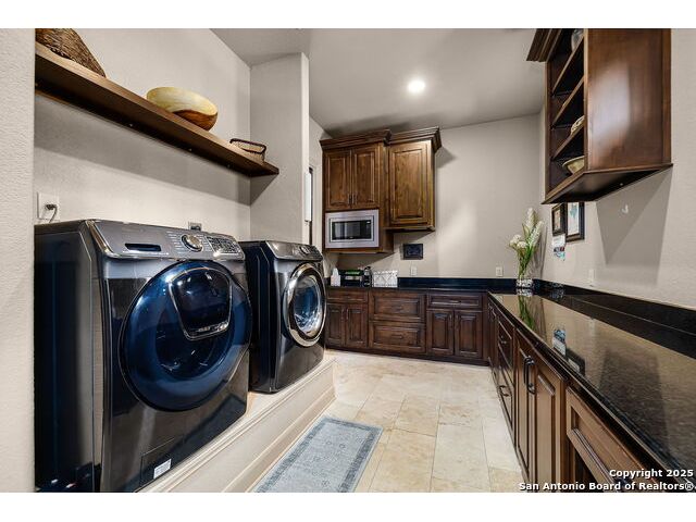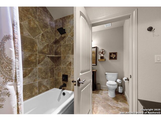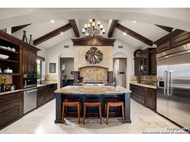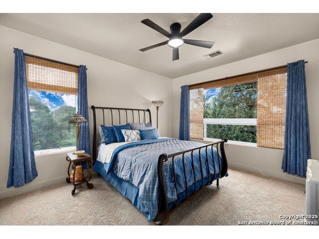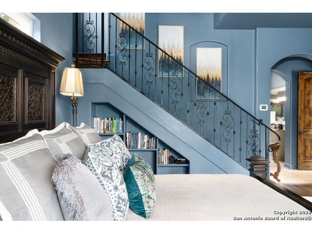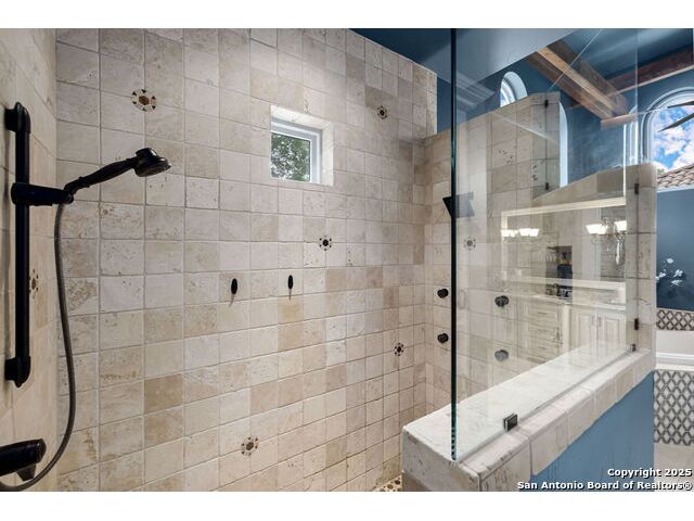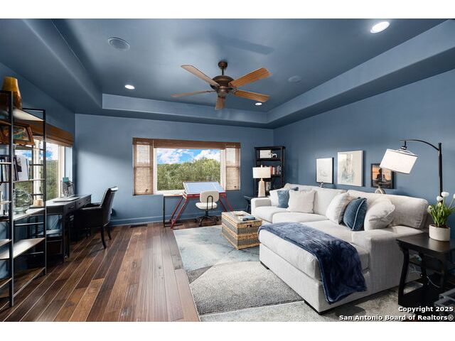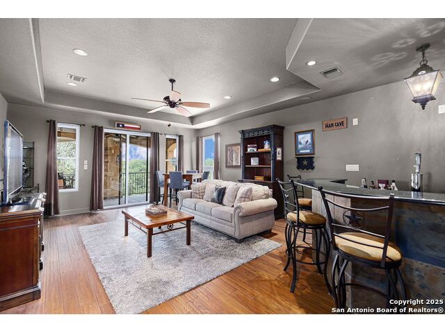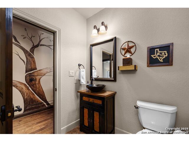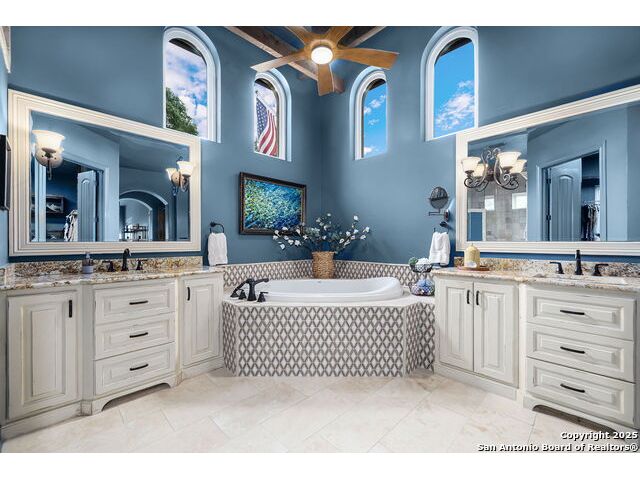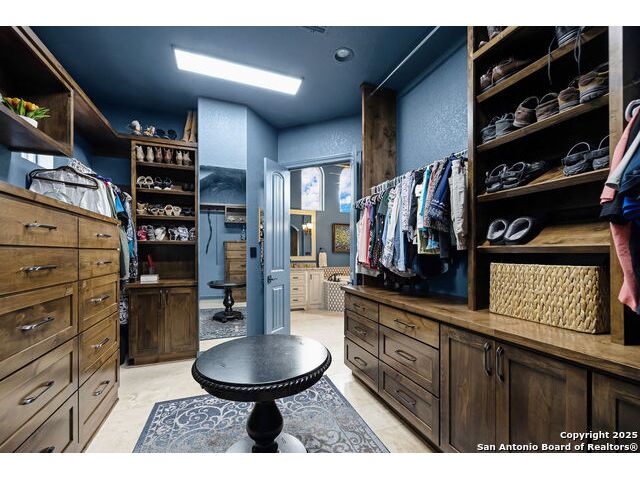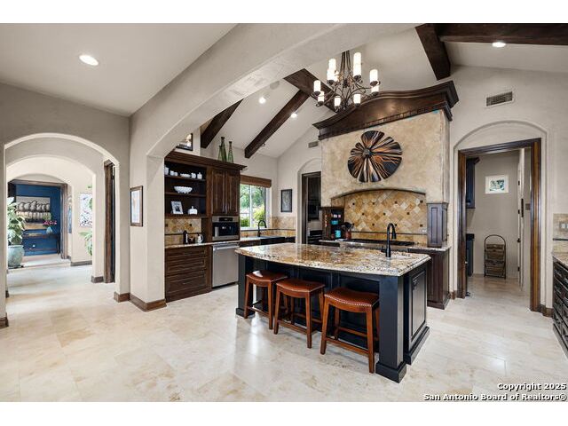 Tuscan-inspired luxury in the heart of the Texas Hill Country awaits in this impeccably designed custom home in the exclusive gated community of Las Brisas at Canyon Lake. Set on 1.4 beautifully landscaped, park-like acres with stunning hill country views and private access to Tom Creek, this stone-and-stucco masterpiece features an exterior hand-troweled pulverized granite finish that never needs painting. Enjoy kayaking, hiking, or simply relaxing by the fire pit under starry skies, with easy walks to the community nature area to the left of the property and Canyon Lake cove to the right. Indoors, discover timeless craftsmanship with hand-troweled walls in the living, dining, and master suite, glazed finishes, and an impressive foyer ceiling artwork feature. Entertain effortlessly with an open-concept great room filled with large picture windows framing the breathtaking views, a gourmet chef's kitchen with Thermador dual-fuel range (6 gas burners, 2 electric ovens, griddle), a plumbed Miele coffee maker, and custom knotty alder cabinetry designed for ultimate functionality. A large butler pantry/laundry room, utility closet with electronic storage, and thoughtful custom shelving add practical elegance. Music lovers will appreciate the 8-zone built-in speaker system throughout the home, controlled by HoloWhas, while the upstairs game room impresses with a full wet bar (kegerator, sink, beverage refrigerator), surround-sound readiness, custom shades, and balcony access with panoramic hill country views. Outdoor living shines with a Cody Pool featuring remote-controlled waterfall, lighting, and cleaner, an outdoor wood-burning fireplace with gas option, gas grill and burner, outdoor spiral staircase, and three patio areas including one covered. The oversized 3-car garage features epoxy flooring and Aladdin app-controlled access for the large door. The primary suite is a luxurious retreat with hardwood floors, spa-like bath, custom closet with cabinetry and a "closet within a closet" design, private access to an office/multi-purpose room perfect as an exercise space or studio, and ceiling fans for comfort. Additional features include travertine tile throughout the downstairs, hardwood floors in upstairs rooms and stairs, a wheelchair-accessible downstairs guest suite, family tree mural on the upstairs landing, programmable front entry and eaves lighting via the Lutron app, Hydrawise app-controlled sprinkler system, Emtek door handles with bolt locks on backyard doors, custom shades in all bedrooms and the upstairs game room, a water softener system, and exceptional sound insulation for quiet, peaceful living. Residents of Las Brisas enjoy unmatched amenities, including a waterfront community park and infinity-edge pool overlooking the turquoise lake, a pavilion with grill, fire pit, waterfalls along Tom Creek, miles of hiking and ATV trails, and a private nature preserve. All this is conveniently located on Canyon Lake's south shore for easy access to Gruene, Wimberley, Blanco, New Braunfels, San Marcos, Hill Country wineries, shopping, dining, music venues, and top medical facilities. Experience refined Hill Country living with authentic Tuscan flair in this move-in-ready masterpiece. Schedule your private tour today.