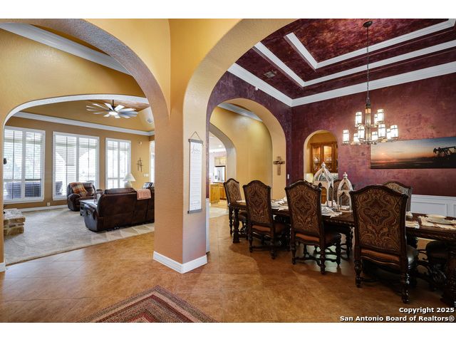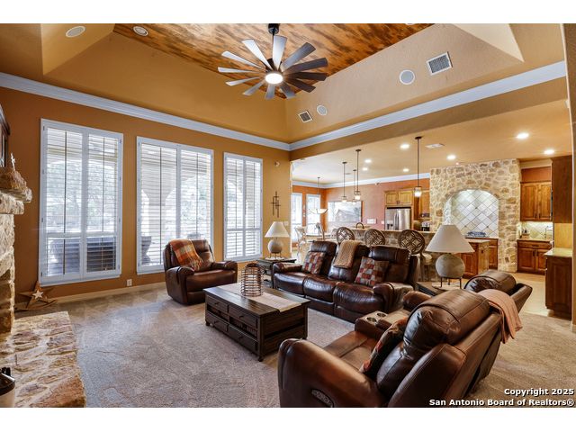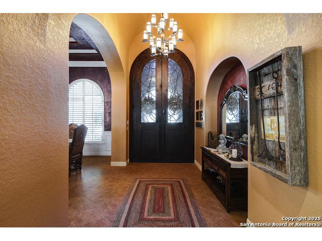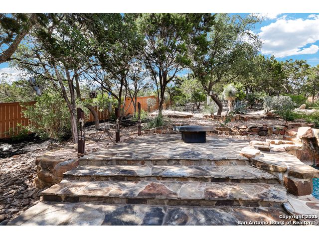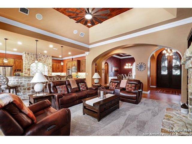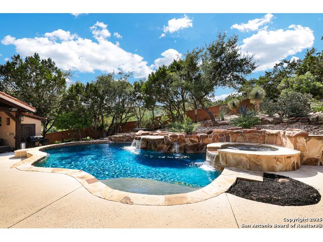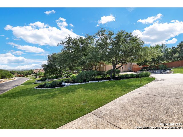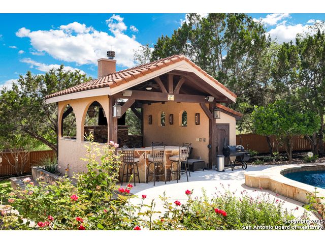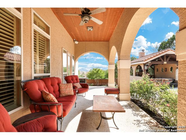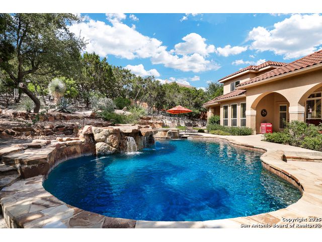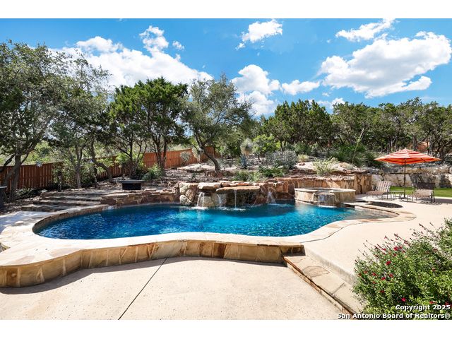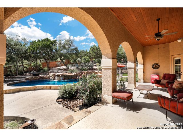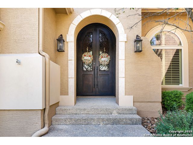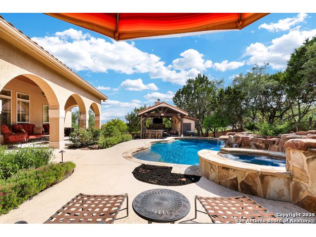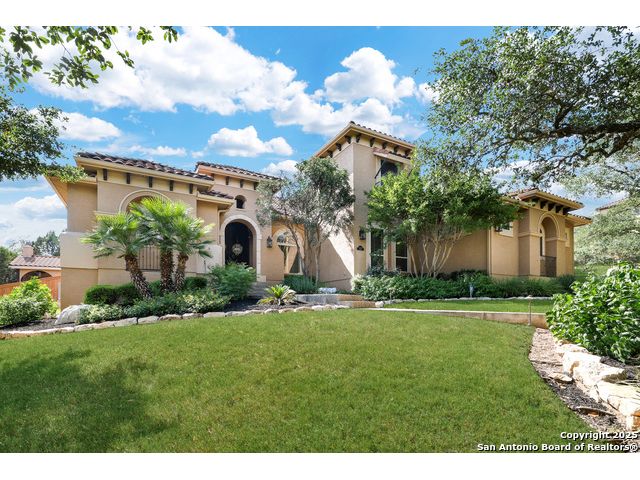 Welcome to 315 Santa Domingo - A stunning McNair Custom Mediterranean-style estate nestled in the prestigious Reserve at Sonoma Ranch. Situated on a meticulously landscaped 1.24-acre lot and backs up to over 1,300 acres of greenbelt. Enjoy your own private oasis with a resort-style pool, spacious cabana complete with a fireplace, built-in gas grill, fire pit, and ample exterior storage. Elegant exterior lighting highlights the beauty of both the front and backyards, creating an inviting ambiance day or night. Stepping through impressive 12-foot custom iron doors, you'll immediately notice the dramatic ceiling treatments, abundant natural light and an entertainer's kitchen featuring light countertops, rich Alder cabinetry, stainless steel appliances, a gas cooktop, double ovens, and a large walk-in pantry behind a custom iron door. The primary suite is a true retreat with dual walk-in closets, a luxurious garden tub, walk-through shower, and private access to the backyard sanctuary. An additional guest suite is conveniently located on the first floor, while upstairs you'll find two generously sized bedrooms, two full bathrooms, a spacious family room, and a media room-perfect for relaxing or entertaining. Homes of this caliber in such a prime location are a rare find. With easy access to I-10 and Loop 1604, top-tier shopping at La Cantera, major medical centers, and endless dining and entertainment options, this home delivers the very best of luxury living in San Antonio.