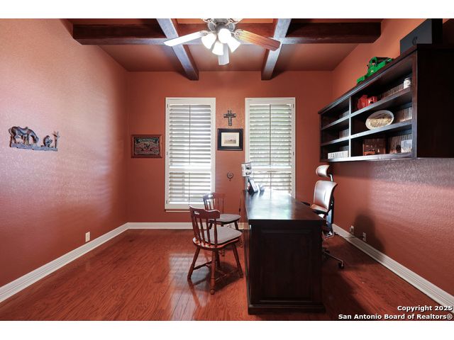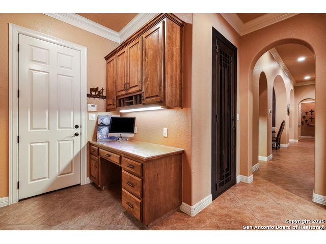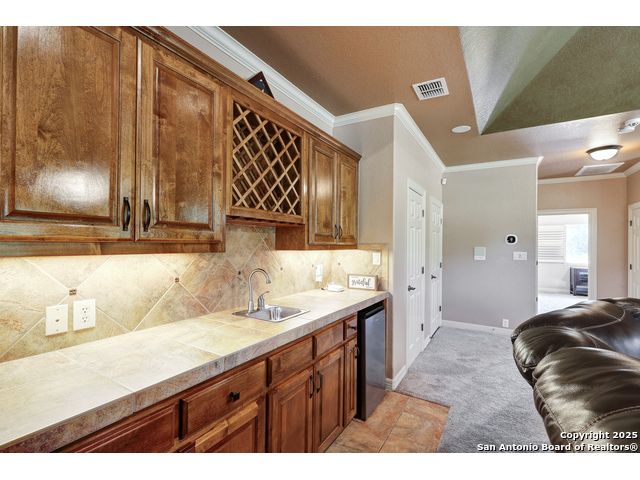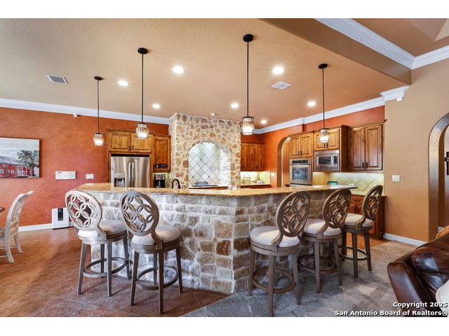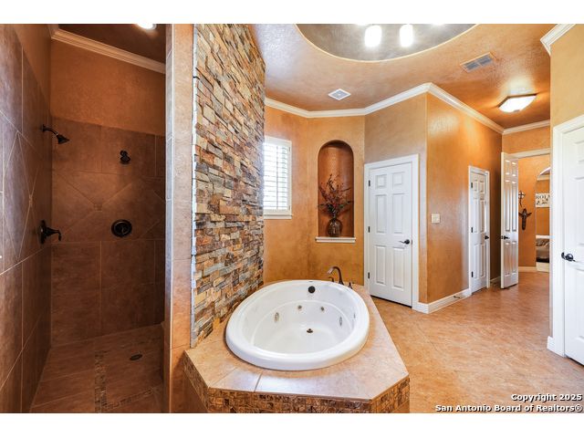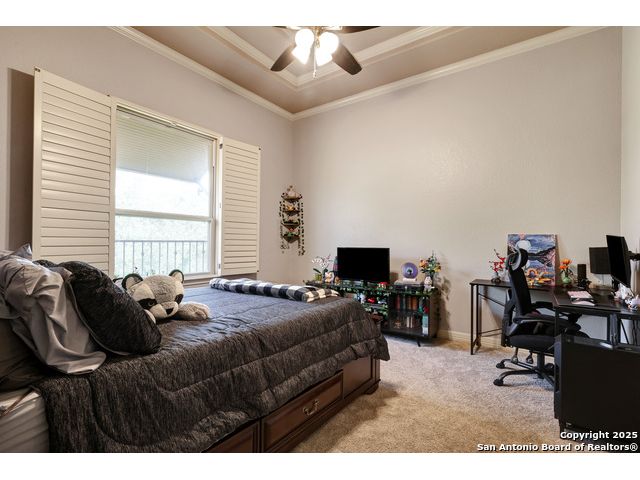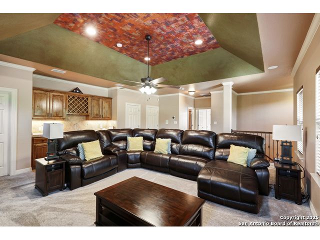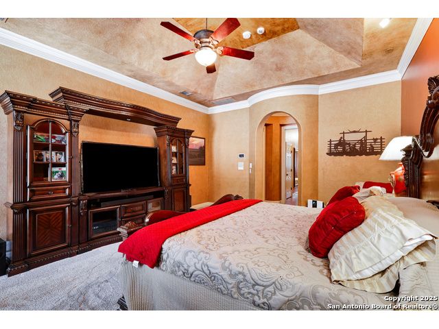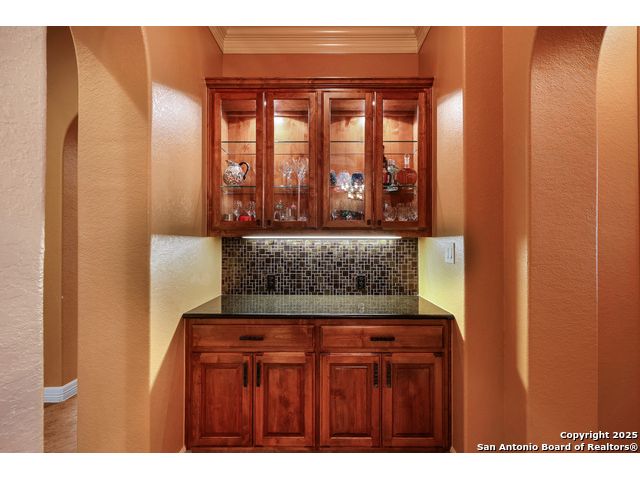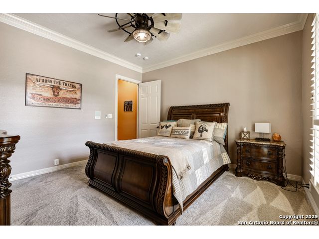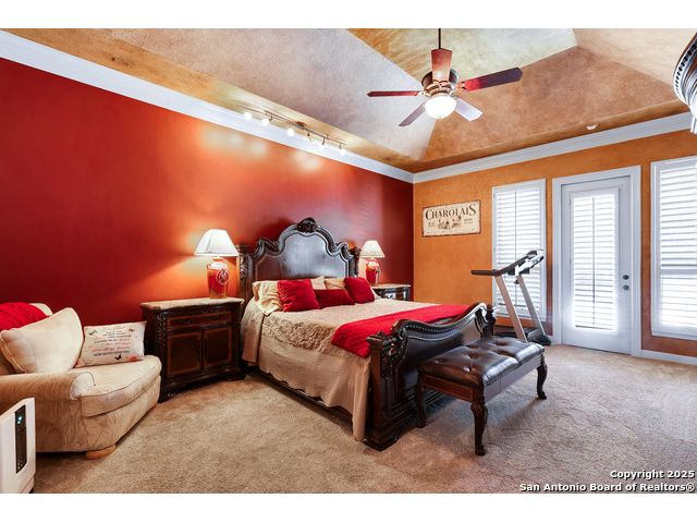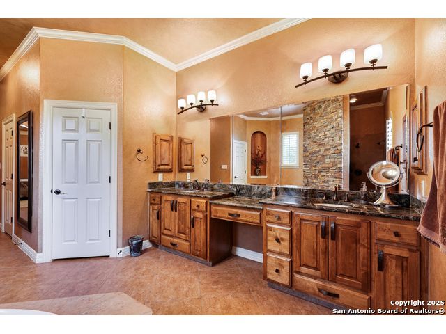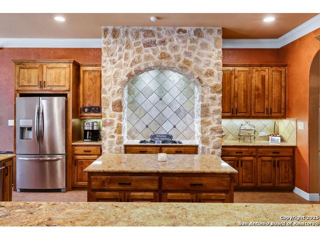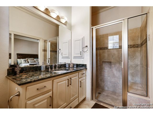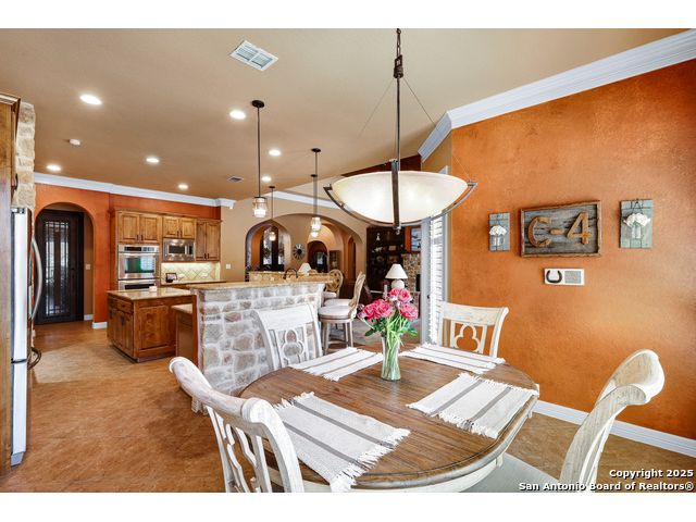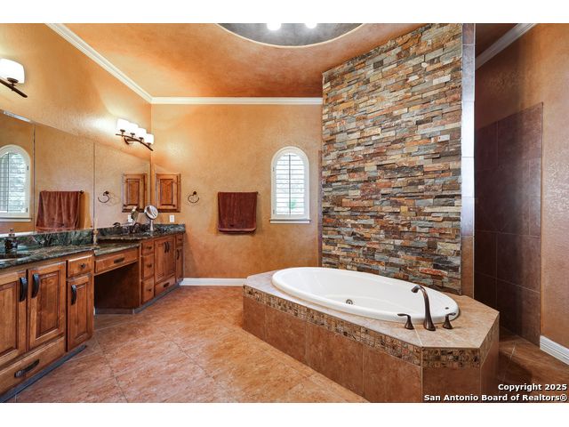 Welcome to 315 Santa Domingo - A stunning McNair Custom Mediterranean-style estate nestled in the prestigious Reserve at Sonoma Ranch. Situated on a meticulously landscaped 1.24-acre lot and backs up to over 1,300 acres of greenbelt. Enjoy your own private oasis with a resort-style pool, spacious cabana complete with a fireplace, built-in gas grill, fire pit, and ample exterior storage. Elegant exterior lighting highlights the beauty of both the front and backyards, creating an inviting ambiance day or night. Stepping through impressive 12-foot custom iron doors, you'll immediately notice the dramatic ceiling treatments, abundant natural light and an entertainer's kitchen featuring light countertops, rich Alder cabinetry, stainless steel appliances, a gas cooktop, double ovens, and a large walk-in pantry behind a custom iron door. The primary suite is a true retreat with dual walk-in closets, a luxurious garden tub, walk-through shower, and private access to the backyard sanctuary. An additional guest suite is conveniently located on the first floor, while upstairs you'll find two generously sized bedrooms, two full bathrooms, a spacious family room, and a media room-perfect for relaxing or entertaining. Homes of this caliber in such a prime location are a rare find. With easy access to I-10 and Loop 1604, top-tier shopping at La Cantera, major medical centers, and endless dining and entertainment options, this home delivers the very best of luxury living in San Antonio.