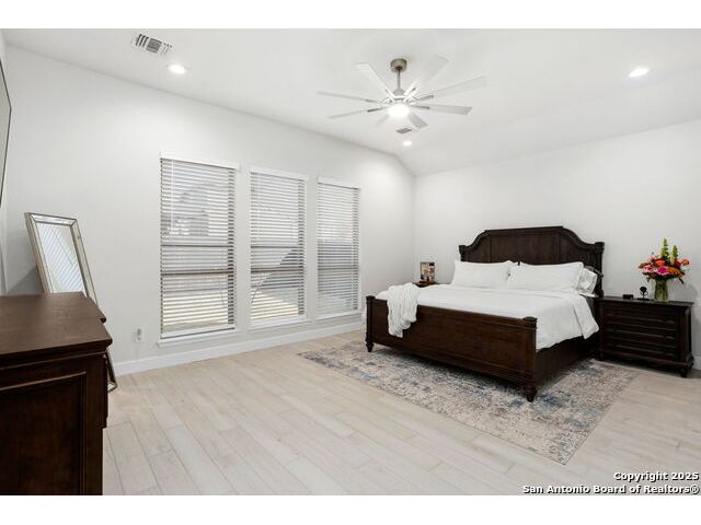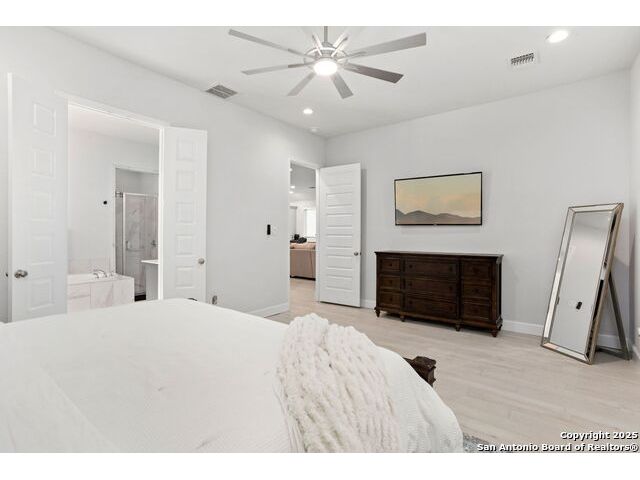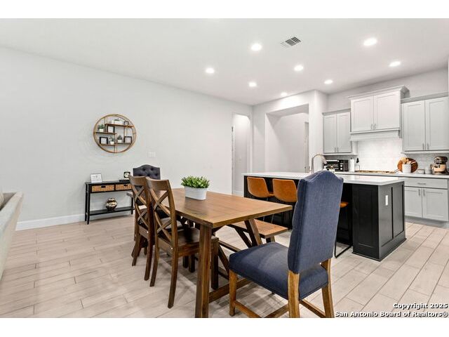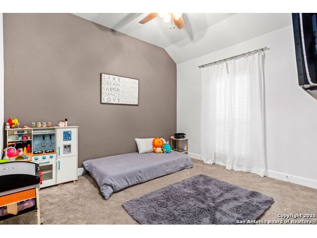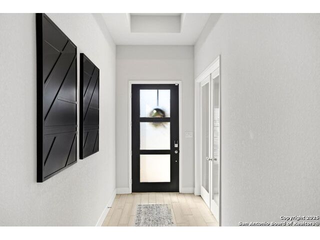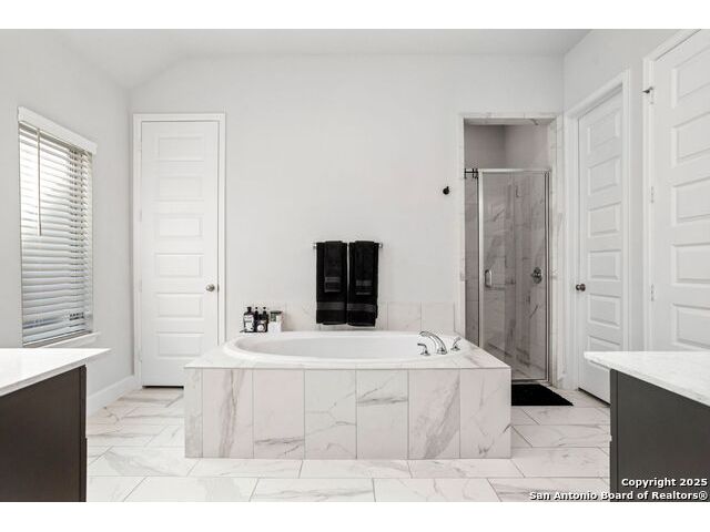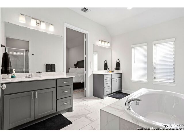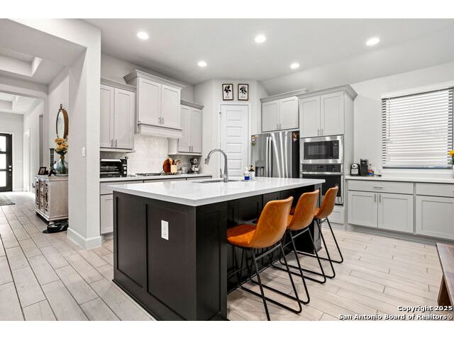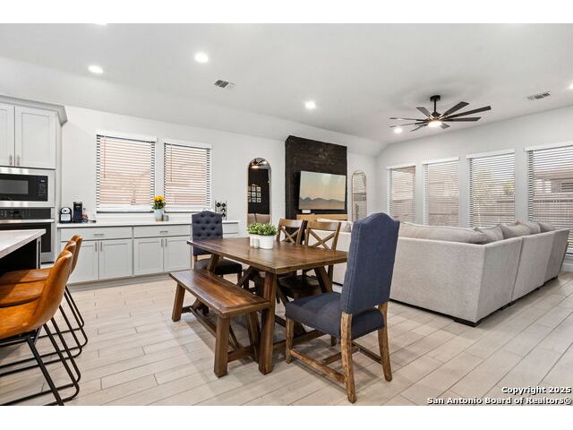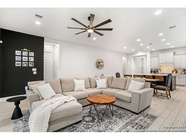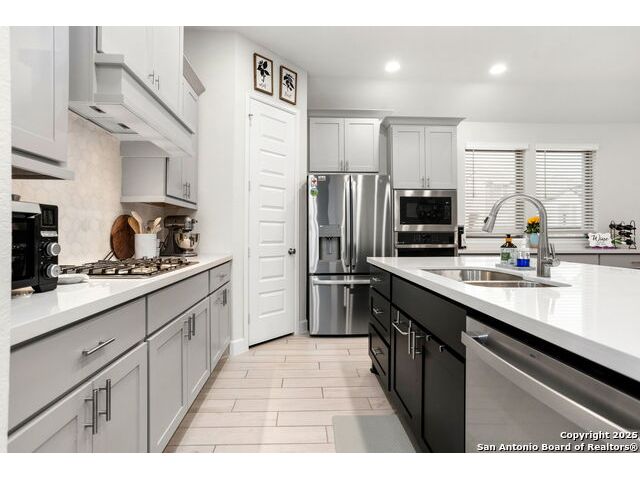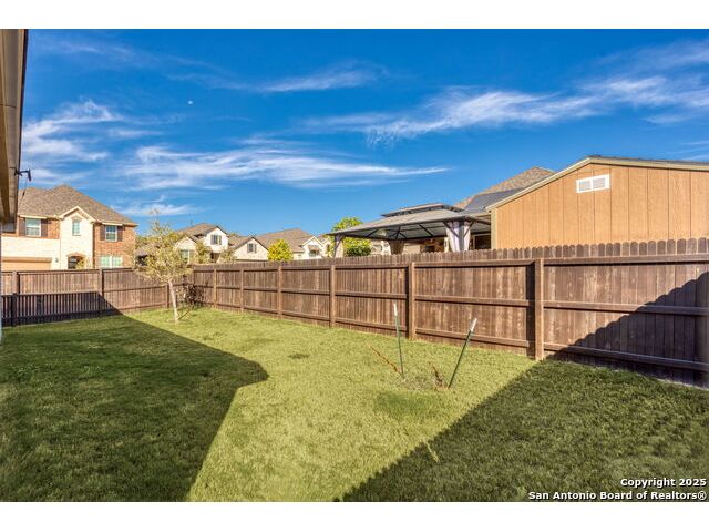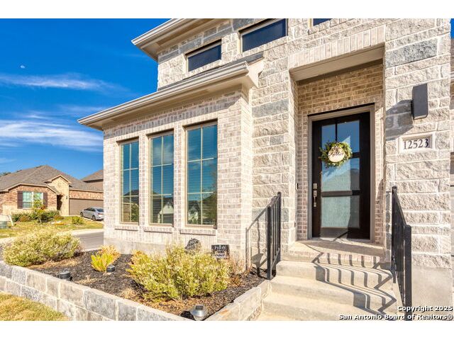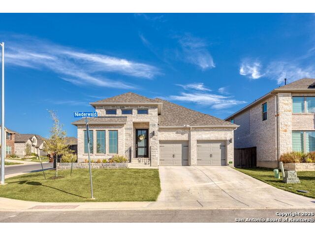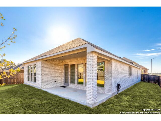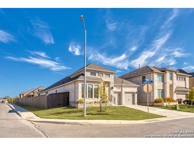 Discover your dream home nestled on a picturesque corner lot, surrounded by beautiful natural scenery. This contemporary residence features an impressive entryway with soaring 12-foot ceilings, setting the tone for a light-filled and inviting atmosphere. Enter into a stylish home office adorned with elegant French doors, perfect for remote work or study. The heart of the home, the dreamy open kitchen, boasts generous counter space, a corner walk-in pantry, and a spacious island with built-in seating-ideal for gatherings and entertaining. The dining area seamlessly flows into the open family room, bathed in natural light, and anchored by a cozy electric fireplace. Gorgeous tile flooring enhances the kitchen, living area, and bathrooms, combining beauty with durability. Retreat to the primary suite, where luxury awaits. It features dual vanities, a relaxing garden tub, a separate glass-enclosed shower, and two expansive walk-in closets in the primary bath. A guest suite with a private bath layout, offering comfort and privacy for visitors. Enter outside to your covered backyard patio, a perfect spot for morning coffee or evening relaxation. Conveniently located just 3 miles off Loop 1604, Bison Ridge community provides easy access to nearby shopping, dining, and entertainment, as well as a short drive to Joint Base San Antonio Lackland Air Force Base. Enjoy a vibrant community lifestyle with amenities that include a playground, sparkling pool, and pavilion. This home is designed to enhance your living experience-don't miss the chance to make it yours!
