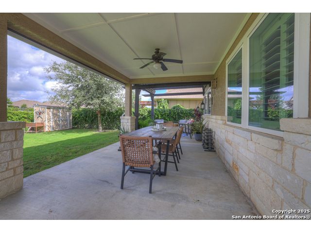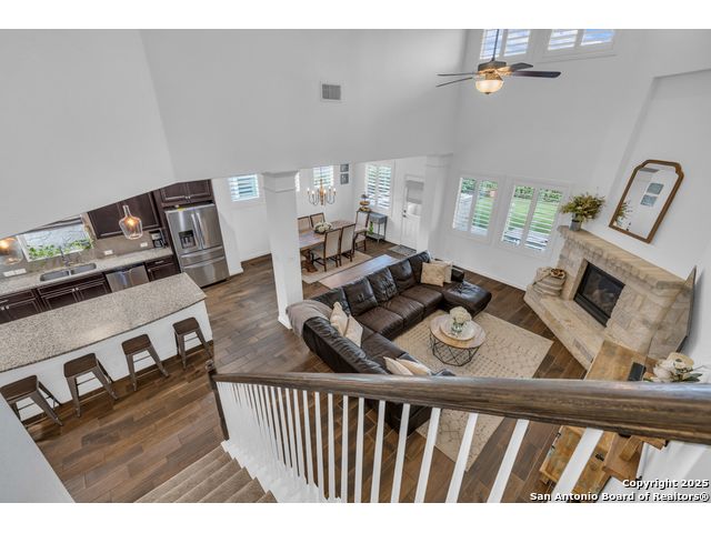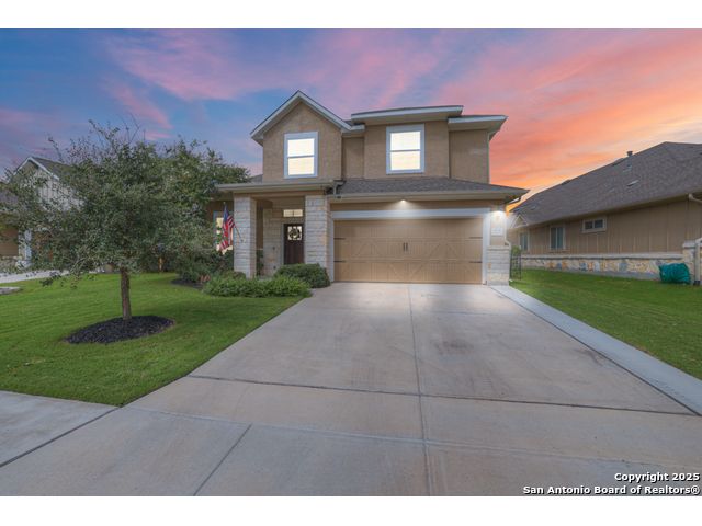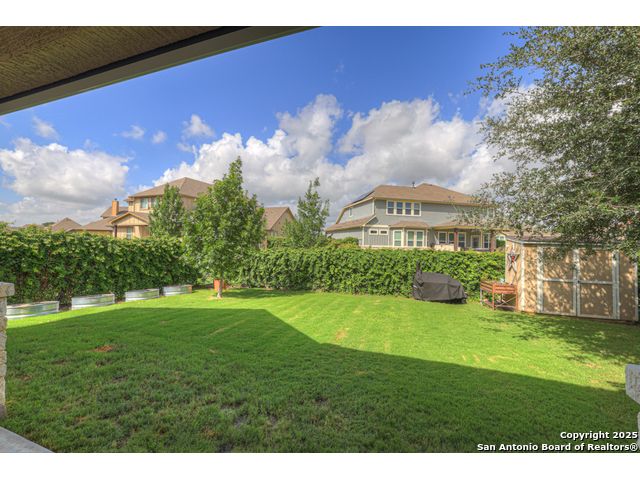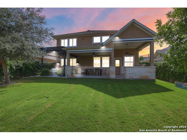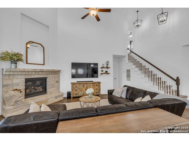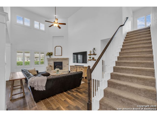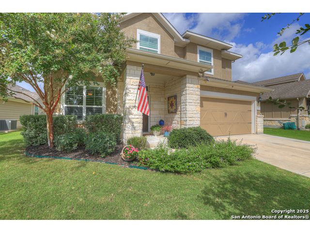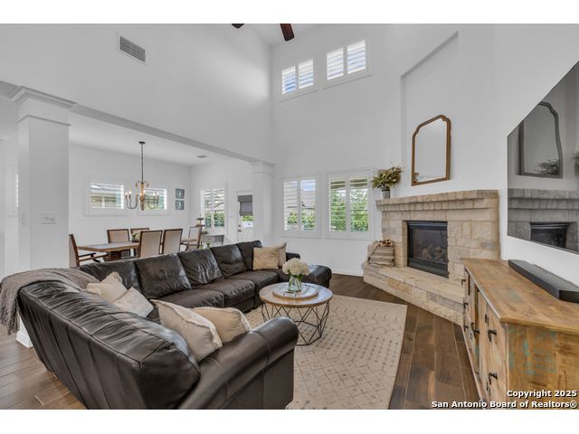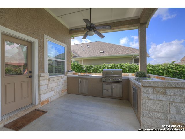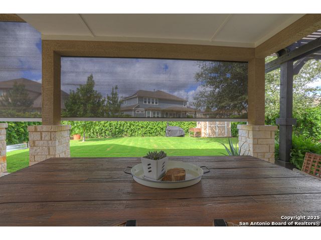 Nestled within the exclusive Crossvine community, this well maintained residence boasts an open-concept design, featuring soaring 20-foot ceilings in the family room, beautifully accentuated by a striking stone fireplace. The kitchen is both stylish and functional, with granite countertops, stainless steel appliances, a gas stove, and a generously sized island that seamlessly flows into the living area, making it an ideal space for entertaining. The main level is home to a spacious owner's suite, offering ultimate comfort with a spa-like bath, a walk-in shower, and an expansive closet. A dedicated home office, with a custom barn door entrance, provides the perfect balance of privacy and style for work or study. Additionally, a well-appointed mud room ensures convenience and organization upon entering the home. Upstairs, three generously proportioned bedrooms and a versatile game room await. Throughout the home, custom plantation shutters add a touch of refined elegance, complementing the home's timeless design. Step outside to an entertainer's paradise, where an extended covered patio includes a fully equipped outdoor kitchen-complete with a gas grill, sink, and built-in cooler. Enhanced landscaping ensures privacy, while a covered pergola and remote-controlled sunshades elevate the outdoor experience. As a resident of Crossvine, you'll enjoy access to an array of world-class amenities, including a resort-style pool, a sophisticated events pavilion, and a multipurpose outdoor amphitheater. The community also features a meticulously planned hike and bike trail system, community greenbelts & open fields, and serene pocket parks. For fitness and wellness enthusiasts, there is an exercise course and multiple tranquil ponds & water features. Residents also have the pleasure of enjoying lending libraries and easy access to the City of Schertz Heritage Oaks Park. The future Town Center will offer even more convenience and luxury. This master-planned community is ideally located near schools, as well as premier shopping, dining, entertainment, and Randolph Air Force Base-making it the ultimate blend of sophistication and convenience.
