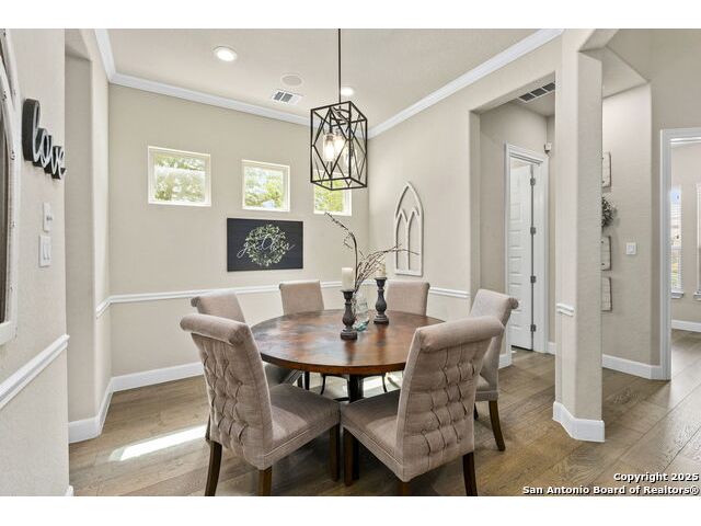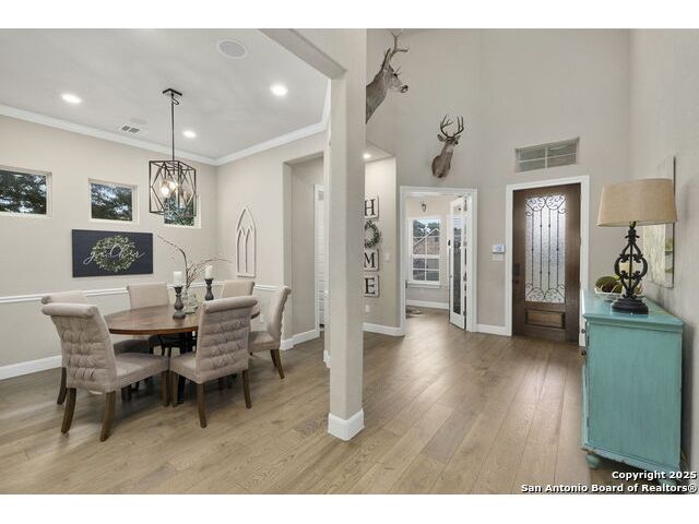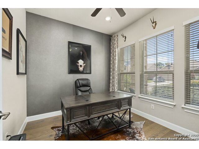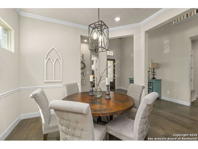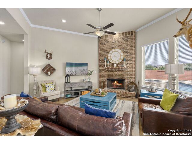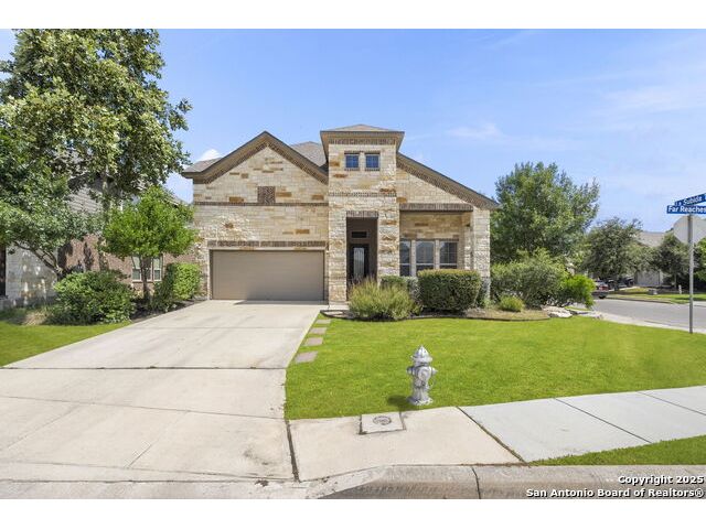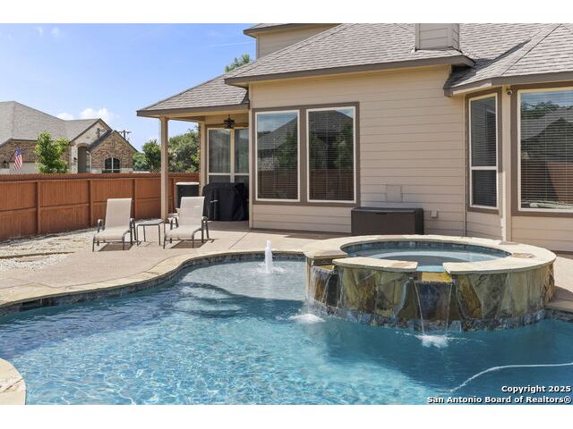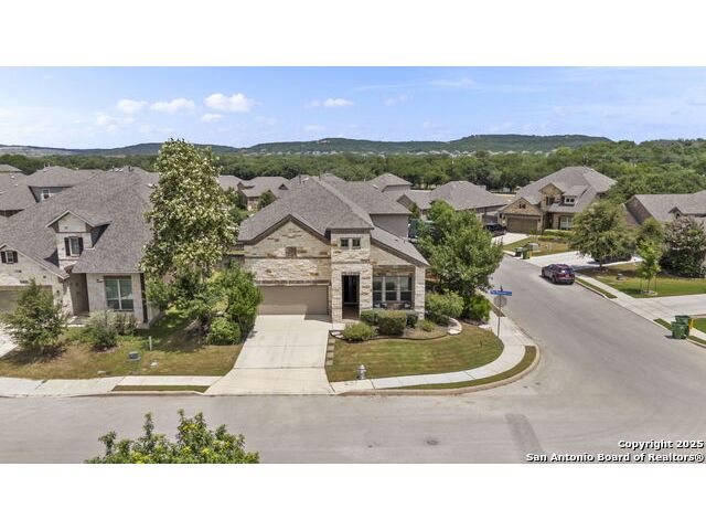 Sophistication and comfort meet in this stunning 4-bedroom, 3.5-bathroom home nestled on a beautifully landscaped corner lot in Helotes. Designed for both everyday living and elegant entertaining, the grand open layout features soaring ceilings, abundant natural light, and striking curb appeal that instantly captures attention. Inside, the spacious kitchen is a chef's dream-complete with stainless steel appliances, an inlay gas stove, built-in microwave and oven, ample cabinetry, generous countertop space, and a large island perfect for gatherings. The formal dining room and cozy living area with a fireplace make hosting effortless, while the dedicated office provides a quiet space to work from home. Retreat to the luxurious primary suite featuring a spa-like en suite bathroom with dual vanities, a soaking garden tub, and a separate walk-in shower. Upstairs, enjoy a loft area, media/movie room, and built-in desk-ideal for homework, planning, or creative projects. Step outside to your private xeriscaped oasis. A shimmering pool with a spa, spacious covered patio, and lush greenery offer a peaceful retreat or the perfect backdrop for summer get-togethers. Situated just north of Highway 16/Bandera Road, this home combines a relaxed country lifestyle with convenient access to shopping, dining, and top-rated schools in a rapidly growing area. Experience luxury living with space to unwind, entertain, and truly feel at home.