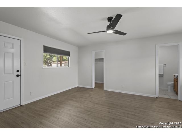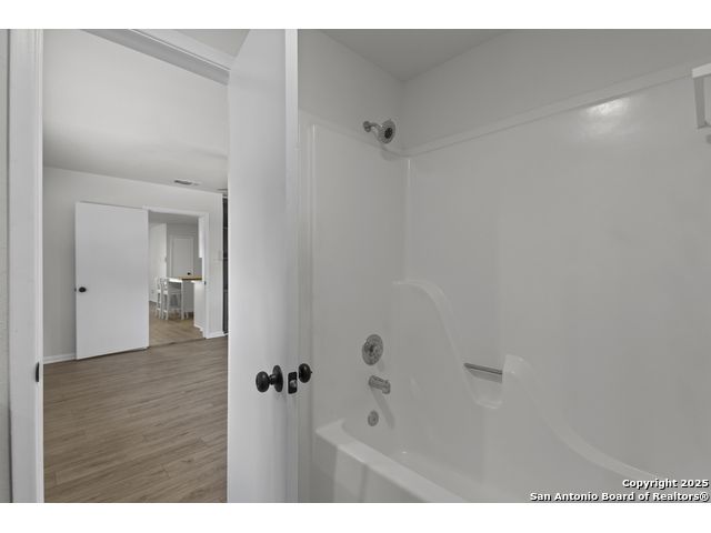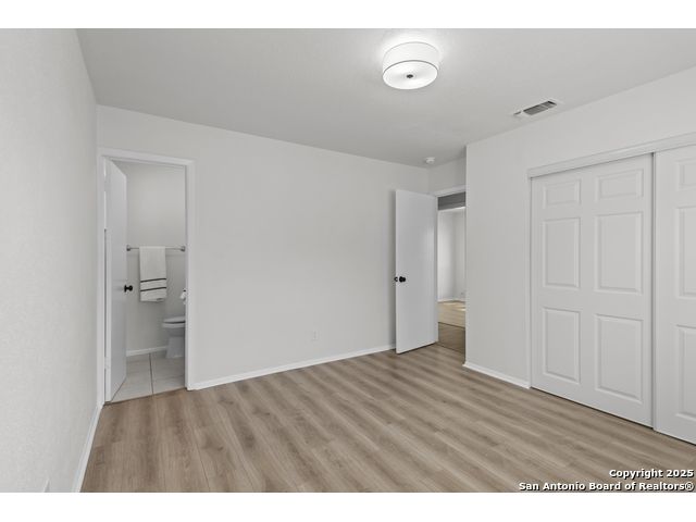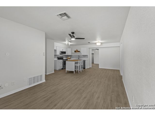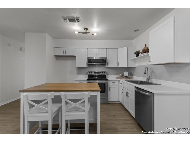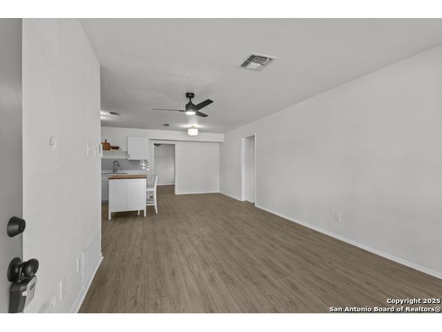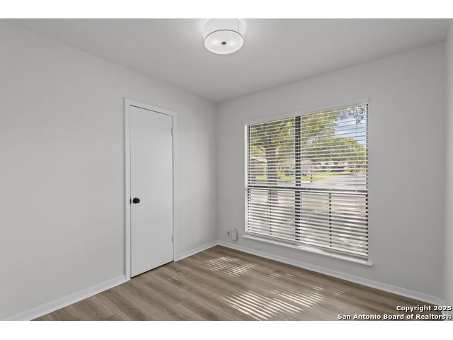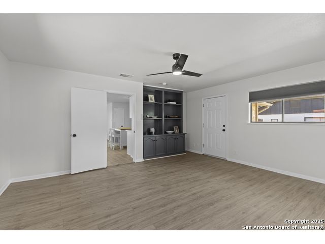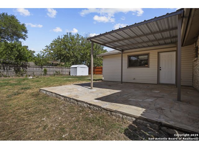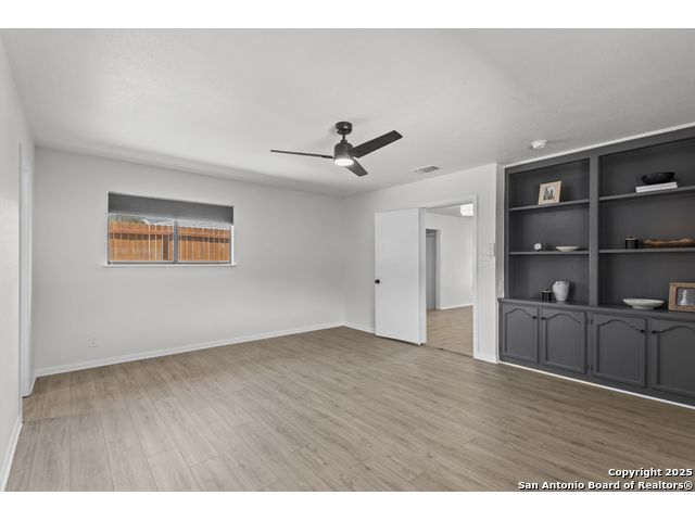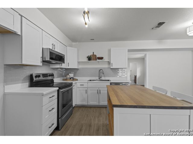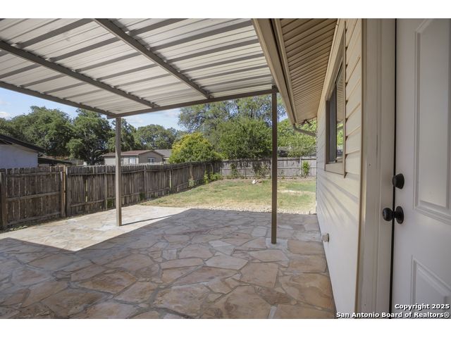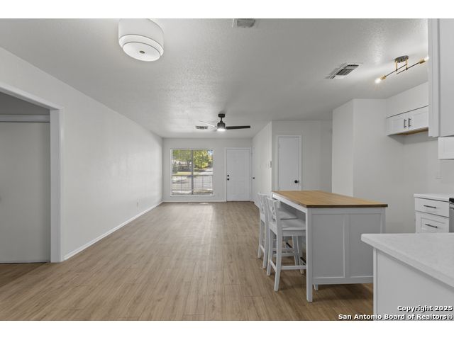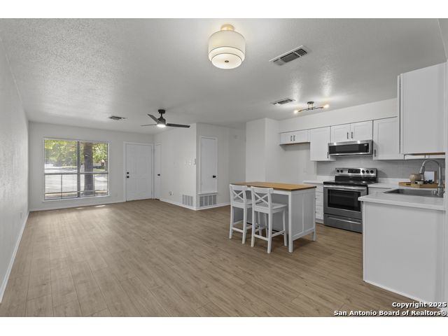 Nestled in a quiet, established pocket of San Antonio (78247), this impeccably renovated 3 bed / 2.5 bath home spans approximately 1,377 sq ft and offers exceptional turnkey appeal. An open floor plan connects an upgraded kitchen, complete with stainless steel appliances, moveable island, new faucet, and disposal to a spacious living and dining area, perfect for entertaining or family life. Luxury vinyl plank flooring extends through the hallway, living space, dining room, and primary suite. High-end finishes include all-new Moen fixtures in baths and kitchen, modern ceiling fans and light fixtures in bedrooms, fresh interior paint, upgraded door hardware, and repositioned, tamperresistant switches and outlets throughout. The master retreat features a full ensuite bath, builtin shelving, closet, and direct access to the backyard. Outdoors, enjoy a covered patio with a metal roof, mature shade trees framing the front yard, and a detached storage shed. Additional updates include a new 40gallon gas water heater, serviced AC with freshair intake, sealed roof flashings, and expanded safety features like hardwired smoke detectors and GFCI outlets. This home combines polished finishes, safety upgrades, and stylish comfort, all in a welllocated San Antonio neighborhood close to green spaces, parks, retail hubs, and major commuting routes, ideal for discerning buyers seeking movein ready character and value.