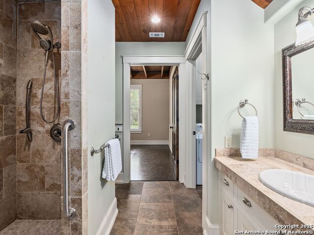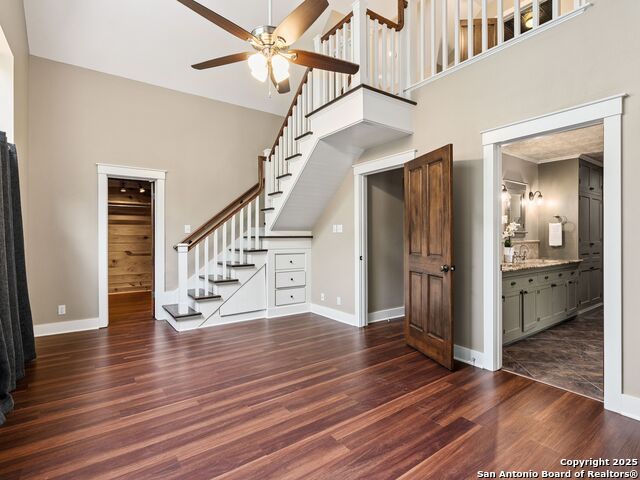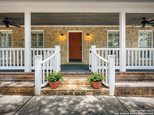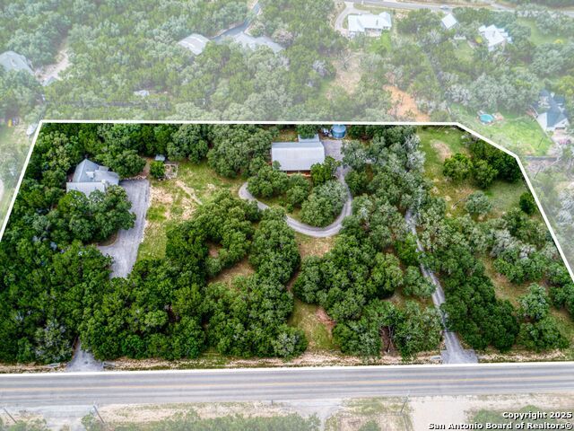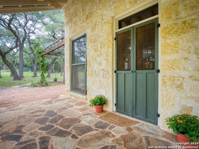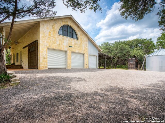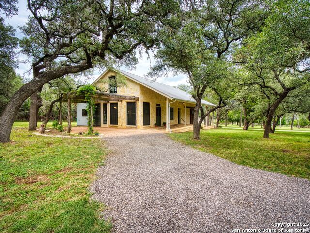 Welcome to an extraordinary Hill Country retreat where exceptional privacy, beauty and comfort come together. The main 2110 sq ft home is masterfully crafted, blending rustic charm with refined luxury. Besides the gorgeous craftsmanship, the home boasts an open floor plan, stained glass, maximum storage and cubbies, a well house, storage building and rain water catchment system. The approximately 2000 sq ft guest house, with a huge car barn (three car) provides the same scenic views for family or guests, a true treasure. The guest house has a hidden Murphy bed behind a book case, a hidden staircase also behind a bookcase that leads to a massive upstairs apartment with stunning windows and views. (A separate driveway for a possible short term rental.)