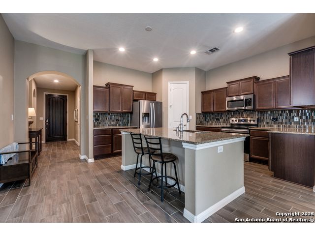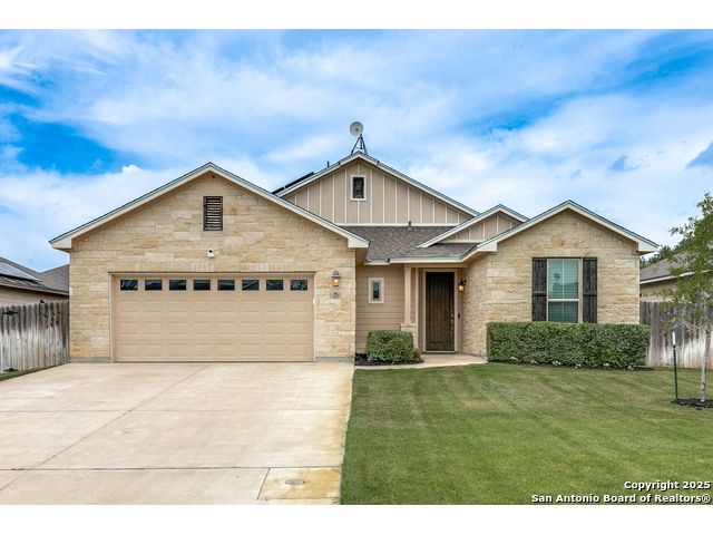 PREFERRED LENDER IS GIVING UP TO 1% IN BUYERS CLOSING COST. This = less cash to close. Welcome to this nearly new beautiful 4-bedroom, 3-bath, single-story home built in 2019, located in the highly desirable Williamsburg Meadows community in Pleasanton. Offering the comfort of an existing 10-year builder warranty, this home is move-in ready with upgrades and added value you won't find in new construction. Step through the charming arched entryway and you're greeted by a bright, open floor plan with soaring ceilings and a spacious family room. A custom TV arch with tile accents and a faux electric fireplace adds both warmth and seasonal ambiance during the fall and winter months. The large, open kitchen features a functional island-perfect for casual dining, family gatherings, or entertaining guests. The oversized master suite provides a true retreat, complete with a spacious master bath and walk-in closet for ultimate comfort and storage. Enjoy the lushly landscaped backyard and peaceful covered porch, ideal for relaxing evenings outdoors. A full sprinkler system in both front and back keeps the yard looking pristine year-round. Solar panels offer energy efficiency and help keep electric bills affordable. This family-friendly subdivision is perfect for any stage of life-first-time buyers, growing families, or retirees. It's conveniently located just a short drive to San Antonio, combining small-town charm with city access. Don't miss the opportunity to own this nearly new, move-in ready home with all the extras already in place. Schedule your showing today!