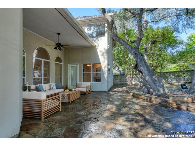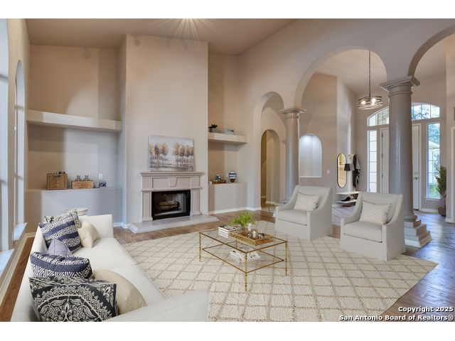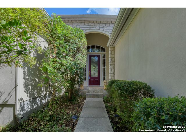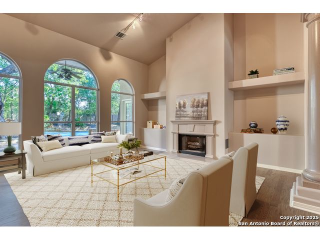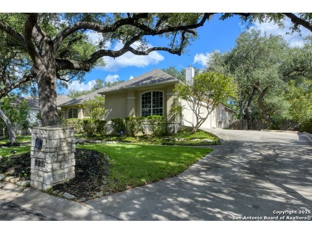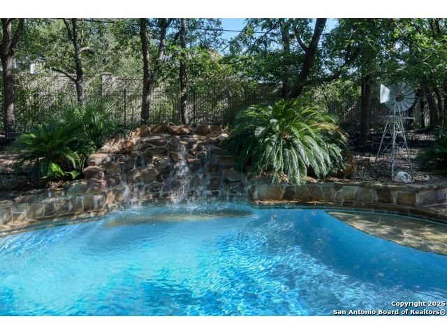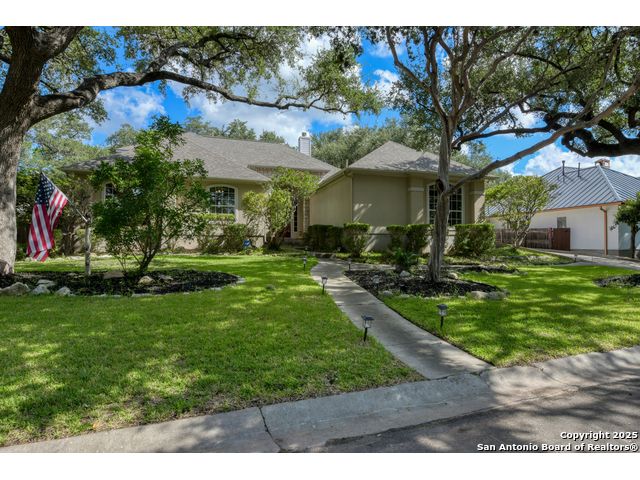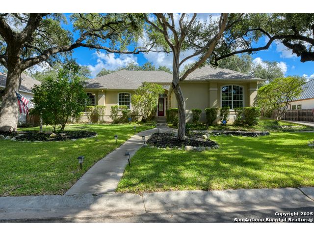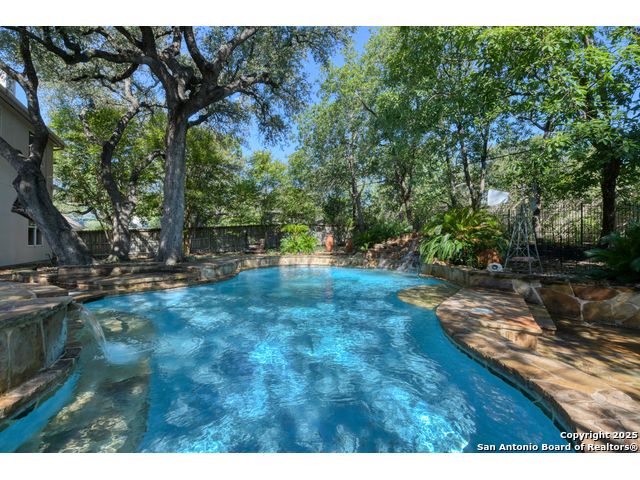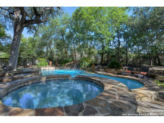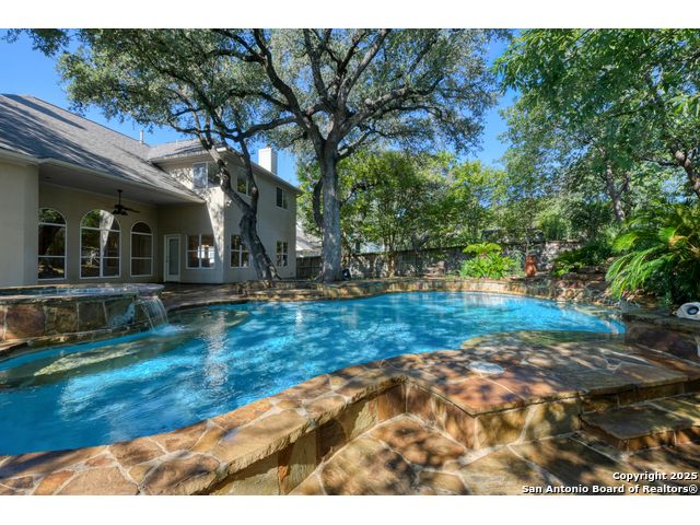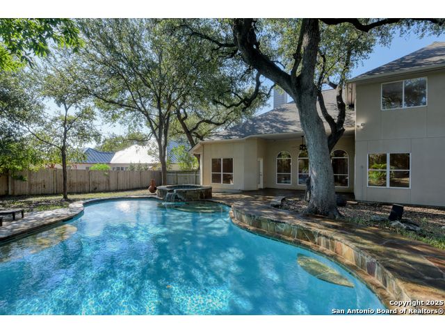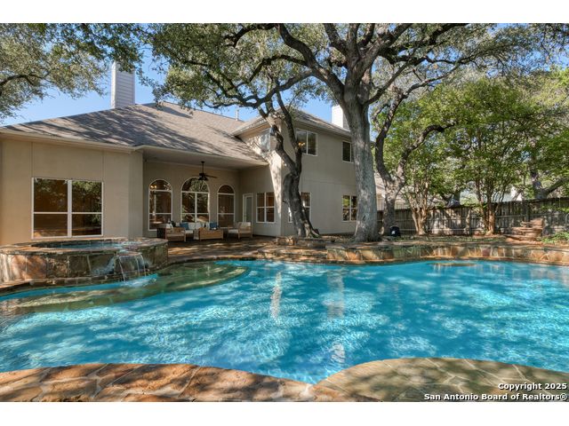 Imagine starting your day with a cup of coffee on the covered patio, the sound of water cascading from the stone waterfall into the sparkling pool and spa. Surrounded by lush greenery and mature trees, the backyard feels like your own private retreat - the perfect place to begin or end the day. From the moment you arrive, the home welcomes you with a manicured front lawn and a stucco exterior accented with stone details. The charming front porch and decorative glass door set the stage for what's inside. Step through the entry into a bright foyer with soaring ceilings, tile flooring, and elegant double glass doors that open into a versatile office with warm wood flooring and built-in cabinetry. With its closet, this space easily adapts into a fifth bedroom if needed. As you move into the heart of the home, sunlight pours through large arched windows in the living room, where soaring ceilings and striking architectural columns frame a cozy fireplace - a perfect spot to gather on cooler evenings. Just beyond, a second living area off the kitchen invites relaxation, complete with another fireplace and built-in shelving for books, photos, or decor. Morning light fills the breakfast area, where backyard views create a serene backdrop for everyday meals. The flow continues into the island kitchen, a hub designed for both cooking and conversation. With granite countertops, abundant cabinetry, a prep island, built-in oven and microwave, and a gas cooktop, it's a space ready for both weeknight dinners and weekend entertaining. Tucked away for privacy, the downstairs primary suite offers a peaceful retreat with wood flooring, a tray ceiling, oversized windows looking out to the backyard, and private outdoor access. In the spa-like bath, dual vanities, a makeup counter, a walk-in shower, and a jetted corner soaking tub create a perfect place to unwind. The large walk-in closet keeps everything neatly organized. Also downstairs, two secondary bedrooms feature large arched windows, ceiling fans, and neutral finishes, with a full bathroom nearby. Upstairs, the flexible game room awaits - a bright space with built-in cabinetry and multiple windows, ideal as a media room, playroom, or workout area. A fourth bedroom and another full bathroom with updated tilework and a walk-in shower complete the upper level. A huge attic above the 3-car garage provides excellent storage. Evenings practically beg to be spent outside, whether dining under the covered patio or lounging poolside while the sun sets behind the trees. With flagstone decking, a sparkling pool and spa, and the calming sound of the rock waterfall, the backyard is designed for both relaxation and gatherings with friends and family. Beyond the home, convenience is at your fingertips - close to endless shopping and dining options, and just minutes from two of San Antonio's largest employers, USAA and Valero. And with no HOA, you'll enjoy the freedom and flexibility to make this home truly your own. Please note: some photos have been virtually staged.