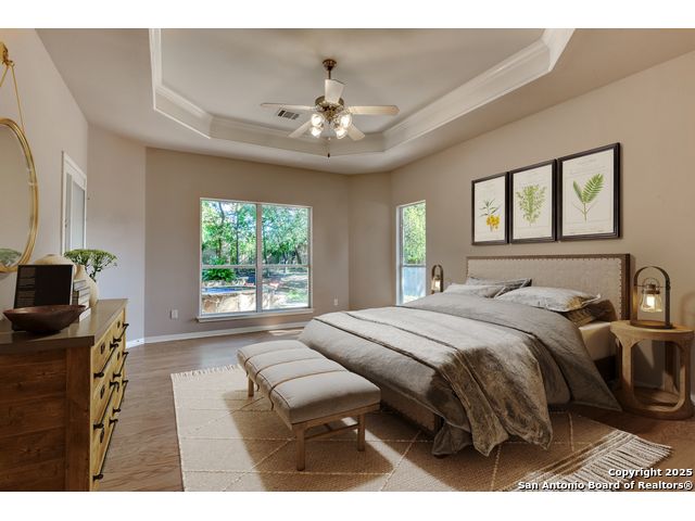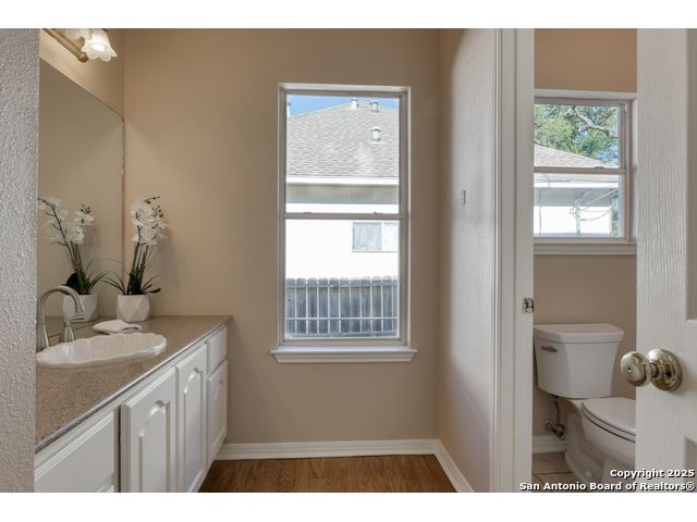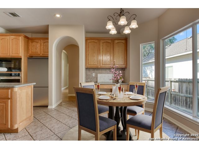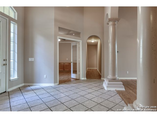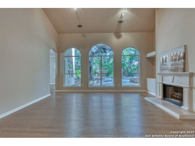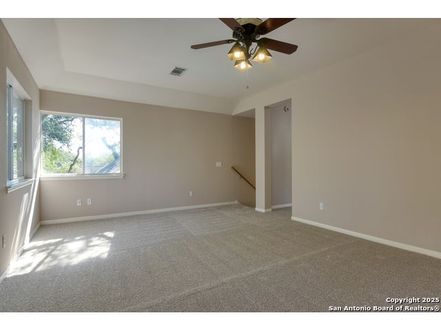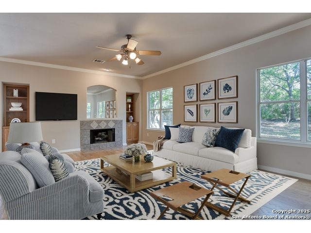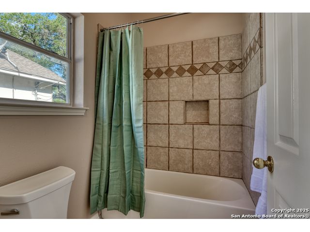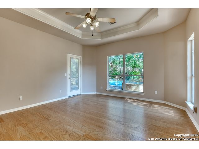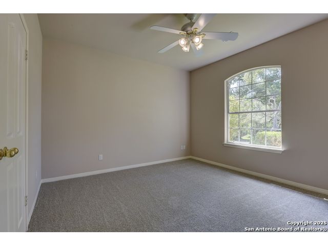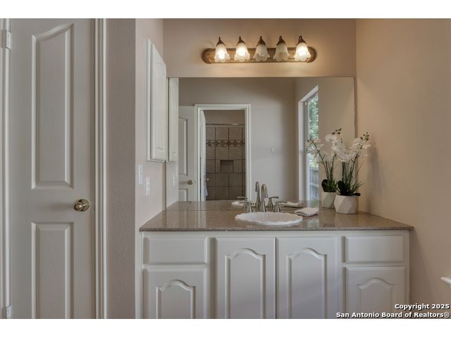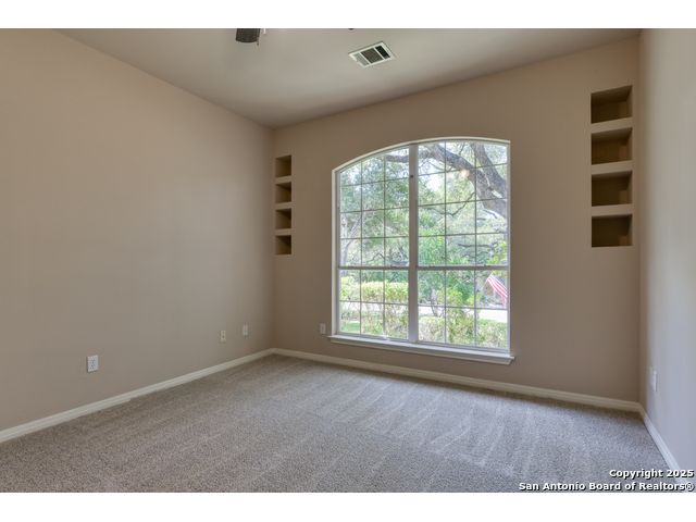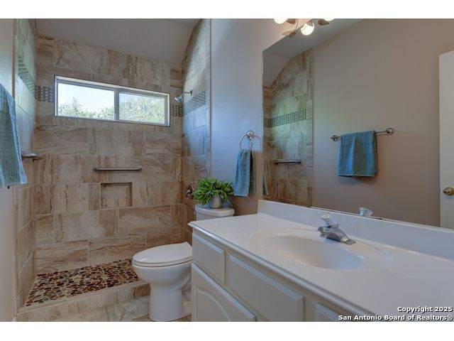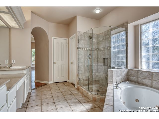 Imagine starting your day with a cup of coffee on the covered patio, the sound of water cascading from the stone waterfall into the sparkling pool and spa. Surrounded by lush greenery and mature trees, the backyard feels like your own private retreat - the perfect place to begin or end the day. From the moment you arrive, the home welcomes you with a manicured front lawn and a stucco exterior accented with stone details. The charming front porch and decorative glass door set the stage for what's inside. Step through the entry into a bright foyer with soaring ceilings, tile flooring, and elegant double glass doors that open into a versatile office with warm wood flooring and built-in cabinetry. With its closet, this space easily adapts into a fifth bedroom if needed. As you move into the heart of the home, sunlight pours through large arched windows in the living room, where soaring ceilings and striking architectural columns frame a cozy fireplace - a perfect spot to gather on cooler evenings. Just beyond, a second living area off the kitchen invites relaxation, complete with another fireplace and built-in shelving for books, photos, or decor. Morning light fills the breakfast area, where backyard views create a serene backdrop for everyday meals. The flow continues into the island kitchen, a hub designed for both cooking and conversation. With granite countertops, abundant cabinetry, a prep island, built-in oven and microwave, and a gas cooktop, it's a space ready for both weeknight dinners and weekend entertaining. Tucked away for privacy, the downstairs primary suite offers a peaceful retreat with wood flooring, a tray ceiling, oversized windows looking out to the backyard, and private outdoor access. In the spa-like bath, dual vanities, a makeup counter, a walk-in shower, and a jetted corner soaking tub create a perfect place to unwind. The large walk-in closet keeps everything neatly organized. Also downstairs, two secondary bedrooms feature large arched windows, ceiling fans, and neutral finishes, with a full bathroom nearby. Upstairs, the flexible game room awaits - a bright space with built-in cabinetry and multiple windows, ideal as a media room, playroom, or workout area. A fourth bedroom and another full bathroom with updated tilework and a walk-in shower complete the upper level. A huge attic above the 3-car garage provides excellent storage. Evenings practically beg to be spent outside, whether dining under the covered patio or lounging poolside while the sun sets behind the trees. With flagstone decking, a sparkling pool and spa, and the calming sound of the rock waterfall, the backyard is designed for both relaxation and gatherings with friends and family. Beyond the home, convenience is at your fingertips - close to endless shopping and dining options, and just minutes from two of San Antonio's largest employers, USAA and Valero. And with no HOA, you'll enjoy the freedom and flexibility to make this home truly your own. Please note: some photos have been virtually staged.