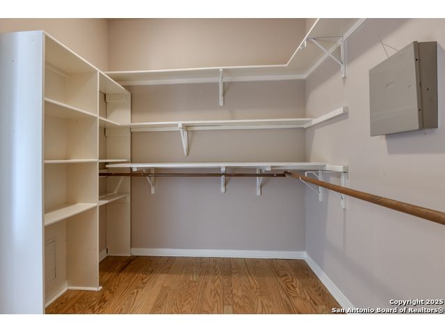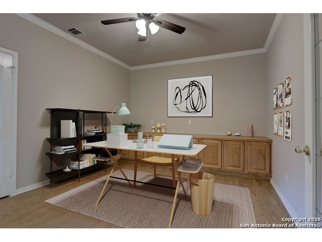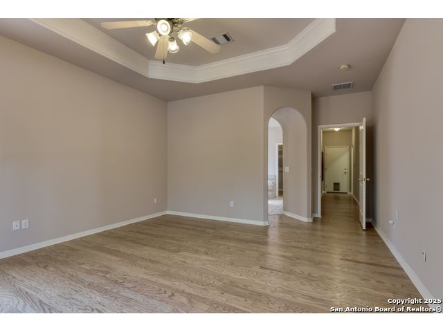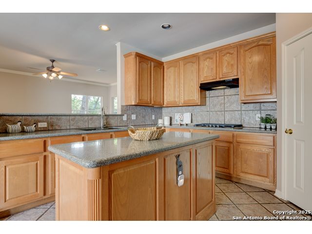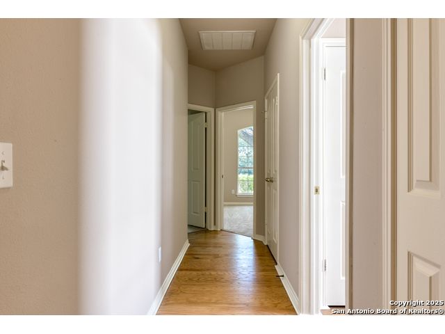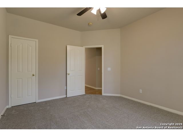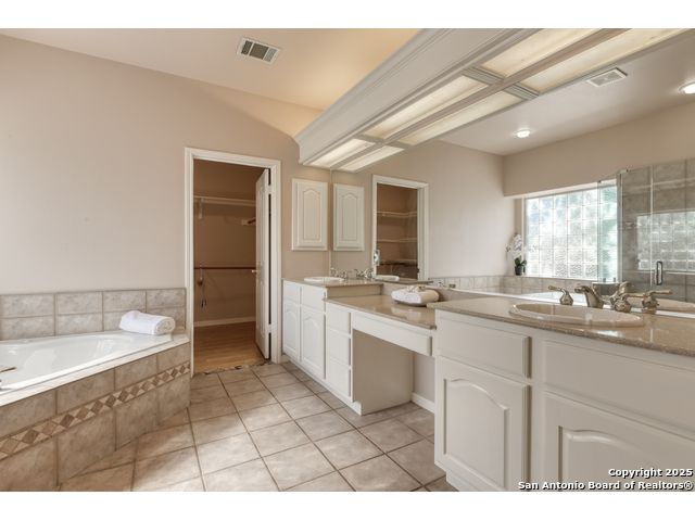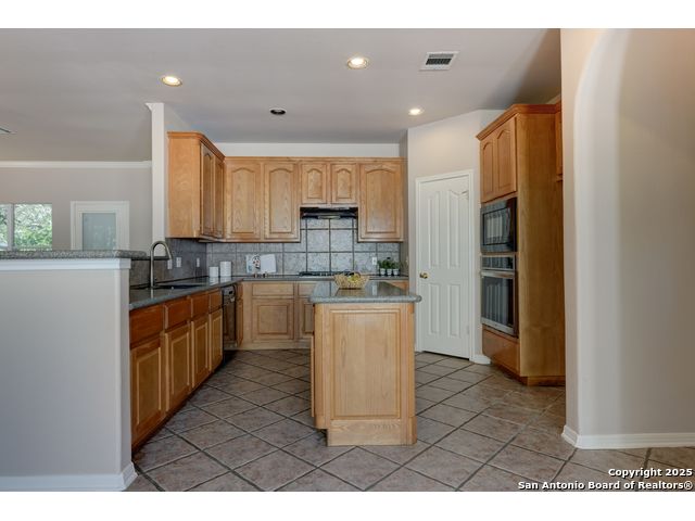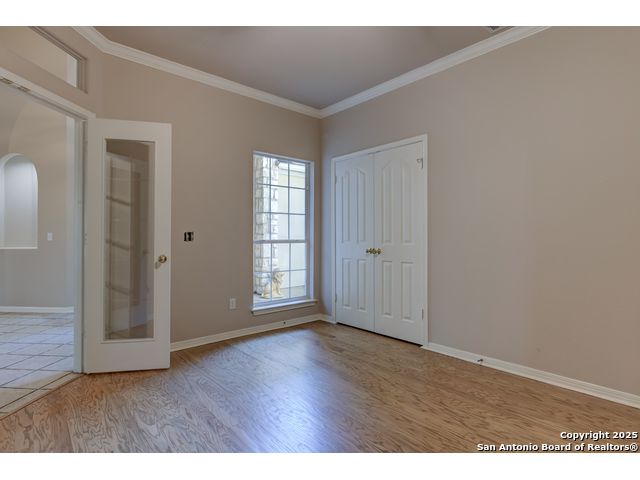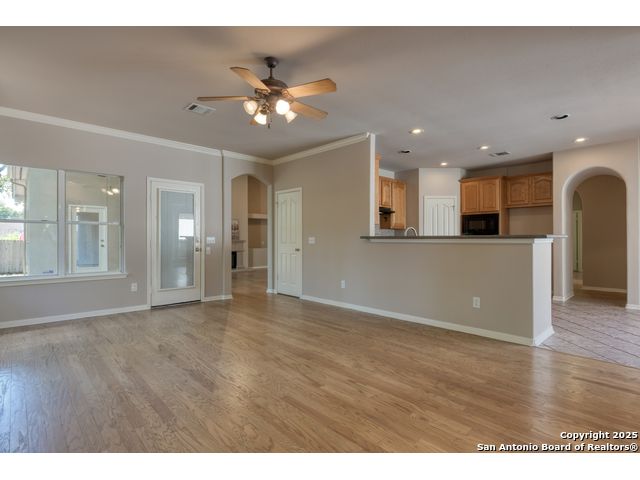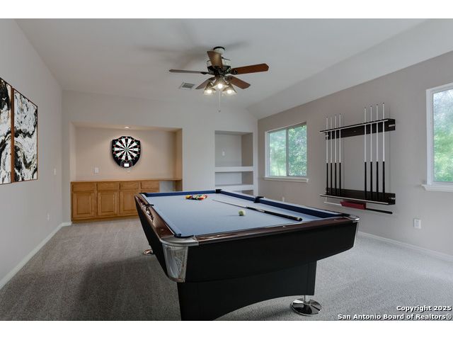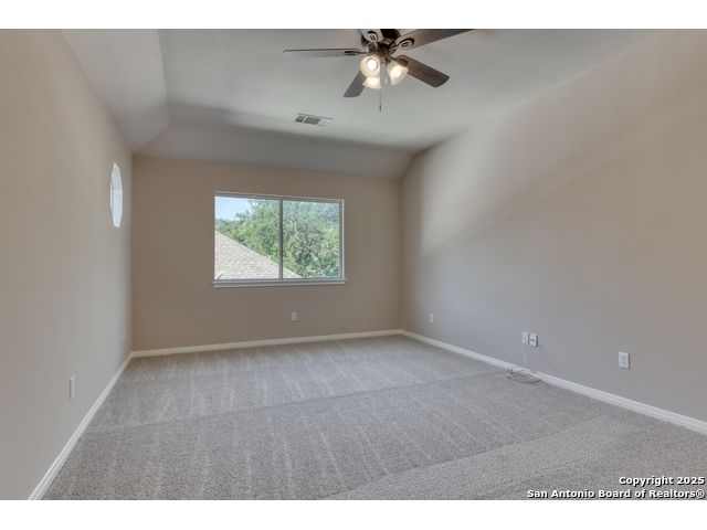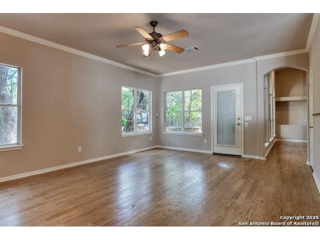 Imagine starting your day with a cup of coffee on the covered patio, the sound of water cascading from the stone waterfall into the sparkling pool and spa. Surrounded by lush greenery and mature trees, the backyard feels like your own private retreat - the perfect place to begin or end the day. From the moment you arrive, the home welcomes you with a manicured front lawn and a stucco exterior accented with stone details. The charming front porch and decorative glass door set the stage for what's inside. Step through the entry into a bright foyer with soaring ceilings, tile flooring, and elegant double glass doors that open into a versatile office with warm wood flooring and built-in cabinetry. With its closet, this space easily adapts into a fifth bedroom if needed. As you move into the heart of the home, sunlight pours through large arched windows in the living room, where soaring ceilings and striking architectural columns frame a cozy fireplace - a perfect spot to gather on cooler evenings. Just beyond, a second living area off the kitchen invites relaxation, complete with another fireplace and built-in shelving for books, photos, or decor. Morning light fills the breakfast area, where backyard views create a serene backdrop for everyday meals. The flow continues into the island kitchen, a hub designed for both cooking and conversation. With granite countertops, abundant cabinetry, a prep island, built-in oven and microwave, and a gas cooktop, it's a space ready for both weeknight dinners and weekend entertaining. Tucked away for privacy, the downstairs primary suite offers a peaceful retreat with wood flooring, a tray ceiling, oversized windows looking out to the backyard, and private outdoor access. In the spa-like bath, dual vanities, a makeup counter, a walk-in shower, and a jetted corner soaking tub create a perfect place to unwind. The large walk-in closet keeps everything neatly organized. Also downstairs, two secondary bedrooms feature large arched windows, ceiling fans, and neutral finishes, with a full bathroom nearby. Upstairs, the flexible game room awaits - a bright space with built-in cabinetry and multiple windows, ideal as a media room, playroom, or workout area. A fourth bedroom and another full bathroom with updated tilework and a walk-in shower complete the upper level. A huge attic above the 3-car garage provides excellent storage. Evenings practically beg to be spent outside, whether dining under the covered patio or lounging poolside while the sun sets behind the trees. With flagstone decking, a sparkling pool and spa, and the calming sound of the rock waterfall, the backyard is designed for both relaxation and gatherings with friends and family. Beyond the home, convenience is at your fingertips - close to endless shopping and dining options, and just minutes from two of San Antonio's largest employers, USAA and Valero. And with no HOA, you'll enjoy the freedom and flexibility to make this home truly your own. Please note: some photos have been virtually staged.