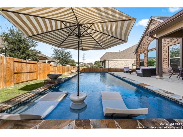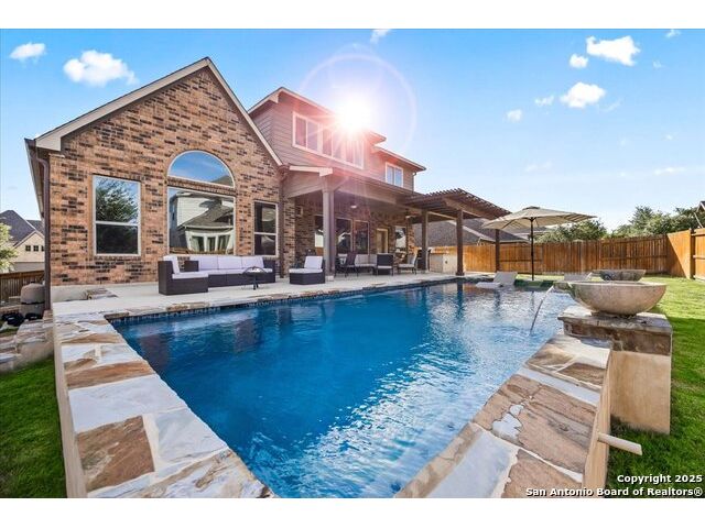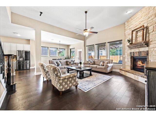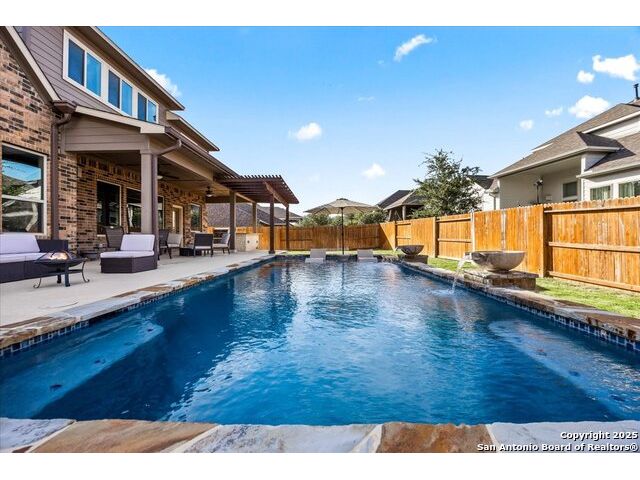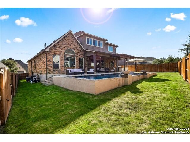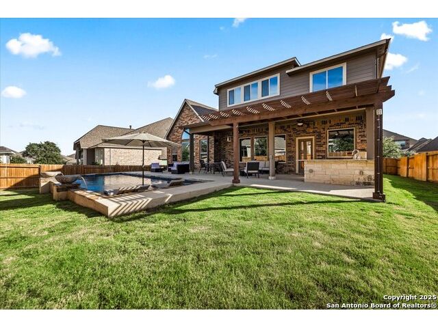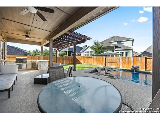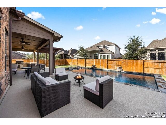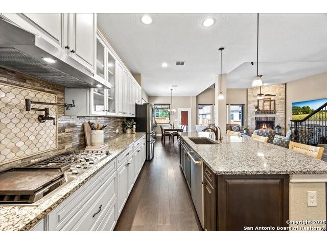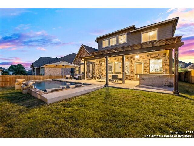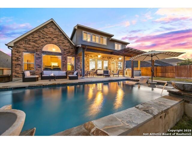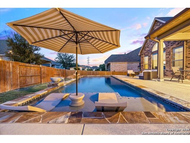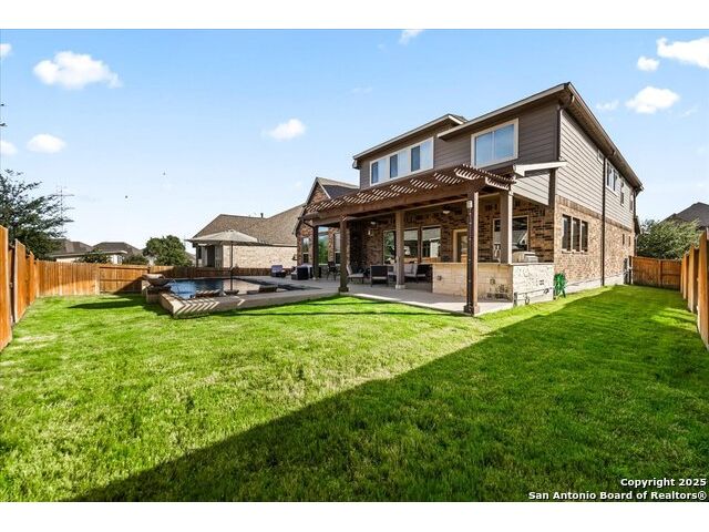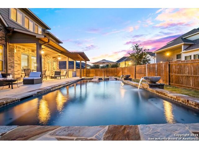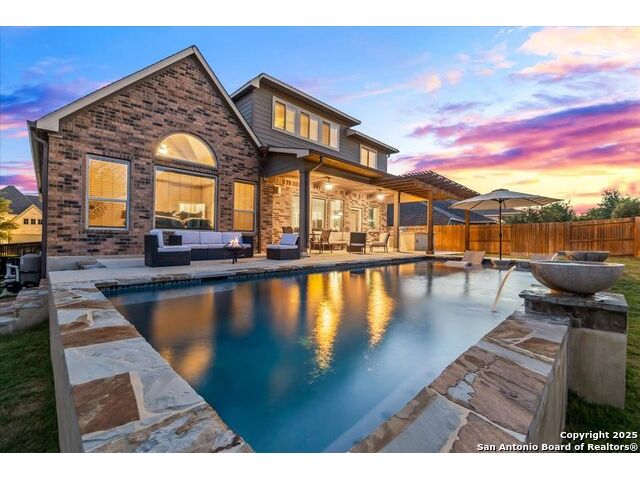 This David Weekley home offers a rare mix of comfort, function, and style. From the moment you arrive, the attention to detail and thoughtful design are clear. The home sits on a generously sized lot, allowing for both a stunning outdoor living space and a grassy backyard perfect for play or relaxing in the sun. A modern, clean-line pool with decorative fountains and a lounge area creates a private resort feel. The outdoor kitchen and oversized covered patio offer an ideal setting for entertaining year-round. Inside, the home continues to impress. Rich wood floors extend throughout the downstairs living areas, adding warmth and character. The chef's kitchen is the heart of the home, featuring an oversized island with plenty of seating, modern appliances, and abundant prep space. It's designed for cooking and gathering. Just off the living room, a fireplace adds a cozy touch for cool evenings. At the front of the home, a dedicated office offers a quiet space for work or study. The primary bedroom is tucked away on the first floor for added privacy. This owner's retreat is spacious and calming, with a stand-alone shower, a garden tub, and a layout that feels like a private spa. Upstairs, the home continues to offer flexible living. A large loft area can be used as a movie room, game room, or even host a pool table. Additional guest bedrooms are located on this level, providing privacy for visitors or space for a growing household. The three-car garage adds storage and convenience, rounding out the home's well-planned layout. This property brings together everyday comfort and standout features that make it truly one of a kind. Welcome home!