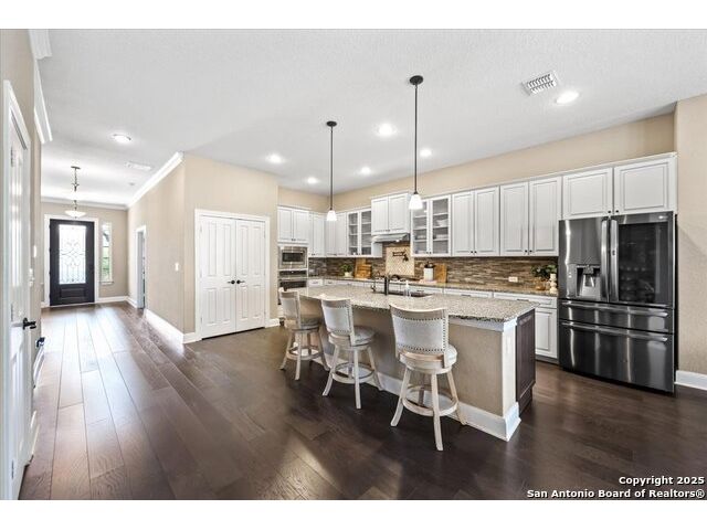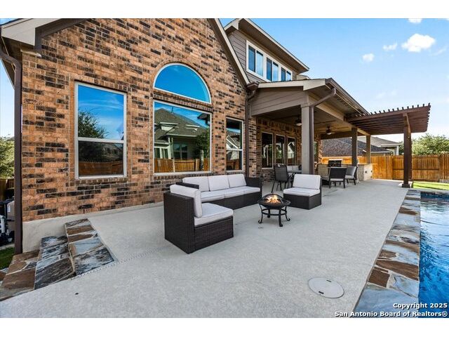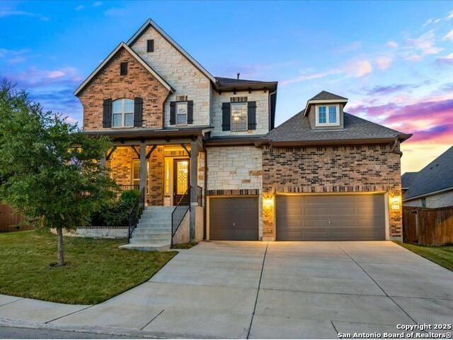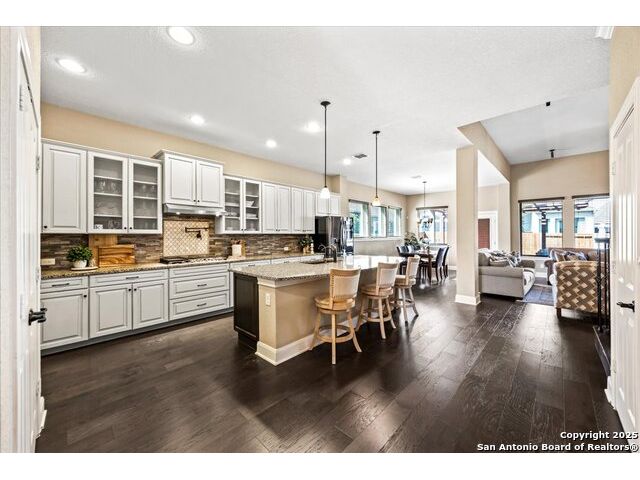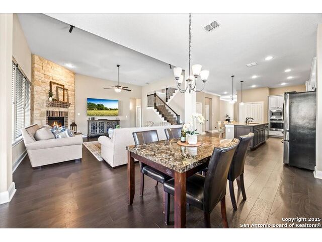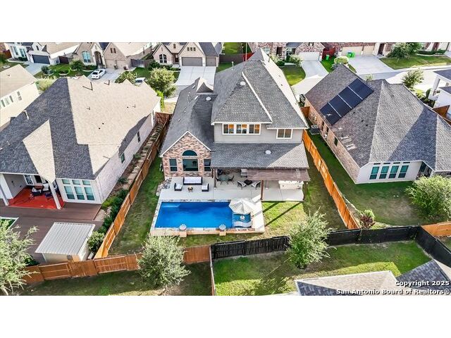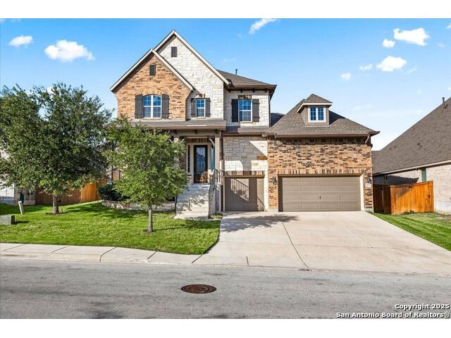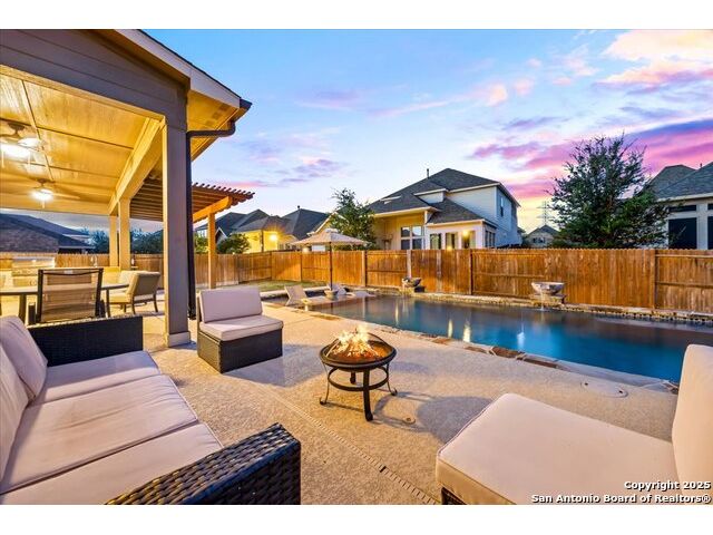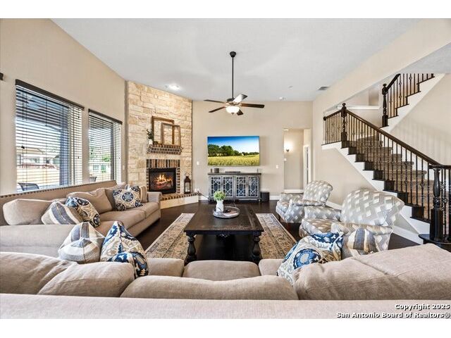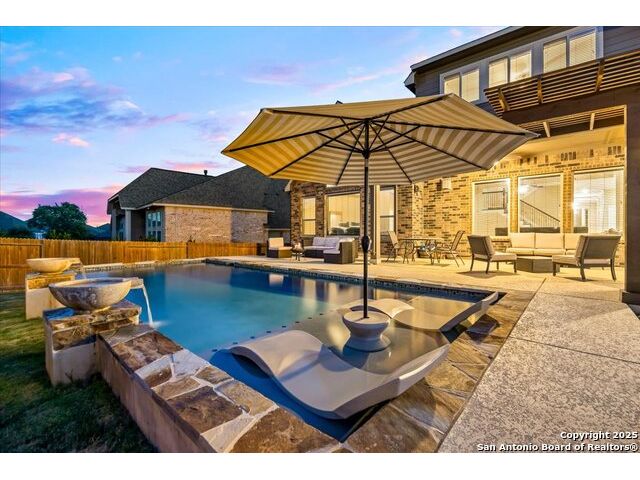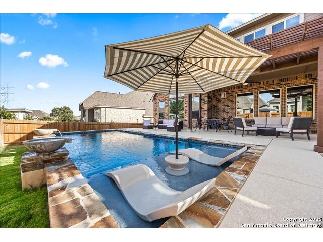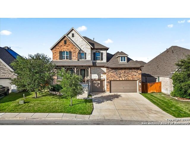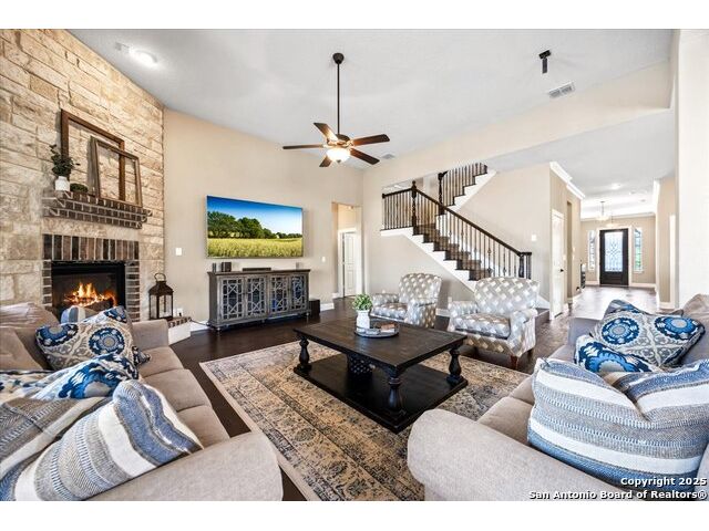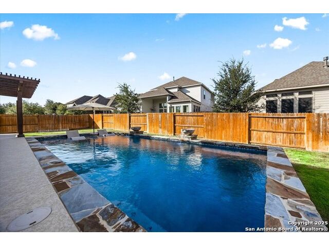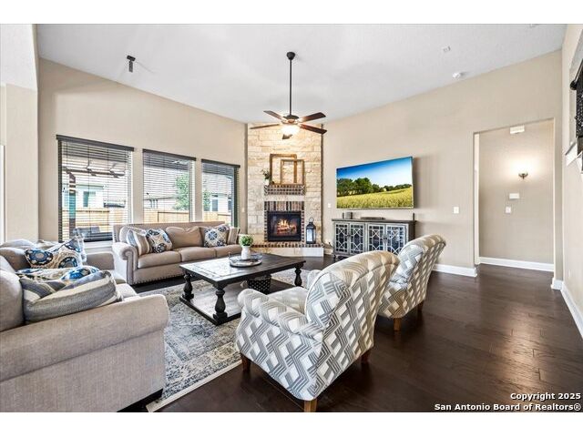 This David Weekley home offers a rare mix of comfort, function, and style. From the moment you arrive, the attention to detail and thoughtful design are clear. The home sits on a generously sized lot, allowing for both a stunning outdoor living space and a grassy backyard perfect for play or relaxing in the sun. A modern, clean-line pool with decorative fountains and a lounge area creates a private resort feel. The outdoor kitchen and oversized covered patio offer an ideal setting for entertaining year-round. Inside, the home continues to impress. Rich wood floors extend throughout the downstairs living areas, adding warmth and character. The chef's kitchen is the heart of the home, featuring an oversized island with plenty of seating, modern appliances, and abundant prep space. It's designed for cooking and gathering. Just off the living room, a fireplace adds a cozy touch for cool evenings. At the front of the home, a dedicated office offers a quiet space for work or study. The primary bedroom is tucked away on the first floor for added privacy. This owner's retreat is spacious and calming, with a stand-alone shower, a garden tub, and a layout that feels like a private spa. Upstairs, the home continues to offer flexible living. A large loft area can be used as a movie room, game room, or even host a pool table. Additional guest bedrooms are located on this level, providing privacy for visitors or space for a growing household. The three-car garage adds storage and convenience, rounding out the home's well-planned layout. This property brings together everyday comfort and standout features that make it truly one of a kind. Welcome home!