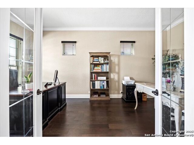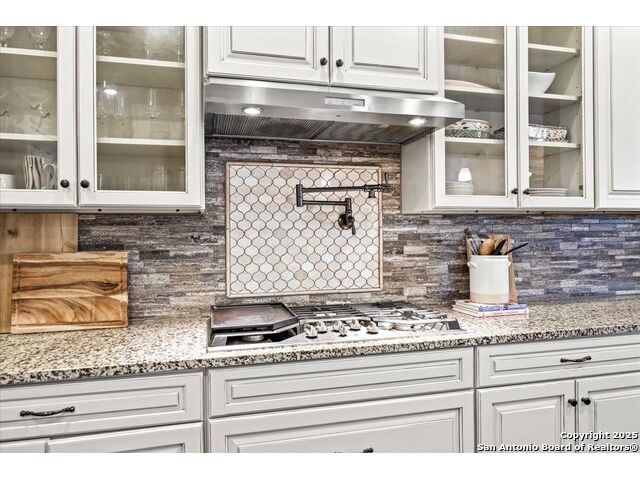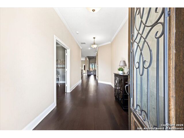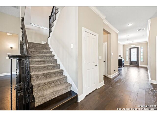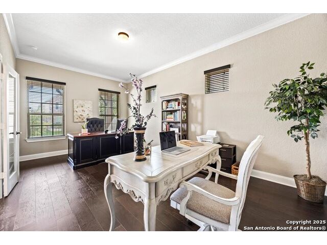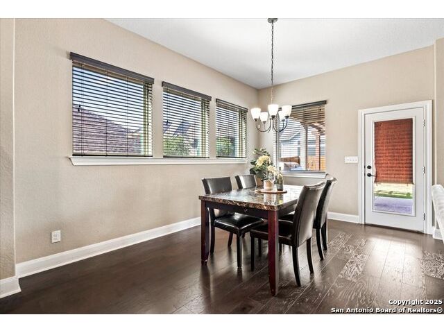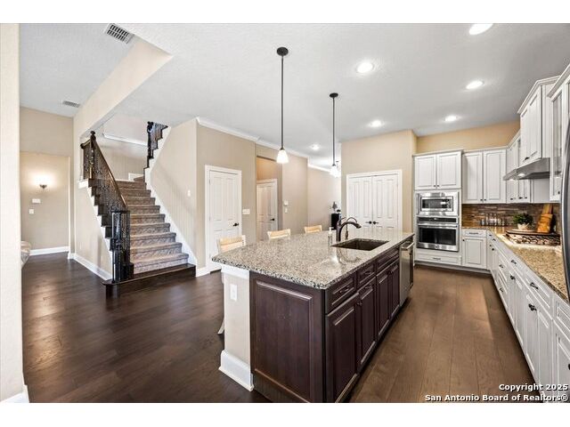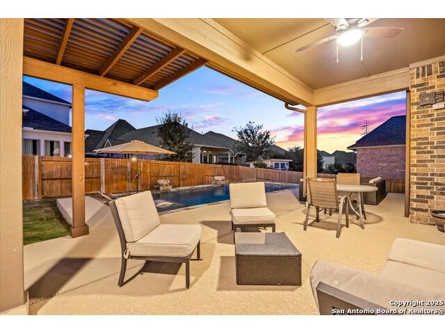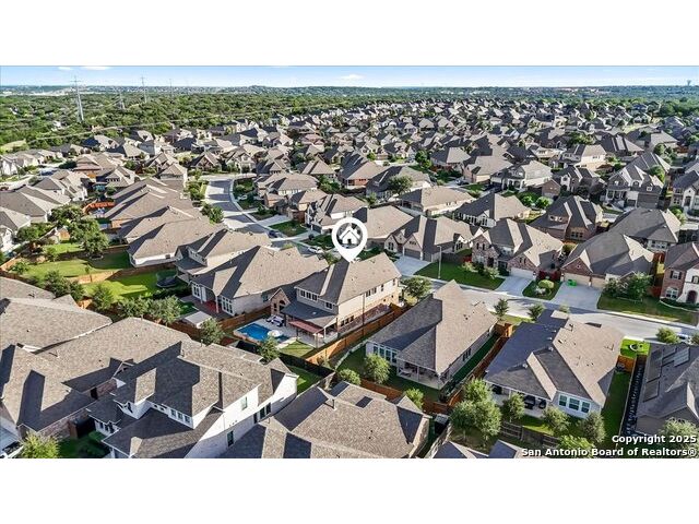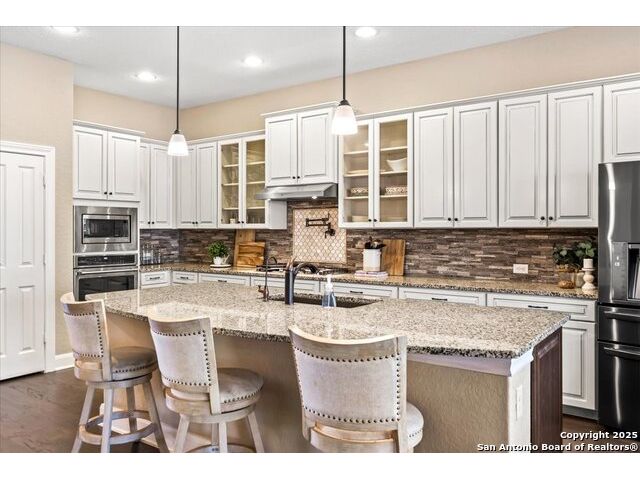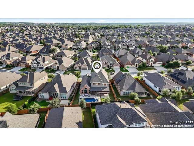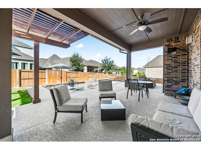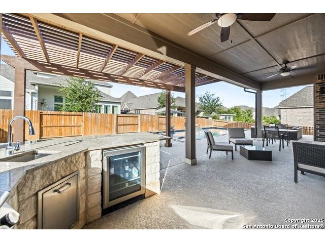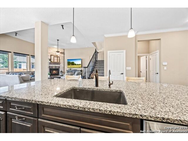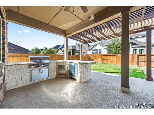This David Weekley home offers a rare mix of comfort, function, and style. From the moment you arrive, the attention to detail and thoughtful design are clear. The home sits on a generously sized lot, allowing for both a stunning outdoor living space and a grassy backyard perfect for play or relaxing in the sun. A modern, clean-line pool with decorative fountains and a lounge area creates a private resort feel. The outdoor kitchen and oversized covered patio offer an ideal setting for entertaining year-round. Inside, the home continues to impress. Rich wood floors extend throughout the downstairs living areas, adding warmth and character. The chef's kitchen is the heart of the home, featuring an oversized island with plenty of seating, modern appliances, and abundant prep space. It's designed for cooking and gathering. Just off the living room, a fireplace adds a cozy touch for cool evenings. At the front of the home, a dedicated office offers a quiet space for work or study. The primary bedroom is tucked away on the first floor for added privacy. This owner's retreat is spacious and calming, with a stand-alone shower, a garden tub, and a layout that feels like a private spa. Upstairs, the home continues to offer flexible living. A large loft area can be used as a movie room, game room, or even host a pool table. Additional guest bedrooms are located on this level, providing privacy for visitors or space for a growing household. The three-car garage adds storage and convenience, rounding out the home's well-planned layout. This property brings together everyday comfort and standout features that make it truly one of a kind. Welcome home!