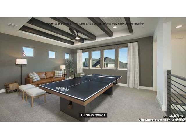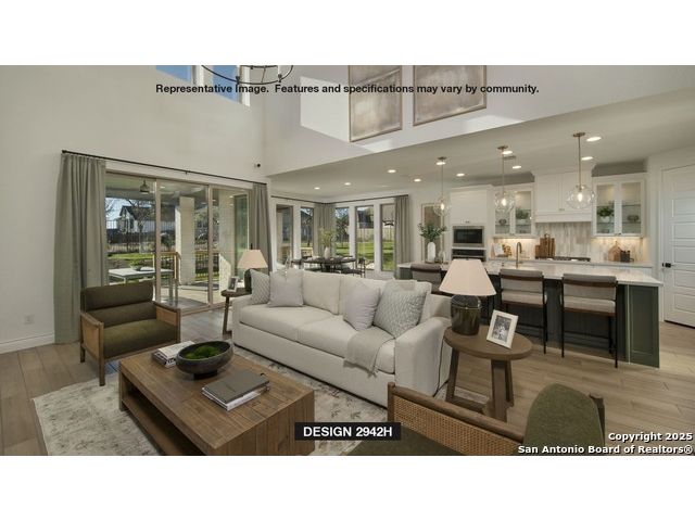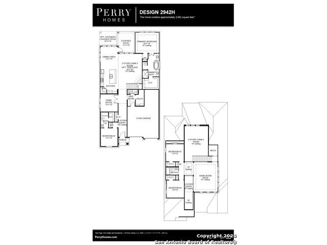 Home office with French doors set along one side of two-story entry. Kitchen and dining area open to two-story family room. Kitchen features corner walk-in pantry, 5-burner gas cooktop and generous island with built-in seating space. Two-story family room features wall of windows. First-floor primary suite includes bedroom with 10-foot ceiling. Double doors lead to primary bath with dual vanities, garden tub, separate glass-enclosed shower and large walk-in closet. First-floor guest suite offers private bath. Game room and two secondary bedrooms are upstairs. Extended covered backyard patio and 5-zone sprinkler system. Mud room off three-car garage.