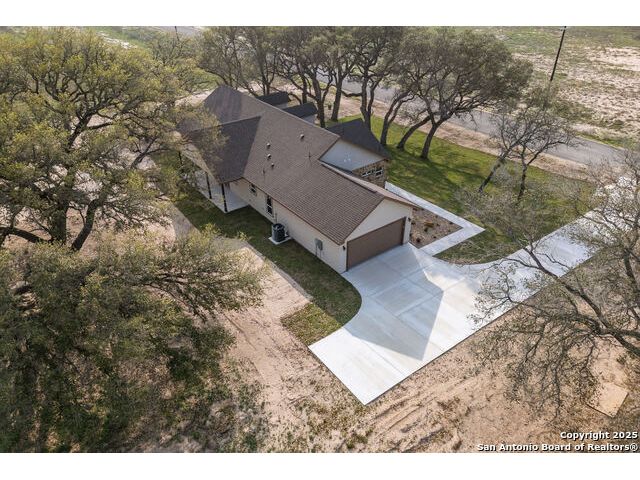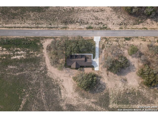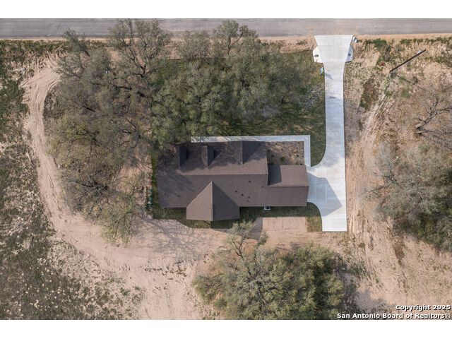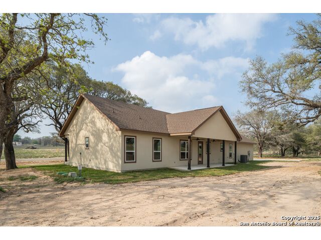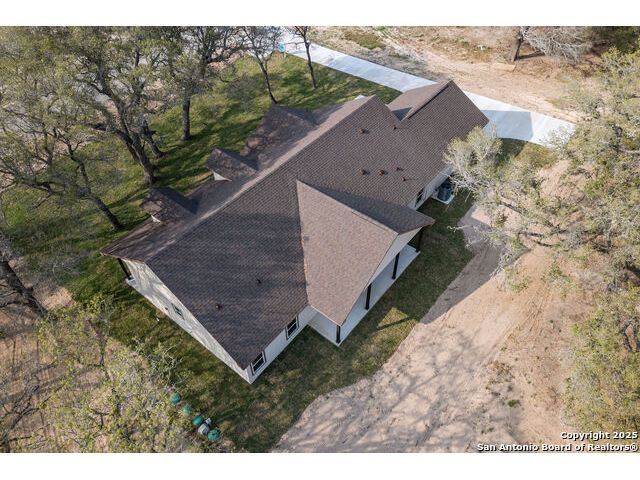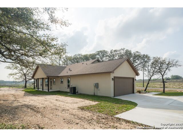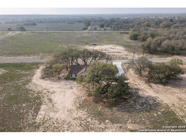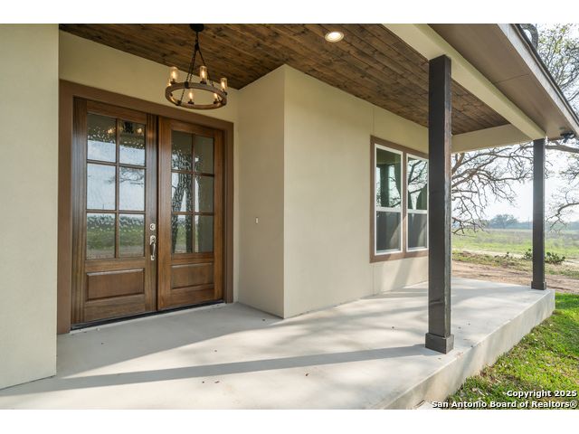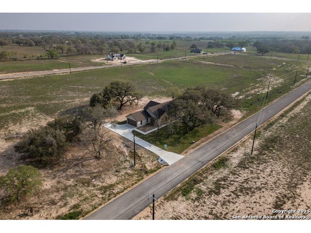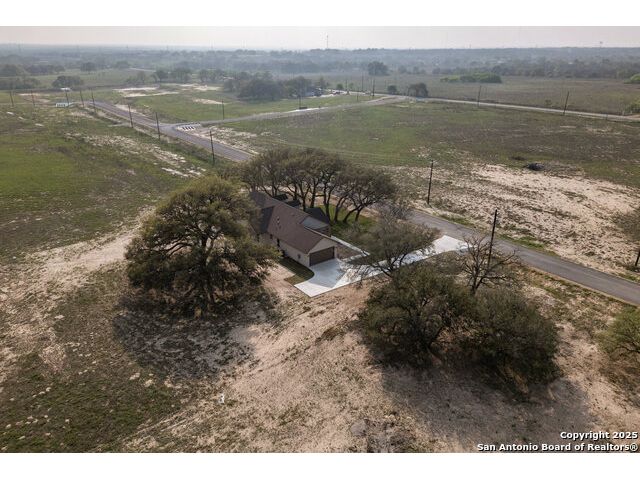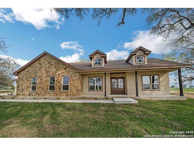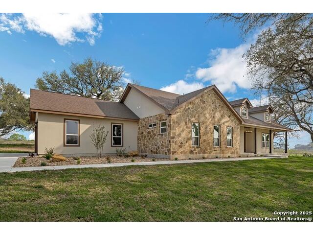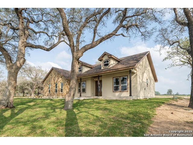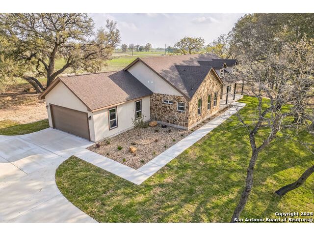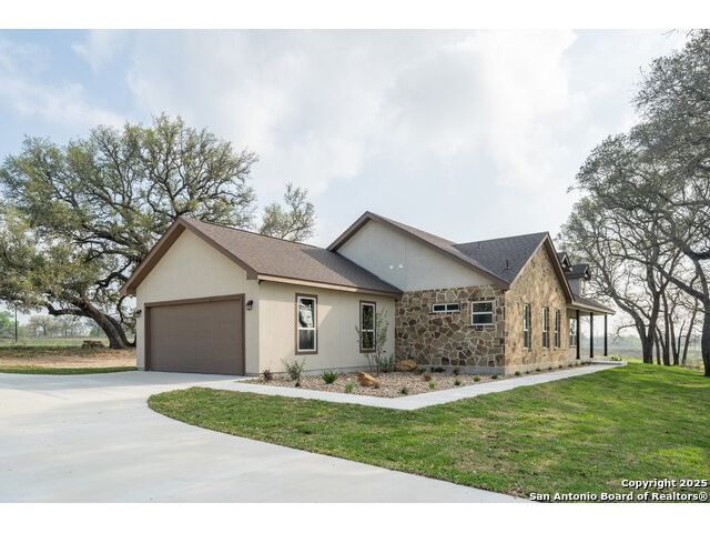Situated on a one-acre lot in Floresville, Texas, this 2,197-square-foot home seamlessly blends modern comfort with natural beauty. Surrounded by mature trees, including a majestic oak in the backyard, the home features spacious front and back porches ideal for enjoying quiet mornings or picturesque sunsets. Inside, there are 3 bedrooms, 2 bathrooms, a mudroom, and a versatile study or flex room. Modern amenities include video surveillance, A/V pre-wiring, and foam insulation, which enhances energy efficiency and comfort by maintaining consistent indoor temperatures and reducing cooling costs-an essential advantage in Central Texas' hot climate. Additional high-end touches include soft-close custom wood cabinets, porcelain wood-look tile flooring, and a stunning stacked-stone fireplace. The kitchen boasts a large granite island with a matching backsplash, while the luxurious master bathroom features marble floor-to-ceiling shower tile. The garage will include a durable polyurea floor coating and an EV charging outlet, providing convenience and future-ready infrastructure for electric vehicle owners.