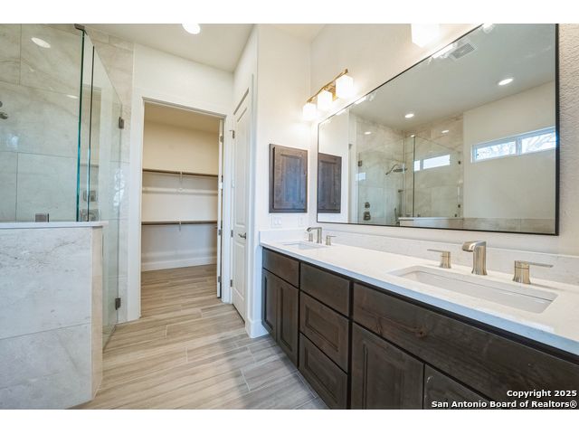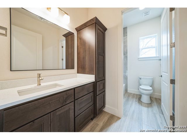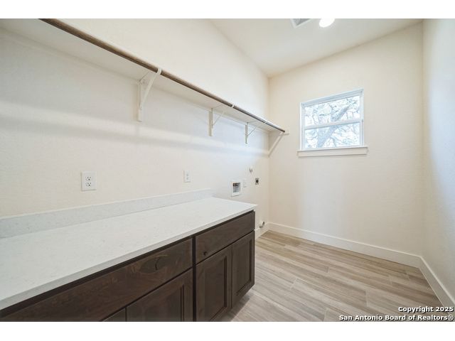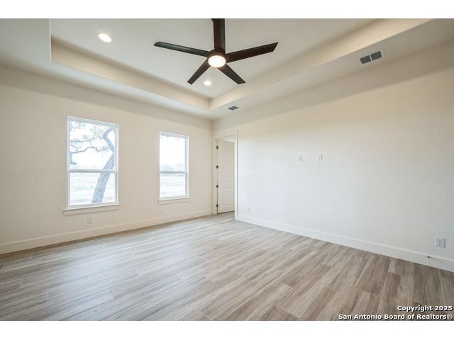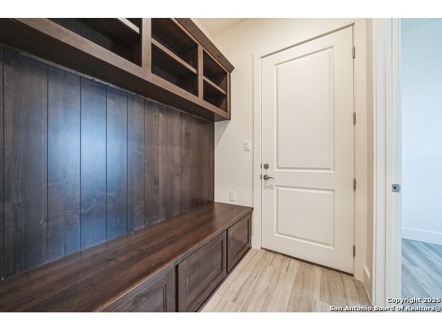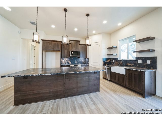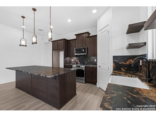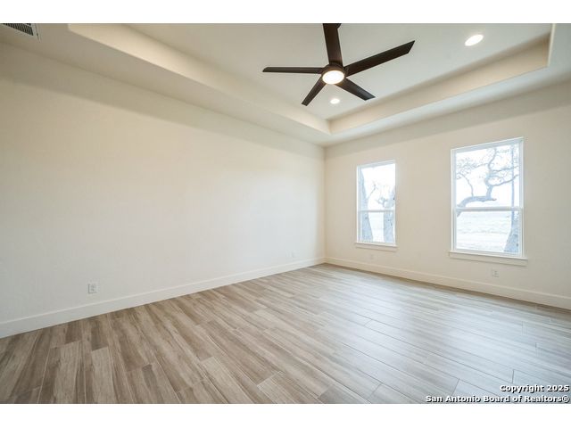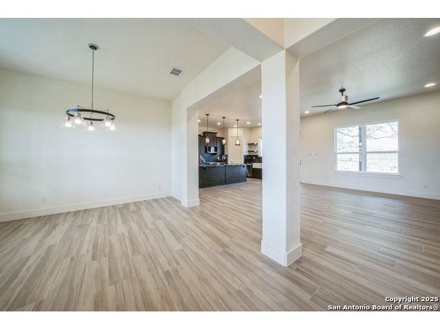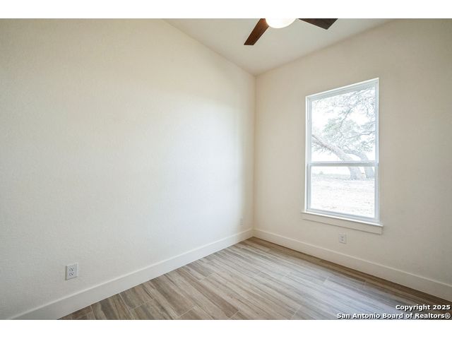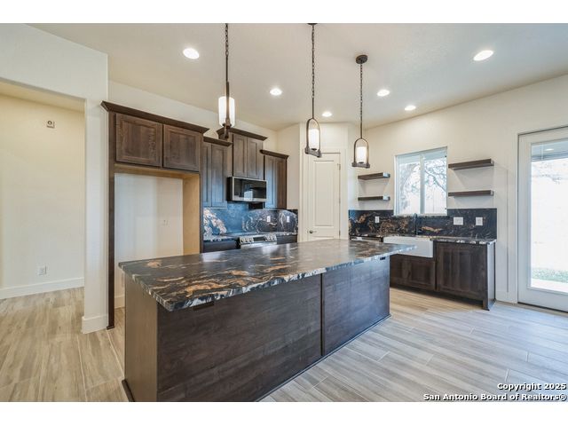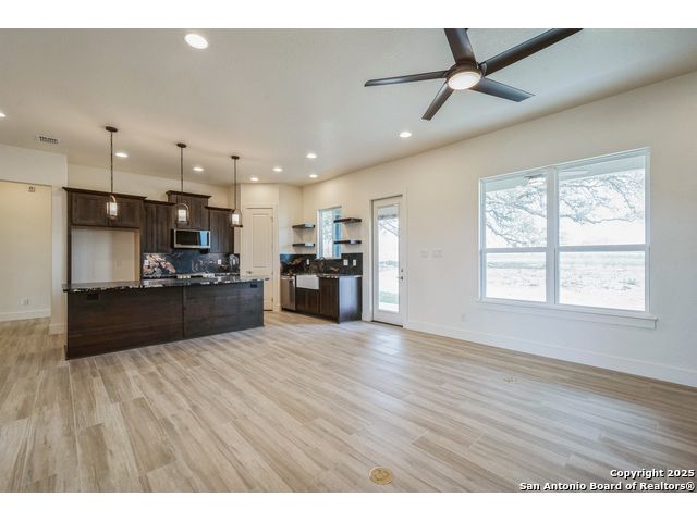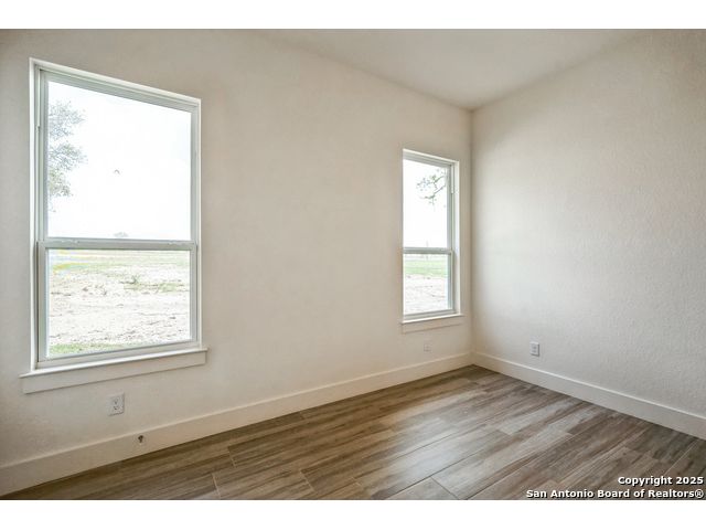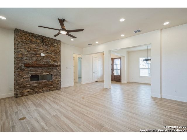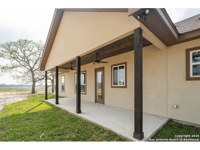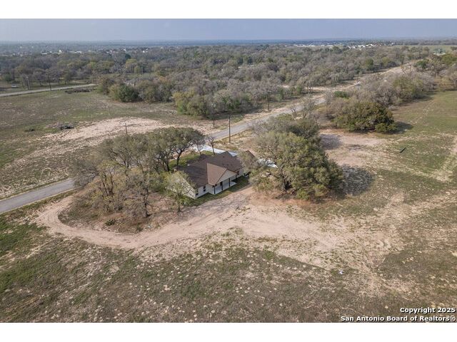 Situated on a one-acre lot in Floresville, Texas, this 2,197-square-foot home seamlessly blends modern comfort with natural beauty. Surrounded by mature trees, including a majestic oak in the backyard, the home features spacious front and back porches ideal for enjoying quiet mornings or picturesque sunsets. Inside, there are 3 bedrooms, 2 bathrooms, a mudroom, and a versatile study or flex room. Modern amenities include video surveillance, A/V pre-wiring, and foam insulation, which enhances energy efficiency and comfort by maintaining consistent indoor temperatures and reducing cooling costs-an essential advantage in Central Texas' hot climate. Additional high-end touches include soft-close custom wood cabinets, porcelain wood-look tile flooring, and a stunning stacked-stone fireplace. The kitchen boasts a large granite island with a matching backsplash, while the luxurious master bathroom features marble floor-to-ceiling shower tile. The garage will include a durable polyurea floor coating and an EV charging outlet, providing convenience and future-ready infrastructure for electric vehicle owners.