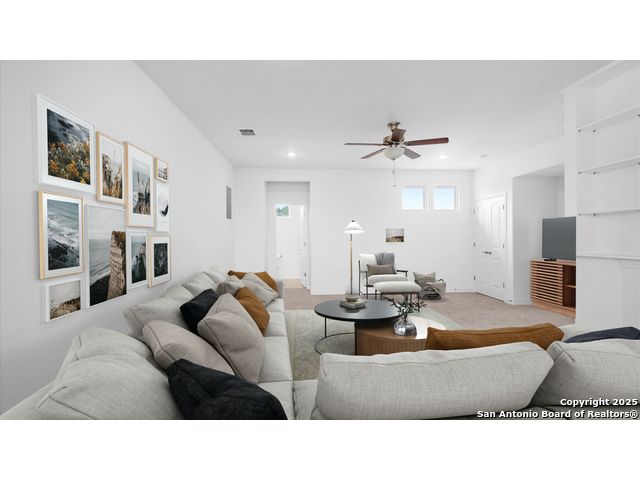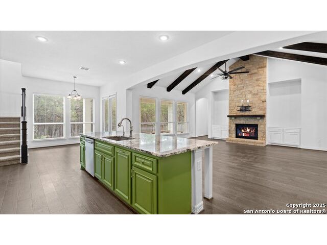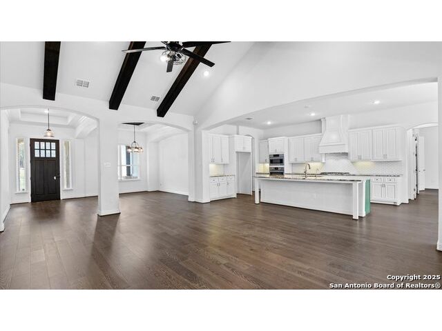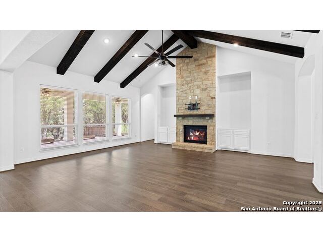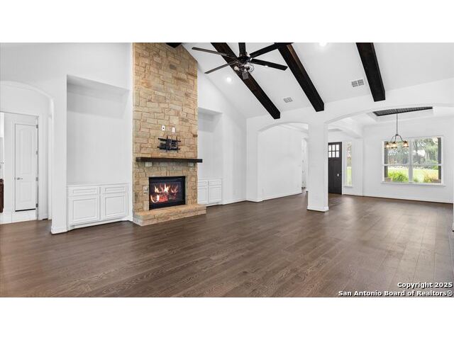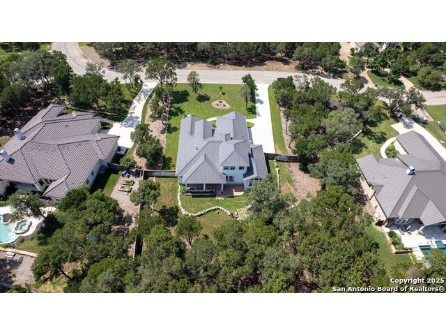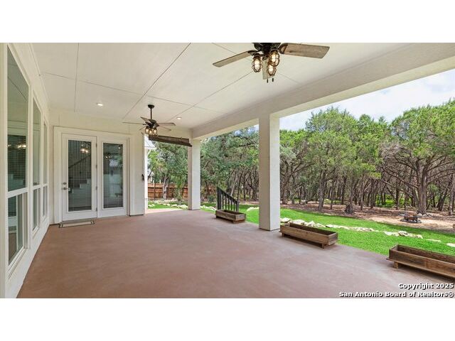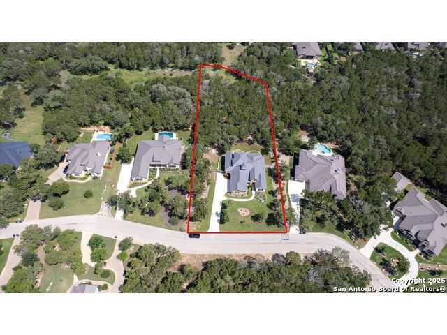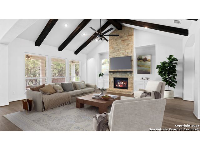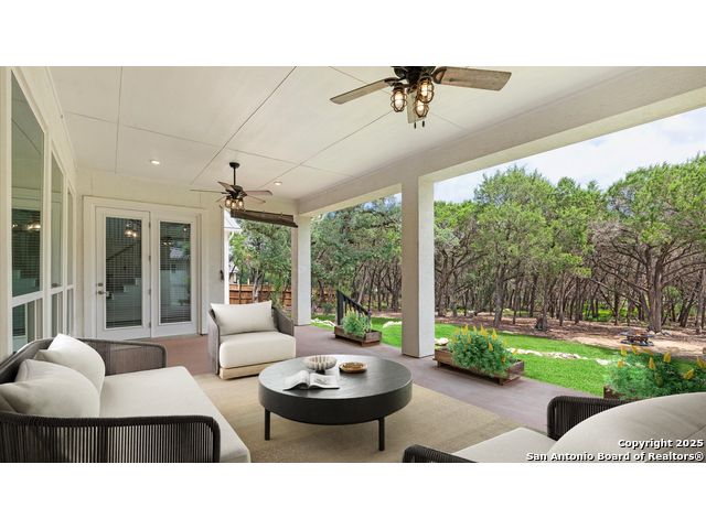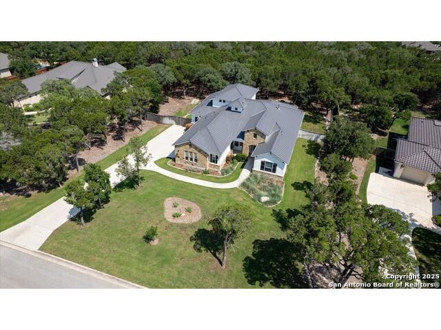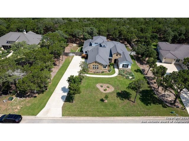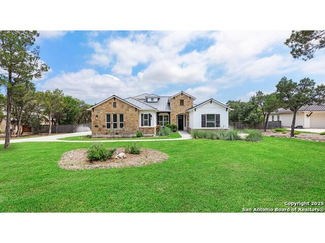 Nestled on nearly an acre and a half in the gated community of The Preserve at Mission Valley, this stunning Hill Country home offers the perfect balance of luxury, comfort, and timeless design. The two-story layout is thoughtfully planned, with the spacious primary suite and three additional bedrooms located on the main level, while a large upstairs family room features custom built-ins and a convenient half bath-ideal for a game room, media space, 5th bedroom or home office. At the heart of the home, an expansive open-concept living area features soaring beamed ceilings, a dramatic floor-to-ceiling rock gas fireplace, and oversized windows that flood the space with natural light and offer picturesque views of the backyard. The chef's kitchen is a dream, complete with a large center island, high-end appliances, custom cabinetry, and abundant counter space. Adjacent to the kitchen are both a formal dining room and a charming breakfast nook, providing multiple options for entertaining and everyday dining. The primary suite is a private retreat with vaulted, beamed ceilings, large windows, and a spa-inspired en-suite bath that includes a jetted garden tub, walk-in shower, dual vanities, and an impressive walk-in closet with built-ins. Two additional full guest baths serve the secondary bedrooms, offering comfort and convenience for family or guests. Step outside to enjoy a generous covered patio with ceiling fans and an additional uncovered area perfect for a hot tub. Among the mature trees in the backyard, you'll find a cozy firepit-perfect for entertaining under the stars. With plenty of room for a private pool and an oversized three-car garage, this home offers space to grow and enjoy. Located just minutes from New Braunfels, Gruene, and the scenic beauty of the Hill Country, this exceptional property combines privacy, elegance, and functionality in one of the area's most desirable communities.