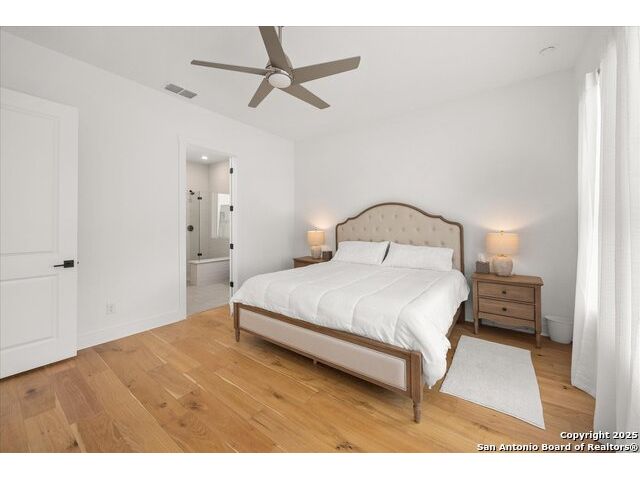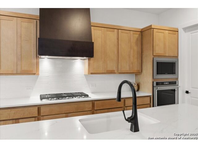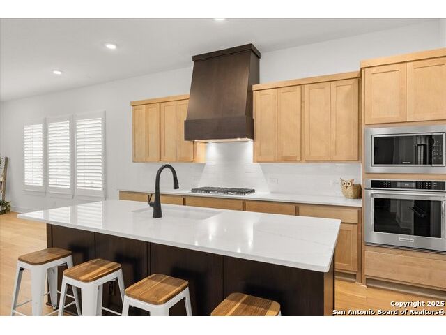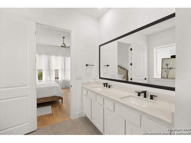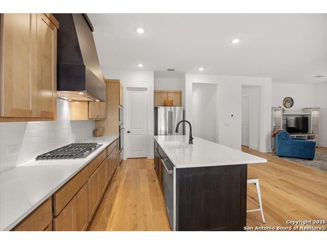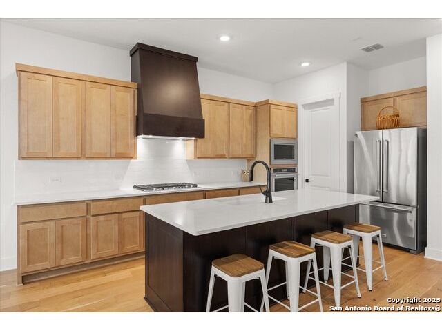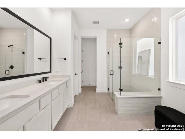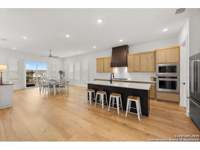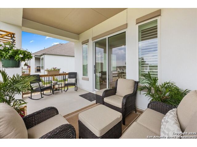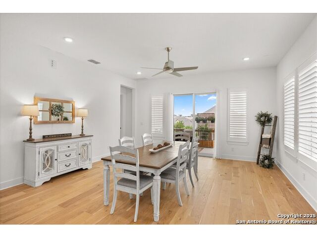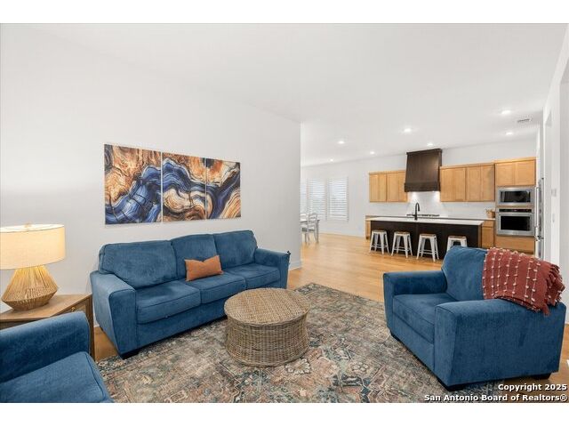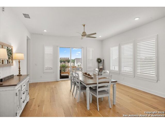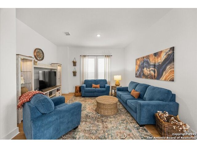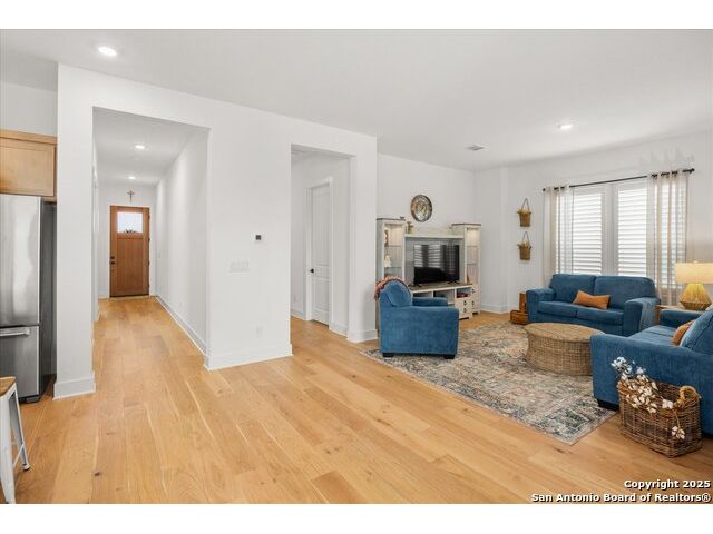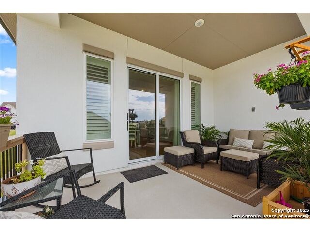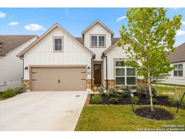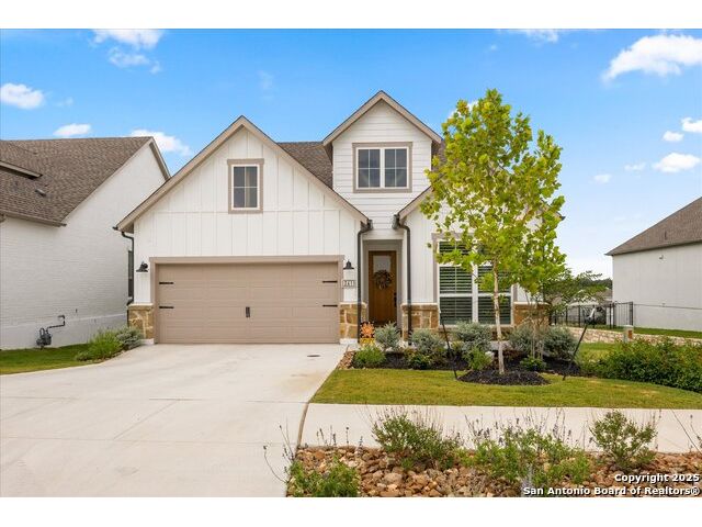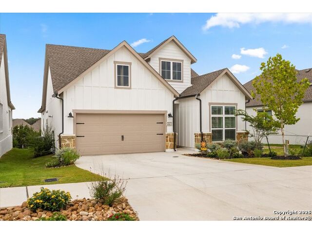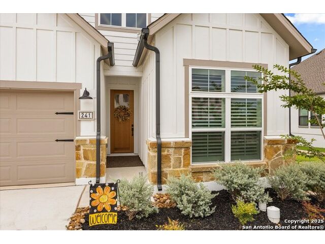 Welcome to 241 Sentido, a beautifully designed single story home located in the highly sought-after gated community of Regency at Esperanza, Boerne's vibrant active 55 plus community! This nearly new home offers 2 bedrooms, 2 full bathrooms, a 2 car attached garage; all thoughtfully designed for comfort, convenience and style. Upon entering, you will will immediately notice the gorgeous engineered wide plank flooring throughout, as well as an open concept layout featuring a light filled dining area, a large kitchen island, walk-in pantry, built-in stainless appliances and quartz counters. Custom plantation shutters have been added to all of the windows already, so there is literally nothing for you to do other than just move right in. The family room is located off the kitchen and provides a private space for gatherings. The spacious primary bedroom suite is located in the rear corner of the house, creating privacy from the guest bedroom. The primary bathroom includes a beautiful quartz double vanity, a frameless glass shower and a large walk-in closet with built-in features. The guest bedroom is located in the front of the home off the entry and has access to the gorgeous guest bathroom within a few feet. Work from home and need an office? There is a private study with french doors that is ideal for the work from home buyer. You will also appreciate the spacious laundry room, as well as the black hardware throughout that really stands out from the standard chrome often found in other homes. The rear covered patio is a perfect place to sit and have your morning coffee or evening glass of wine, while also having the benefit of green space on one side of the house, creating even more privacy. Built less than a year ago and better than new, this home boasts all of the benefits of new construction, but without the wait! Enjoy the ease of single level living in a home that has been so gently lived in and meticulously maintained, you will feel you are in the model home! The activities offered within this 55 plus community are literally endless! From pickleball, to corn hole, to Aqua Fitness, to card groups to Bocee ball and many more, it's impossible to be bored! Such a lifestyle awaits you here at 241 Sentido! If all of this isn't enough, you will also have full access to the all of the other amenities throughout the greater Esperanza community such as the lazy river, pool, dog park, walking trails and more! If you are in the market for a 55 and older community, want a gorgeous home that is essentially new and want to have access to an array of daily activities at your fingertips, you need to put 241 Sentido on your short list!