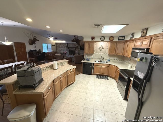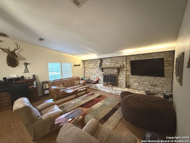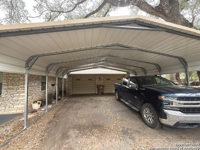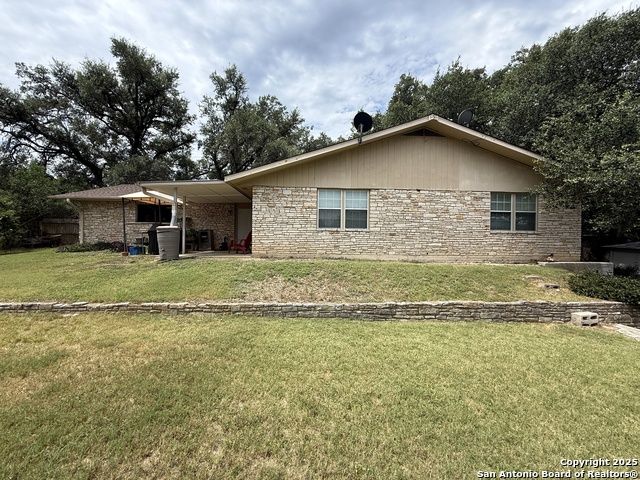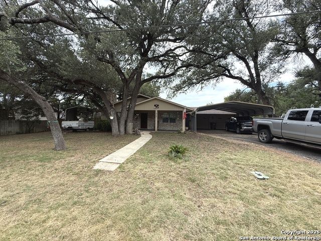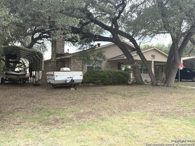 Bring your lake toys! This single story 4 sided masonry ranch style 3/2/2 home sitting on a double lot .34 acre. Home has new heavy composition 30 yr shingle installed May 2025. Recent water heater replacement. One A/C unit has been replaced in 2020. Kitchen remodeled in 2013 with Silestone quartz countertops and cabinets and tile and wood flooring. Master bath has also been remodeled. Massive fireplace and mantle in living room. Open floor plan. Covered boat or RV parking and additional garage carport in front of garage. nice covered porch great for entertaining and lots of room for storage and oversized 2 car garage. Mature trees, low HOA dues. Two boat ramps in neighborhood. Home listed under the current county $423,490 value.