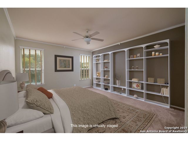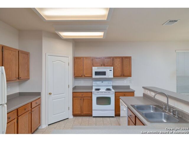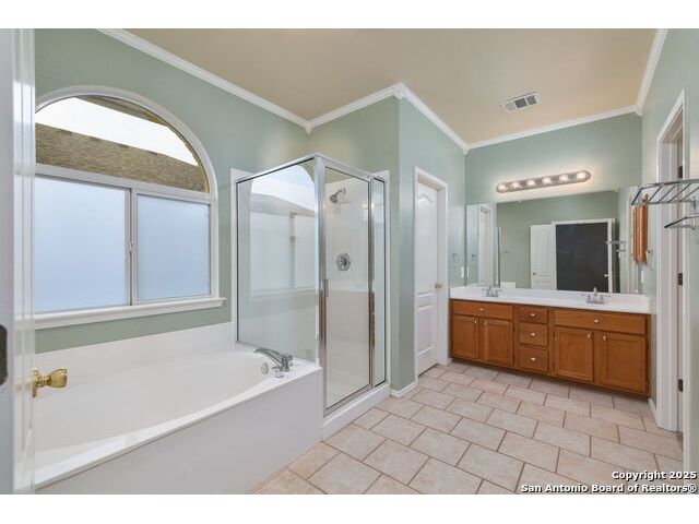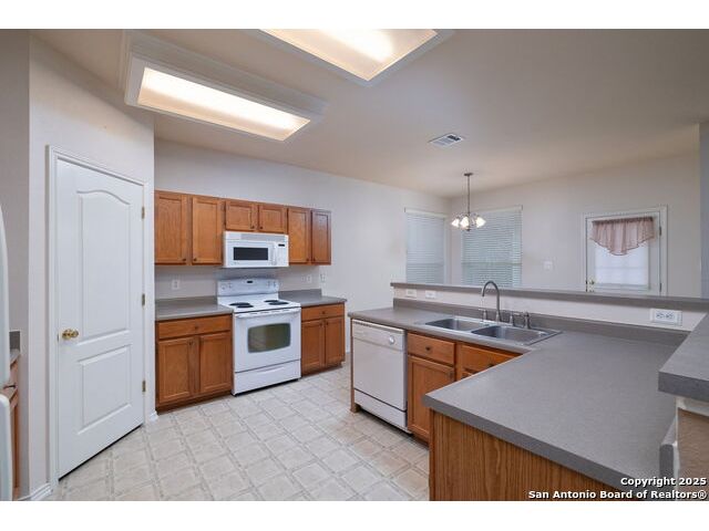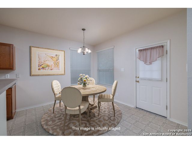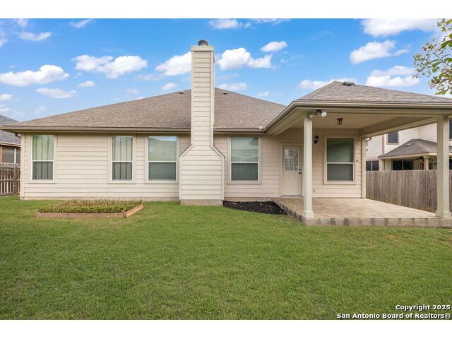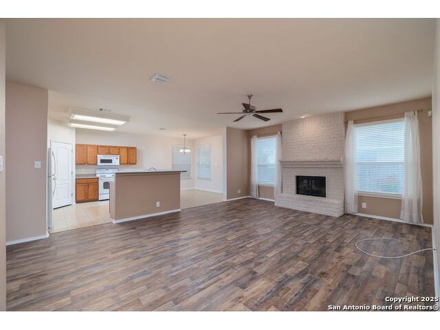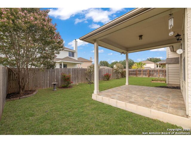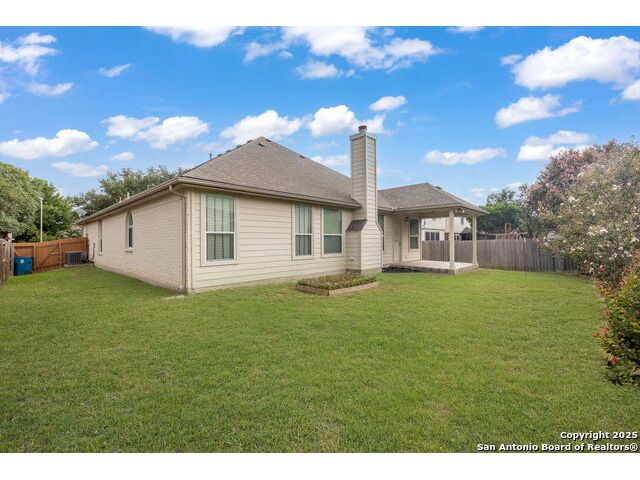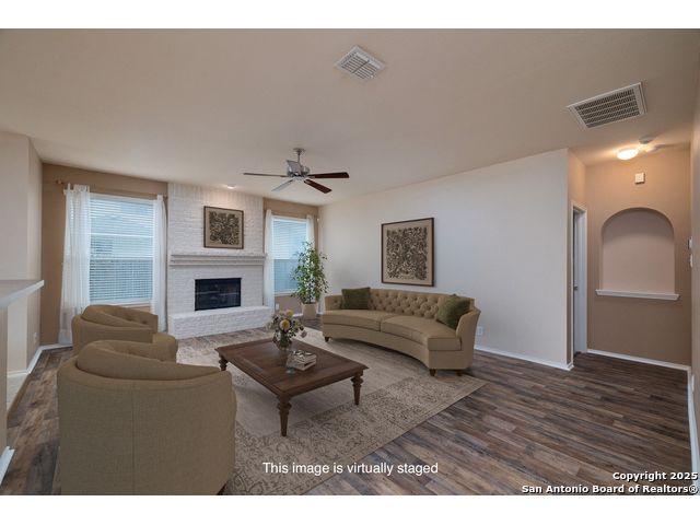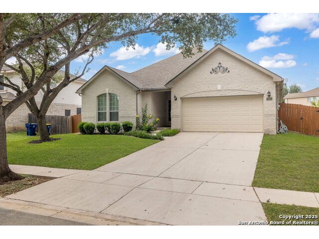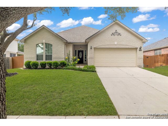 Welcome to this exceptional 4-bedroom, 2-bath home nestled in a desirable neighborhood! Featuring an open-concept layout with custom touches throughout, this home boasts crown molding, ceramic tile flooring, and designer paint. The spacious living room with a cozy fireplace flows seamlessly into a formal dining area. Perfect for entertaining. The large kitchen offers abundant cabinet and counter space, a breakfast bar, nook, and walk-in pantry. Generously sized secondary bedrooms and an oversized primary suite provide plenty of room to relax. The primary bath includes a dual vanity, separate garden tub and shower, and a huge walk-in closet. Outside, enjoy a charming white Hillstone exterior, covered patio, privacy fence, solar screens, gutters, and beautifully manicured landscaping. A true gem with thoughtful upgrades throughout!