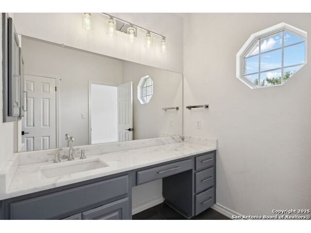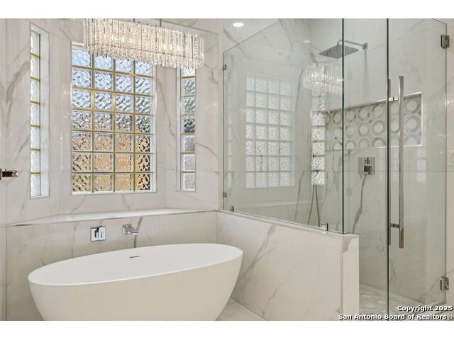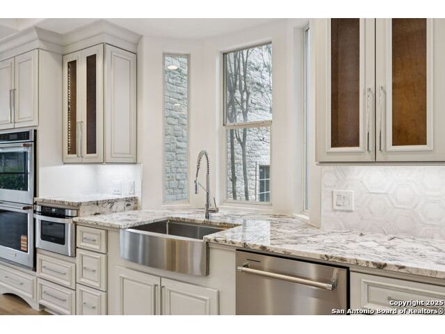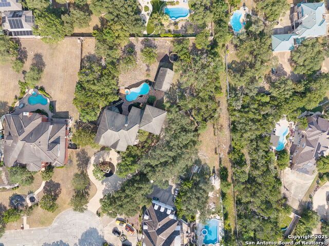 Welcome to 19206 Grey Bluff Cove - a stunning, fully renovated estate nestled in the heart of San Antonio's prestigious Northside. This luxurious property seamlessly blends modern upgrades with timeless elegance, offering an unparalleled lifestyle for both comfortable family living and grand-scale entertaining. Step through the dramatic two-story foyer and ascend one of three handcrafted wrought iron staircases. The home features multiple living spaces, including an media/playroom with glass walls offering breathtaking views of the city skyline and a new wine fridge. At the heart of the home lies a gourmet chef's kitchen equipped with brand-new appliances including Z-line gas range, Kitchen Aid double oven, Kitchen Aid dishwasher, wine fridge, jaw dropping tile, and exquisite cabinetry. The kitchen opens to spacious entertaining areas that flow effortlessly outdoors to a resort-style oasis. Enjoy a completely reimagined outdoor experience featuring a diving pool with a spa and waterfall with new pool pump, filters, Polaris and lighting, multi-level flagstone patios, and a newly updated pool house. The separate 1-bedroom, 1-bath guest quarters provide additional flexible space ideal for visitors, extended family, or a private office. Additional upgrades include 4 brand-new HVAC systems, modern flooring throughout, and full interior renovation of all bathrooms and bedrooms. The property has been meticulously cleaned and refreshed, making this home truly move-in ready. Designer updated lighting package along with new hardwood floor throughout. Located in a quiet cul-de-sac with a circular drive, this estate offers privacy, style, and convenience-all just minutes from top schools, dining, and shopping in Stone Oak. Showings by appointment only. Welcome to your forever home.