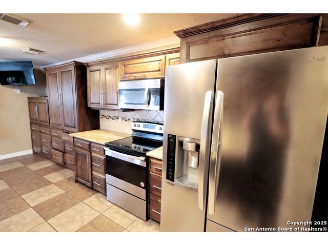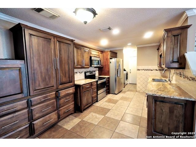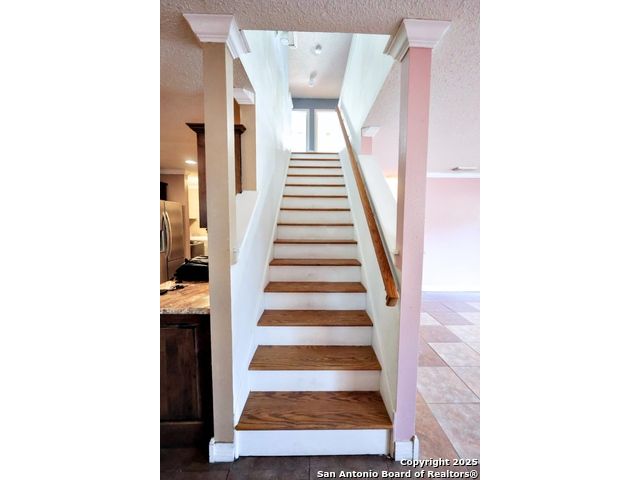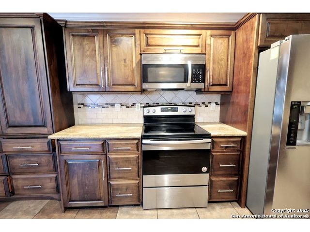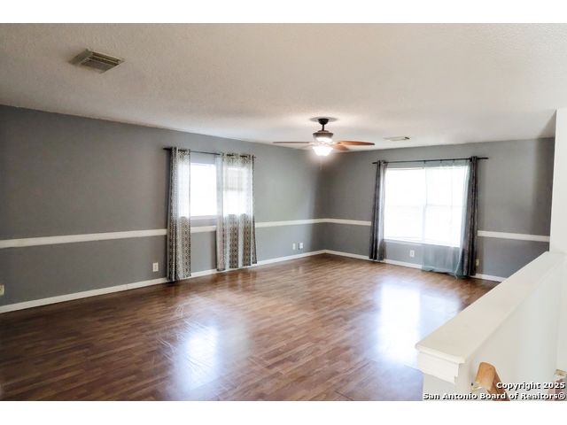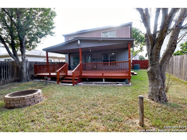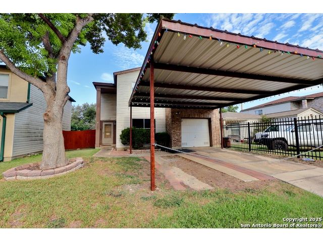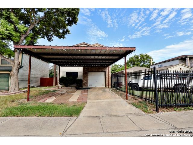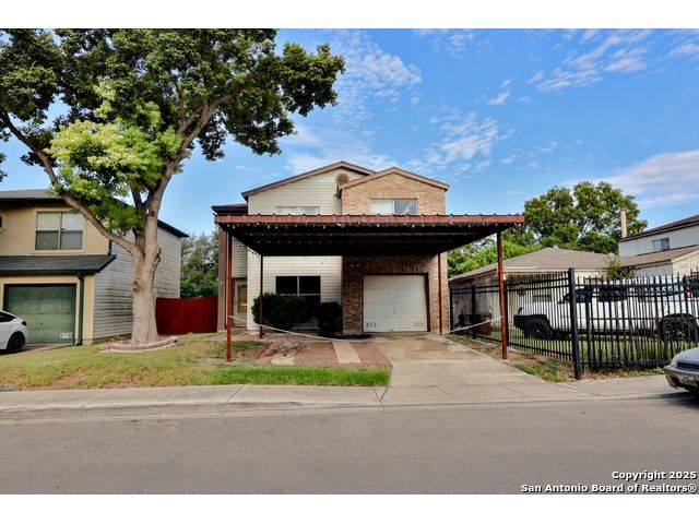 Check out this charming two-story home, perfectly located just minutes from BAMC Military Base with quick access to Loop 410 and I-10! This carpet-free beauty is designed for comfort and efficiency, featuring solar panels to help keep your home cool in the summer and warm in the winter-without the extra strain on your wallet. Step outside to a spacious backyard shaded by mature trees, complete with a wooden covered deck, perfect for relaxing or entertaining. The front of the home offers a two-car carport along with an additional one-car garage for extra parking or storage. Inside, enjoy a large theater room, elegant wood stairs, and newly installed custom wooden cabinets that add warmth and character. Both upstairs and downstairs bathrooms have been beautifully upgraded, making this home truly move-in ready. 18 panels, 5.76 kilowatts, Roof less than 10 years old. Don't miss your chance to own this thoughtfully updated home in a prime location!