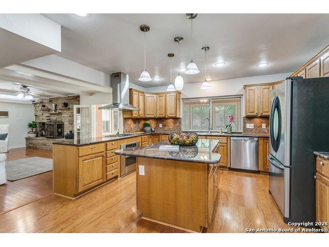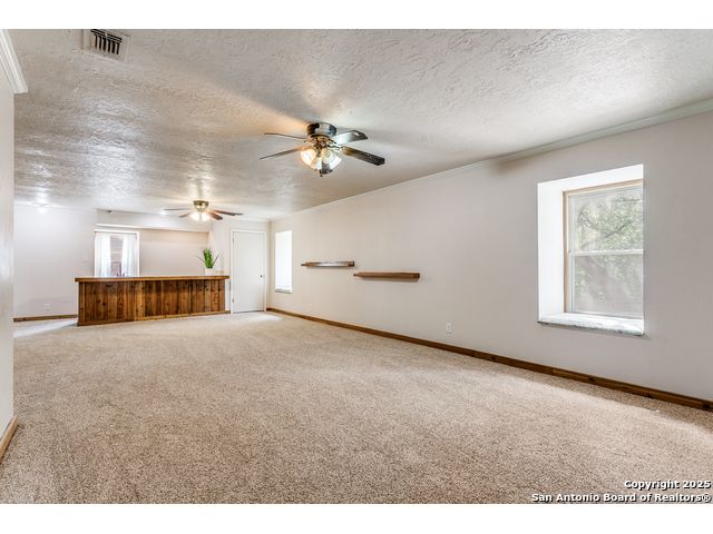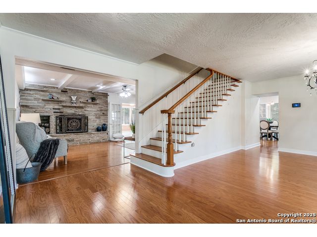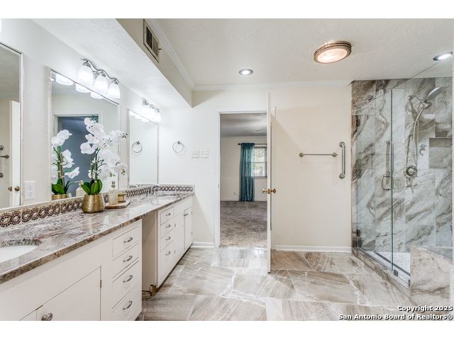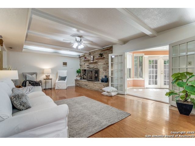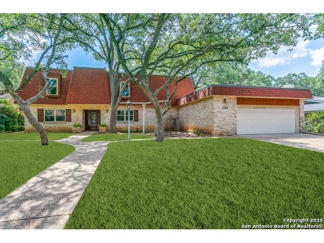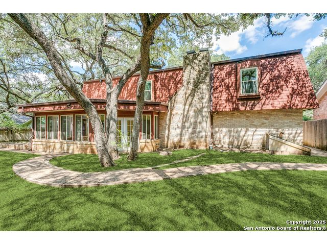 Nestled beneath a canopy of towering, mature oak trees on a beautifully shaded lot, this stately residence in the highly sought-after Whispering Oaks neighborhood offers timeless charm paired with modern luxury. Seller has made the large investment of updating the kitchen AND all bathrooms with high end finishes so you can enjoy! With an expansive and versatile 5-bedroom floorplan, including a separate mother-in-law suite, this home provides generous space for multi-generational living, guests, or a private office setup. Enjoy multiple living spaces including a bonus room complete with a wet bar, and a sunroom equipped with custom motorized Hunter Douglas shades. Additional highlights include hardwood floors, a central vacuum system, newer windows, a newer roof, and a custom shed ensuring peace of mind and long-term value. Step outside and enjoy unbeatable neighborhood amenities-just a short walk to a heated pool with slide, tennis courts, pickleball courts, and playgrounds. And for your convenience, Alon Town Centre is only 3 minutes away, offering an HEB, shopping, dining, and more. Easy access to the airport and medical center. This is the perfect opportunity to own a beautifully updated home in a prime location-schedule your private showing today!