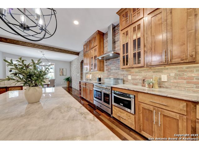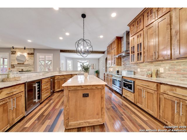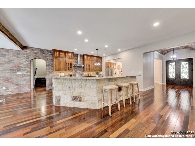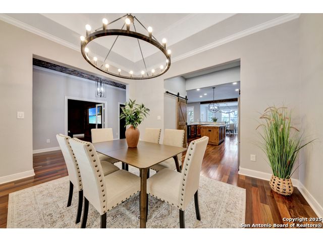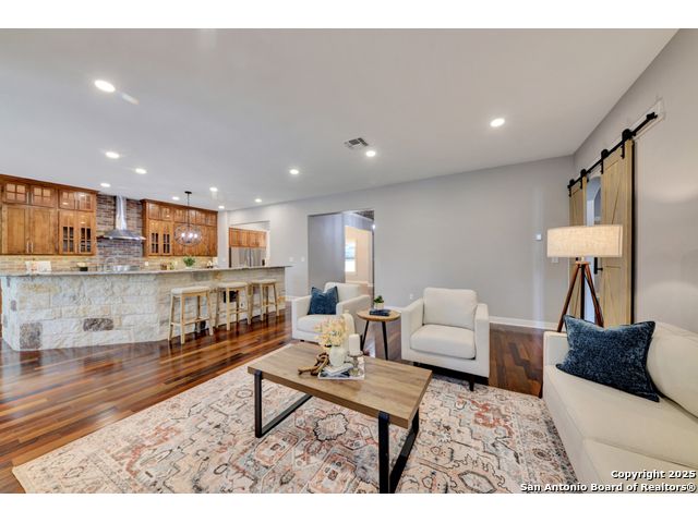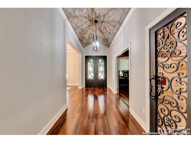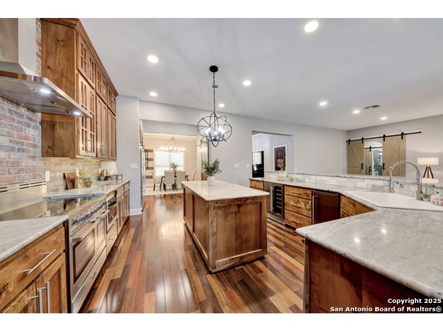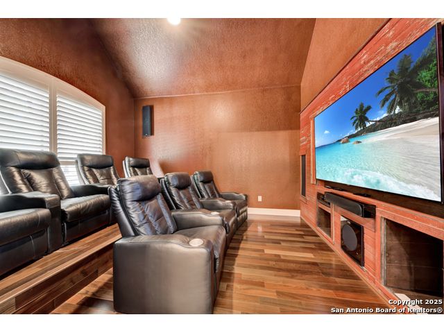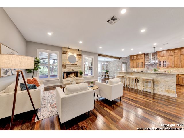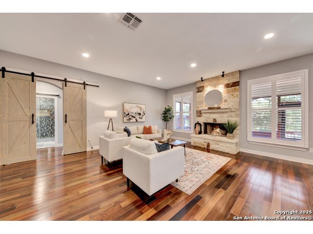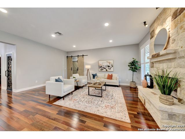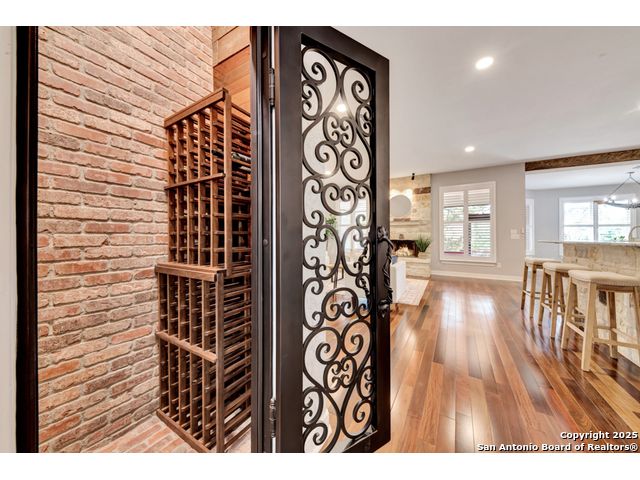 Exquisite 4-bedroom, 3-bath luxury home in the beautiful neighborhood of River.Crossing. This home has been masterfully remodeled inside and out (2022-2024). Showcasing Brazilian walnut and oak plank flooring, elegant crown molding, barn doors, brick barrel ceilings, and a custom movie theater room. The chef's kitchen features custom alder cabinetry, dual built-in refrigerators, Italian Verona range, walk-in wine cellar, and premium granite and translucent quartzite surfaces. Spa-inspired baths offer natural stone showers, quartzite vanities, designer fixtures, and a freestanding tub in the primary suite. Outdoor living boasts a screened cedar porch with Saltillo tile, stamped concrete patios and walk ways, outdoor kitchen with pergola, and xeriscaped landscaping with a tranquil river rock creek. Major updates include new HVAC (2025), roof, plumbing, LED lighting, water filtration, and more. Select appliances may convey. Conveniently located near schools, shopping and restaurants.
