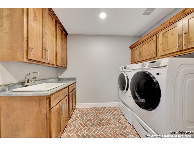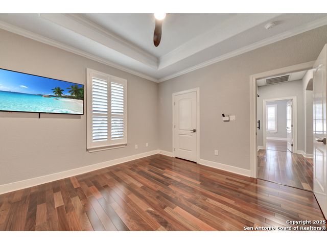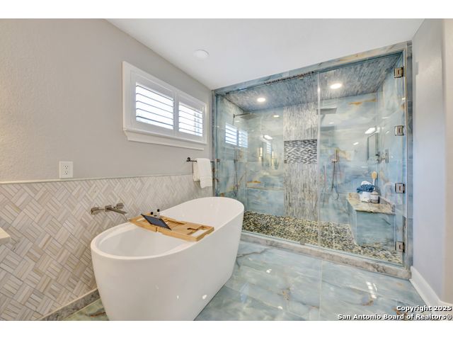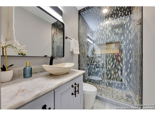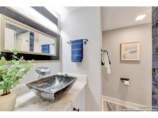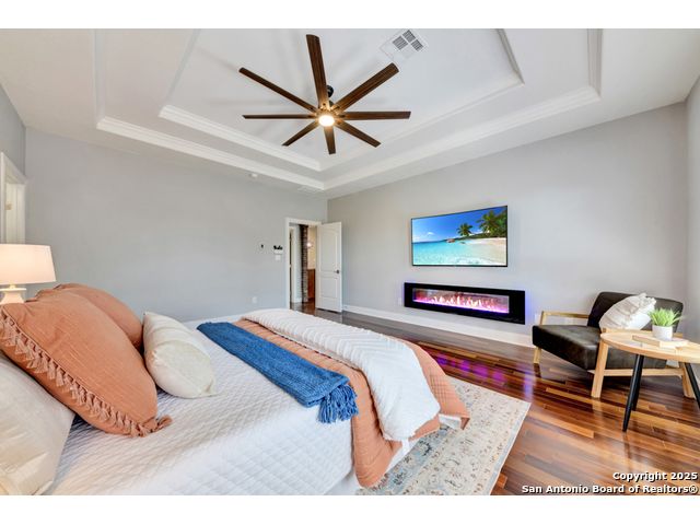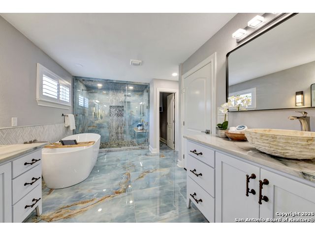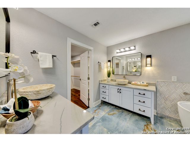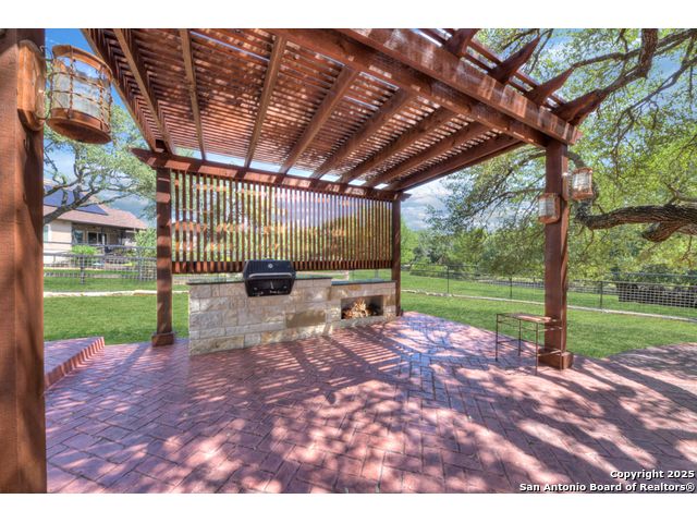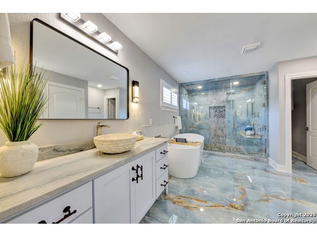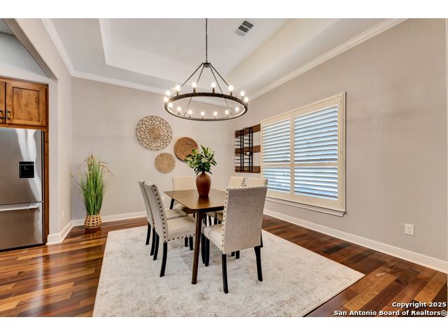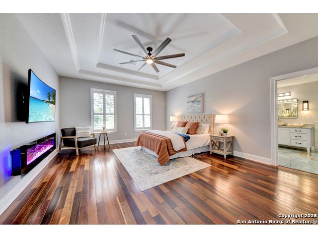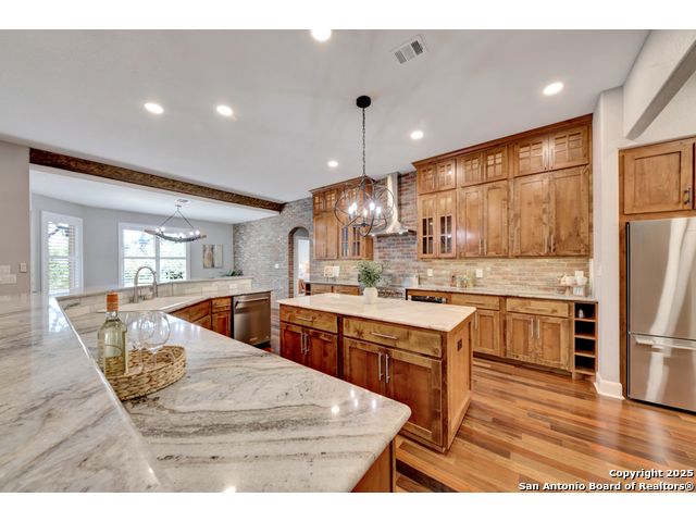 Exquisite 4-bedroom, 3-bath luxury home in the beautiful neighborhood of River.Crossing. This home has been masterfully remodeled inside and out (2022-2024). Showcasing Brazilian walnut and oak plank flooring, elegant crown molding, barn doors, brick barrel ceilings, and a custom movie theater room. The chef's kitchen features custom alder cabinetry, dual built-in refrigerators, Italian Verona range, walk-in wine cellar, and premium granite and translucent quartzite surfaces. Spa-inspired baths offer natural stone showers, quartzite vanities, designer fixtures, and a freestanding tub in the primary suite. Outdoor living boasts a screened cedar porch with Saltillo tile, stamped concrete patios and walk ways, outdoor kitchen with pergola, and xeriscaped landscaping with a tranquil river rock creek. Major updates include new HVAC (2025), roof, plumbing, LED lighting, water filtration, and more. Select appliances may convey. Conveniently located near schools, shopping and restaurants.