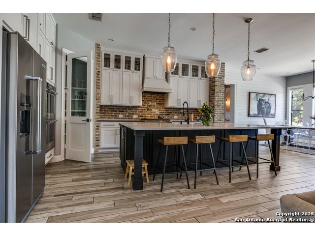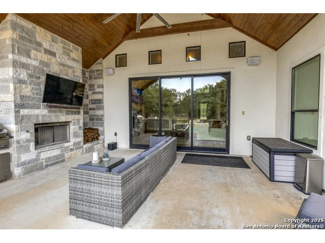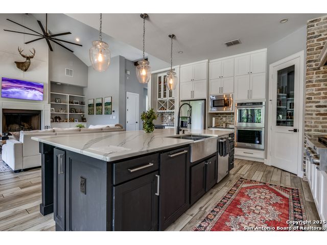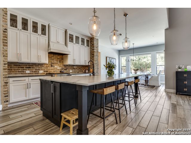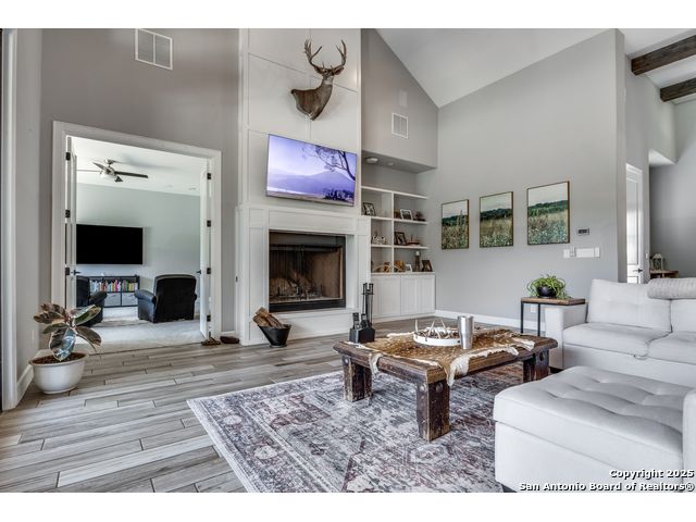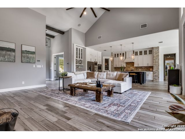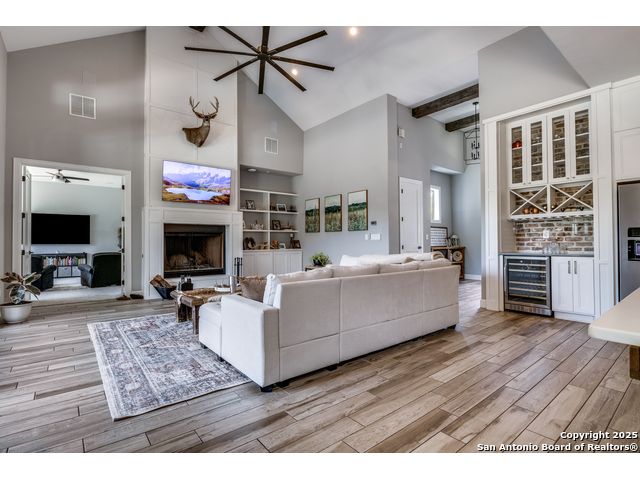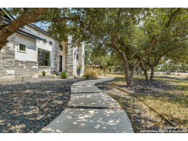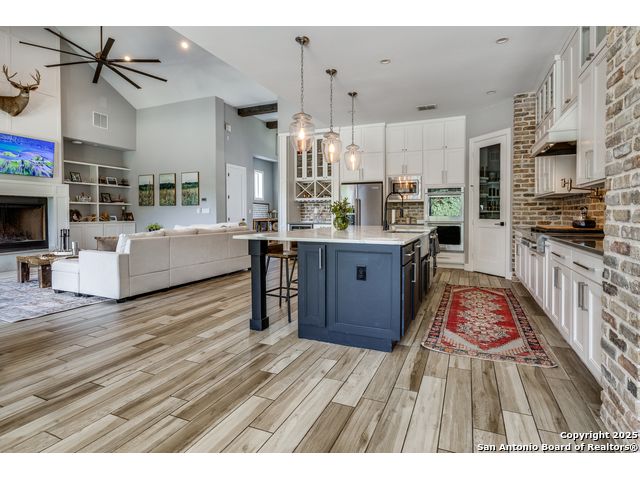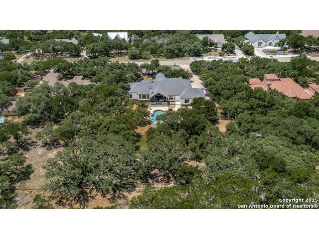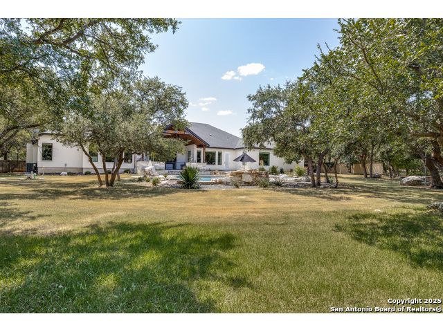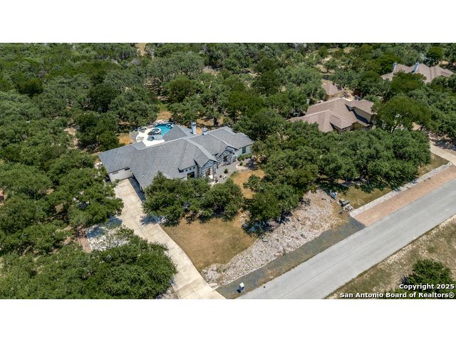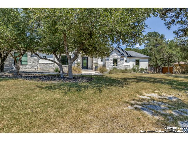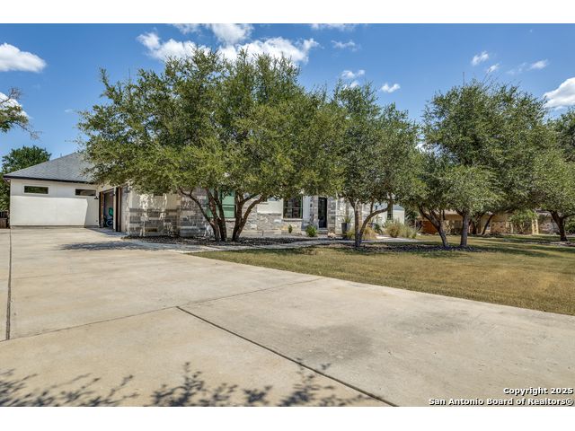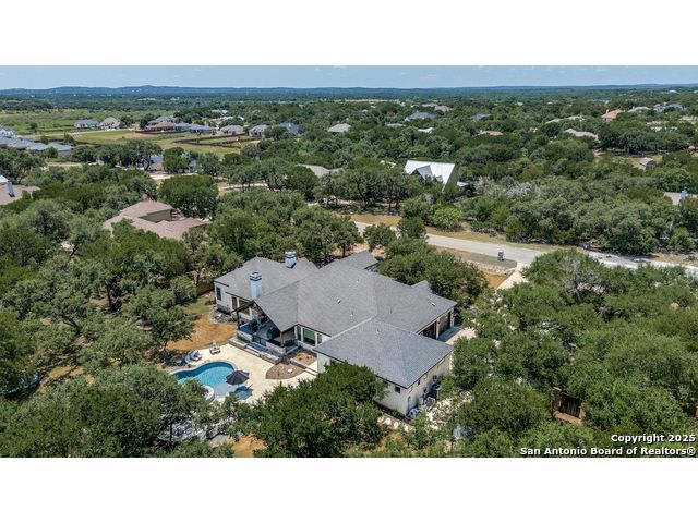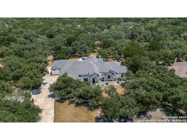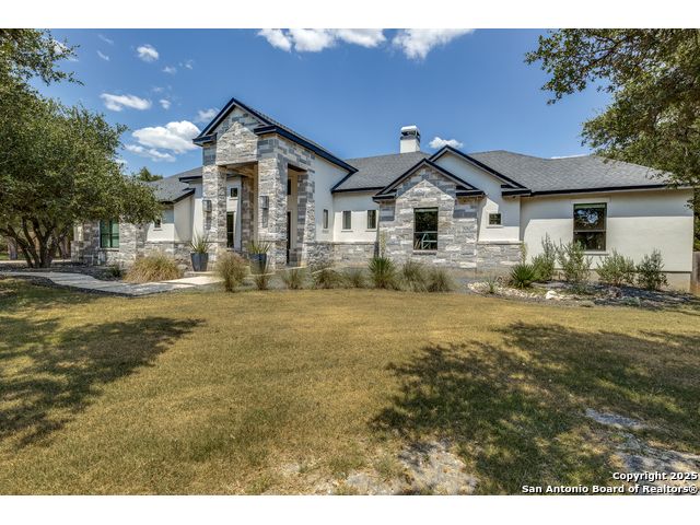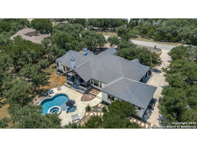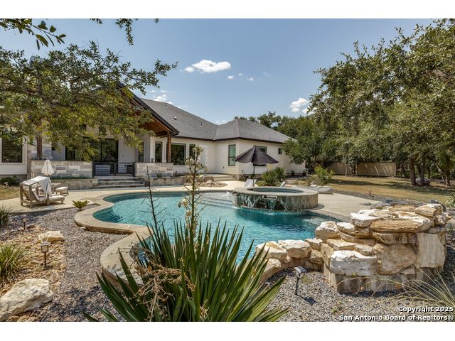 Stunning 5-bedroom 3.5-bathroom one story home with pool and dual primary suites on 1 acre lot. As you step through the front door you are greeted by elegant flooring, extremely high ceilings and an abundance of natural light. The gourmet kitchen with Chicago brick accent wall is just one of many highlights of this one of a kind home. With a humongous Cambria Brittanicca matte-finished island in its center, custom cabinets & lighting, dual ovens, a six-burner gas stove, a walk-in pantry and a wine fridge this kitchen has everything you could need and want. The primary suite, with its magazine like en-suite, is split from the rest of the house for maximum privacy and will take your breath away: Chicago Brick walk-through shower with rainfall shower heads, standalone soaking tub, his & hers vanities, a boutique style walk-in closet, shiplap tray ceiling in the bedroom and windows throughout to admire your backyard retreat. On the opposite side of the home, connected through an amazing flex space that could be used as game/flex/movie room; gym or office, you will find 3 bedrooms, one of which has its private en-suite, perfect for a guest or mother in-law suite, and two additional bathrooms. The 5th bedroom (currently being used as an office) is located towards the front of the home and has its own secret safe room. The living area with wood/gas burning fireplace is open to both the kitchen & dining area, and also houses the gates to heaven, in this case a 10-foot sliding door to your own backyard oasis. Enjoy the beautiful Texas weather under your oversized covered patio with wood fireplace and gas grill, perfect for BBQ's with family, friends & neighbors. The resort style pool with hot tub and waterfall feature is perfect to relax and enjoy a quiet evening, or have the entire family over for a large get-together. The neighborhood amenities include a park and playground with sand volleyball, large pool, fishing spots, and scenic jogging trails. Conveniently located just minutes off HWY 281 you are close to the lake, schools, shopping, restaurants, and all other attractions this area has to offer. Schedule your private showing today!