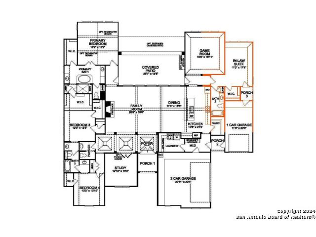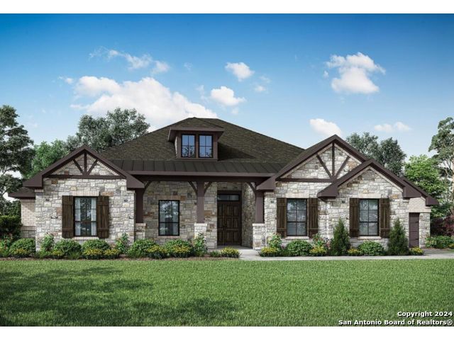 Step into luxury with this beautifully designed 1-story home that exudes comfort and sophistication. A charming covered front porch and striking double front doors welcome you into a spacious foyer, leading to a bright, open-concept layout. A wall of windows fills the living space with natural light and opens to an extended covered patio-perfect for entertaining or relaxing outdoors. Vaulted ceilings enhance the airy feel in the family room, dining area, and gourmet kitchen. Designed for the modern chef, the kitchen features a large island with storage on both sides, an upgraded 36" cooktop, double ovens, and elegant finishes throughout. This versatile floor plan includes a dedicated study, a game room, and a private in-law suite-ideal for guests or multi-generational living. The primary suite offers a luxurious retreat with dual vanities, a garden tub, a spacious walk-in shower, and two large walk-in closets. Additional highlights include a smart home package for modern convenience, a plug in the garage for an electric vehicle, and beautifully landscaped outdoor spaces.