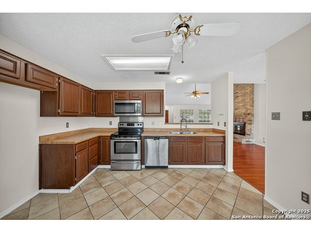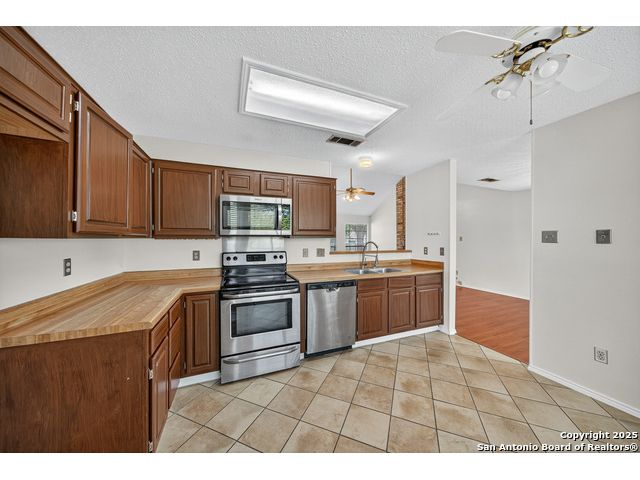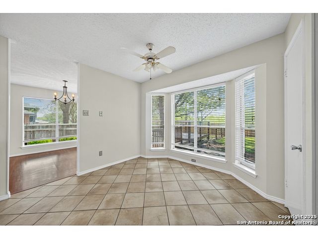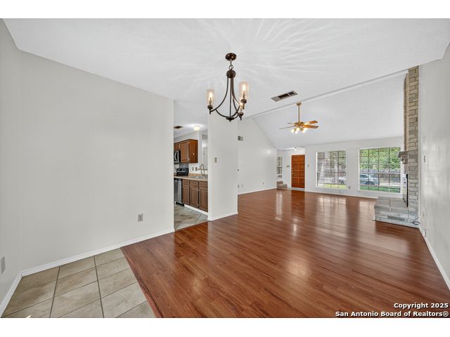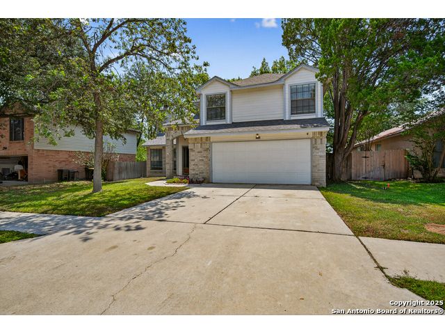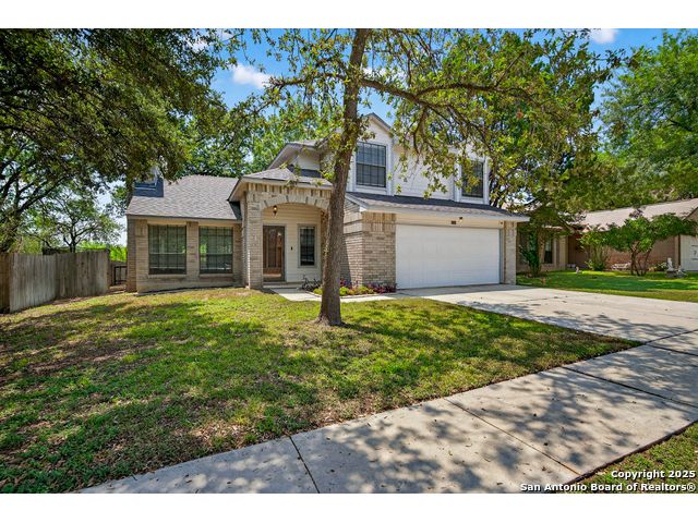 Charming 3-bedroom, 2.5-bathroom home in the desirable Woodland Oaks community of Schertz, TX. This beautiful home offers a spacious and inviting layout, perfect for both relaxation and entertaining. Upon entry, you are welcomed into the bright and airy living area, featuring vaulted ceilings and a cozy fireplace, creating a warm and welcoming atmosphere. Large windows fill the space with natural light, enhancing the home's open feel. The well-appointed eat-in kitchen is conveniently located just off the breakfast area and boasts ample cabinetry and matching stainless steel appliances, making meal prep a breeze. The generously sized primary suite is situated on the first floor, offering a peaceful retreat with a bay window. The en-suite bathroom features double vanities, a large garden tub, and a separate shower-perfect for unwinding after a long day. Upstairs, the spacious secondary bedrooms are each equipped with ceiling fans, providing comfort year-round. An additional full bathroom serves these rooms, making this home ideal for everyone. Step outside into the private backyard, which backs up to a serene greenbelt. Enjoy the outdoors on the extended wood deck, perfect for gatherings, or let your pets roam in the separate dog run. Mature trees add to the beauty and tranquility of the space. With easy access to major roads like Interstate 35 and Loop 1604, and just a short drive to Randolph AFB, this home is ideally located for convenience and comfort. Schedule a showing today-this one won't last long!