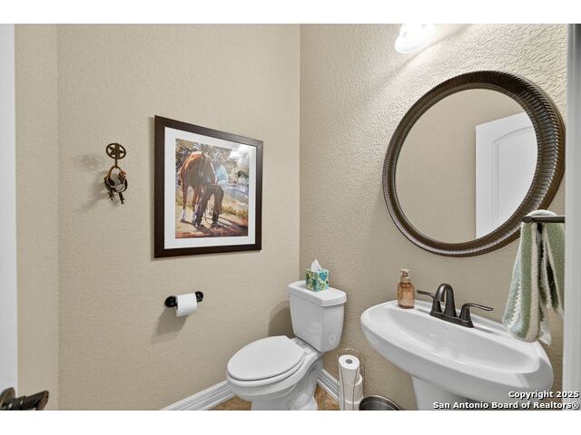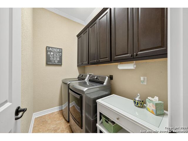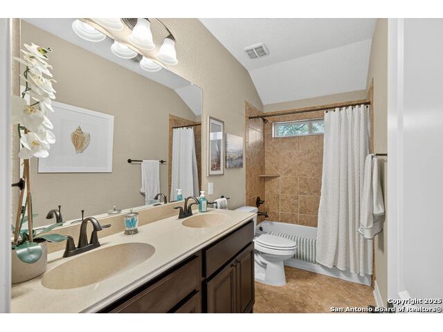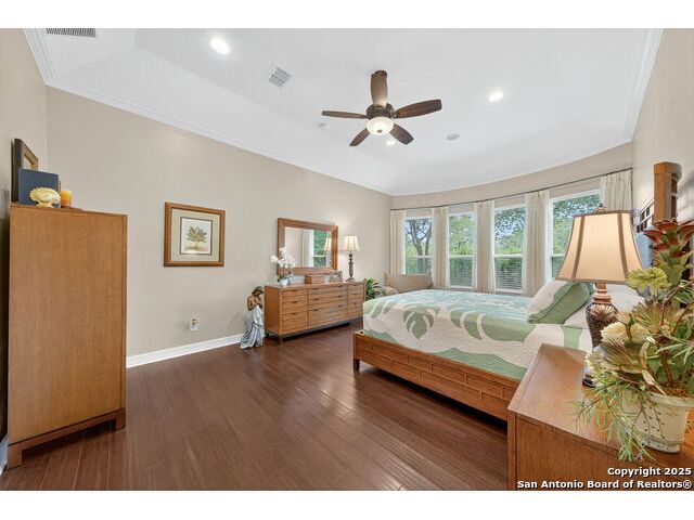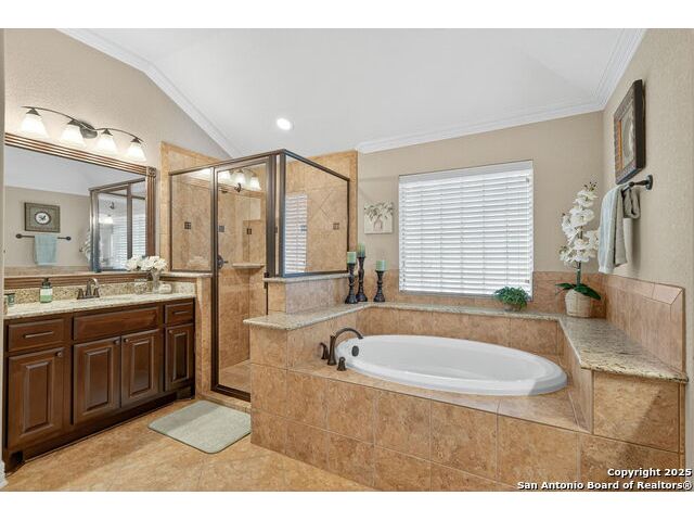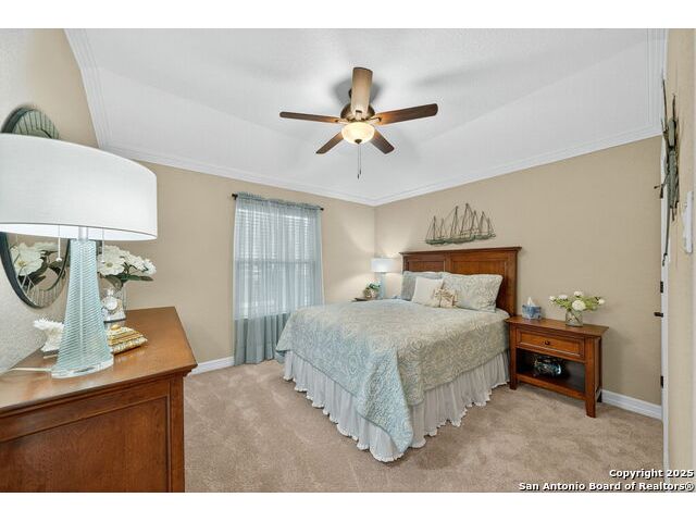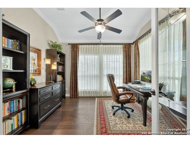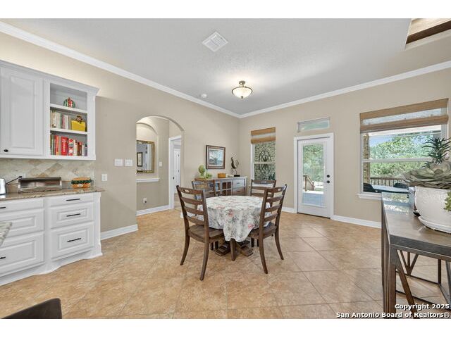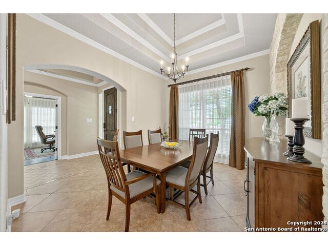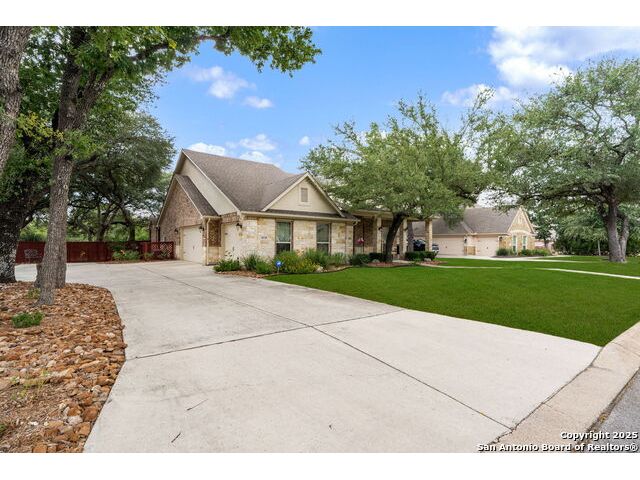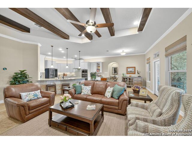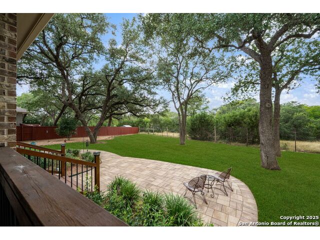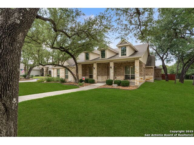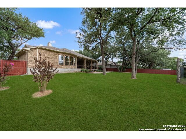 Set among mature trees in the prestigious Fair Oaks Ranch community, this 4-bedroom, 3.5-bathroom home blends timeless elegance with thoughtful design. Beautiful curb appeal and luxurious accents set the stage for the open, inviting interior. The living room makes a statement with rich wood beams, a stone accent wall, and built-in shelving, creating a warm yet sophisticated atmosphere. A spacious chef's kitchen offers stainless steel appliances, inlay oven and microwave, an inlay electric cooktop, ample cabinetry, and a peninsula with bar seating. The layout flows seamlessly into the formal dining room and a front office, providing both entertaining space and quiet work areas. The grand primary suite features an en suite bathroom with dual vanities, a separate soaking tub and shower, and an expansive walk-in closet. Additionally an dedicated media room offers the perfect space for movie nights or game days. Step outside to a generous covered patio overlooking a spacious backyard, ideal for al fresco dining, play, or simply relaxing in the shade. Located in Fair Oaks Ranch, this home offers not just comfort and style, but also a prime Hill Country setting close to shopping, dining, and top-rated schools, making it the perfect blend of luxury and everyday convenience.