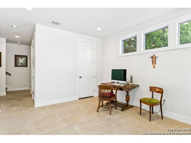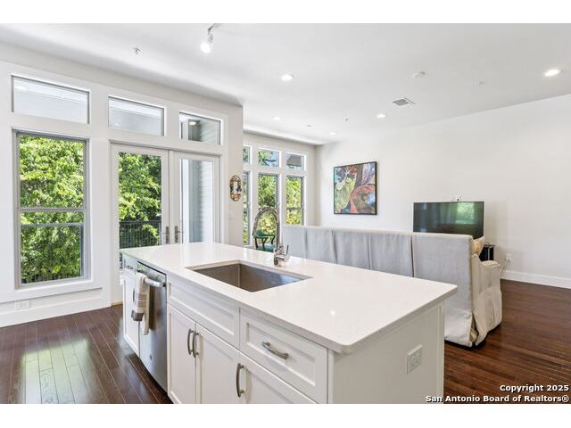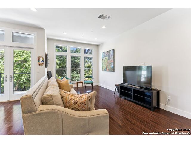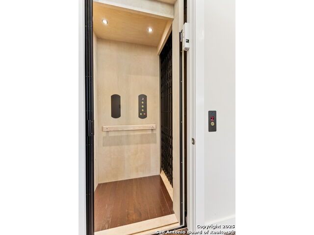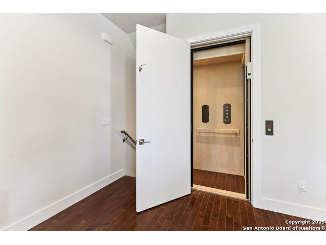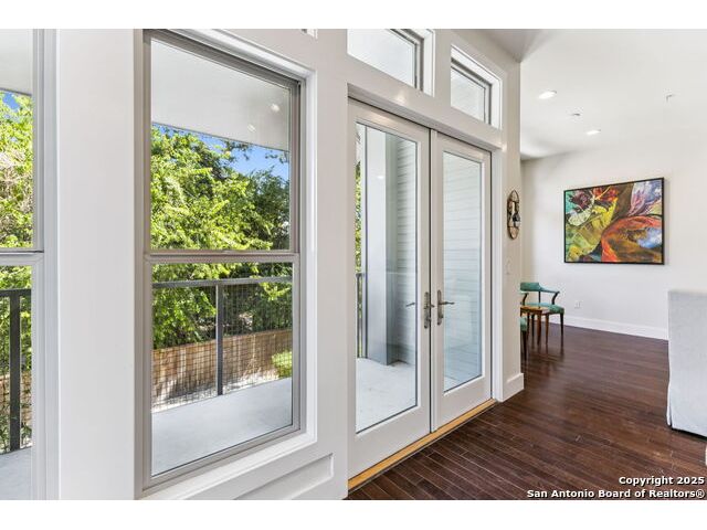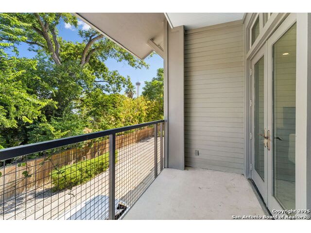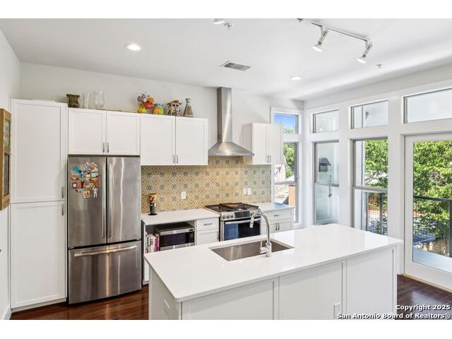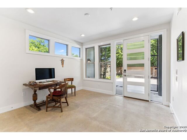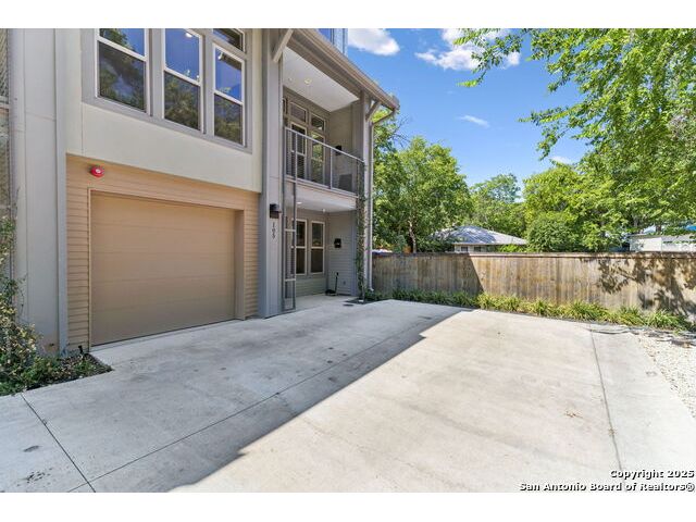 One of the very few townhouse options in King William, this north-facing private unit at the end of a common driveway is only the third unit available for resale since this original small SOJO infill community was built in 2018. The best of modern living in the middle of a historic neighborhood, just a block off the Southtown commercial corridors, this three-story unit was built for those who desire the best of urban living, a lock-n-leave option or downsizing to the next chapter. It's stocked full of options for an effortless lifestyle, including an integral elevator, tankless water heater, water softener, great insulation for comfort in heat or cold with low utility bills, and wired for security, and additional lighting options. The first-floor concrete floor office boasts two closets with a large full bath for optional use as a guest room and direct access to a single garage with extra storage area. The second floor, light-filled, tree-top view hosts an open floor concept, wood floor, living room, dining alcove and island-kitchen with generous storage and a guest half bath. A two-top table and chairs on the balcony is the perfect perch to watch downtown fireworks. The top floor offers a primary suite with two generous closets, double vanity with separate shower and tub. Nighttime views include the Pioneer Flour Mill tower and the Tower of the Americas. A second bedroom and private bath completes the floor along with a separate AC unit. Located a short walk from the San Antonio River, South Alamo restaurants, the new Rapid Green transit line to connect to the airport, and all that downtown has to offer, this unit offers everything you need to forget about managing a home, and instead, living life to the fullest.
