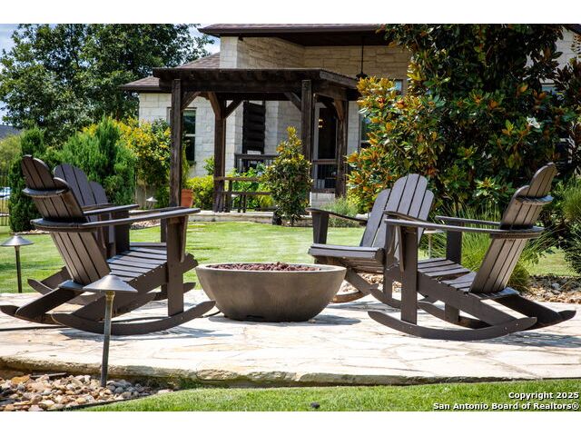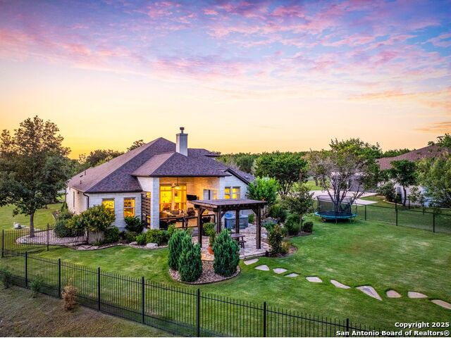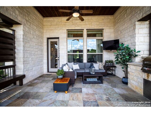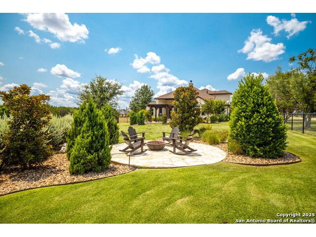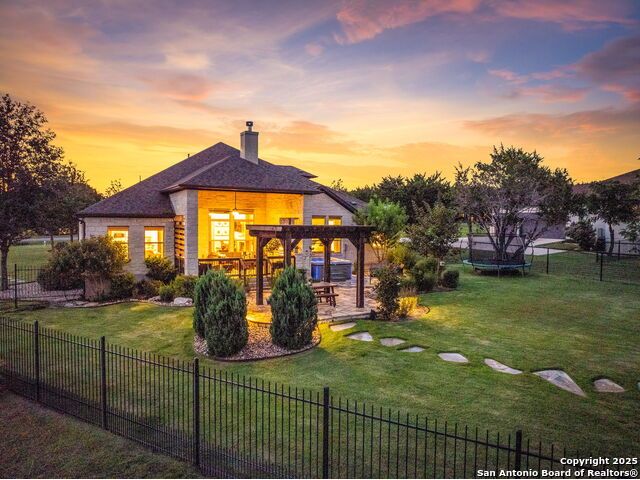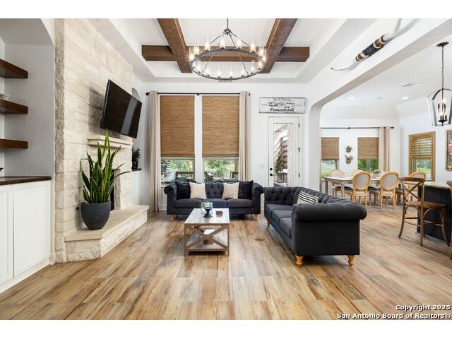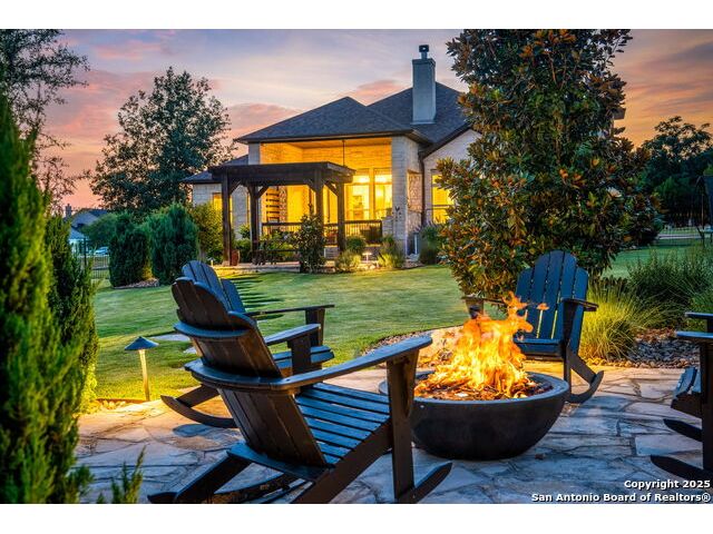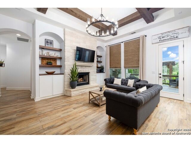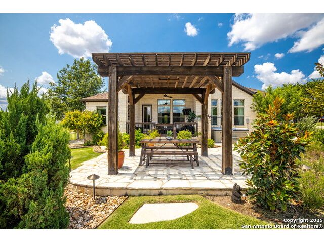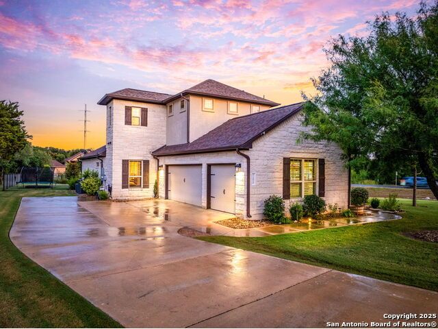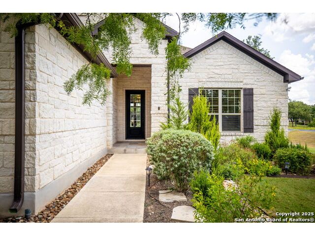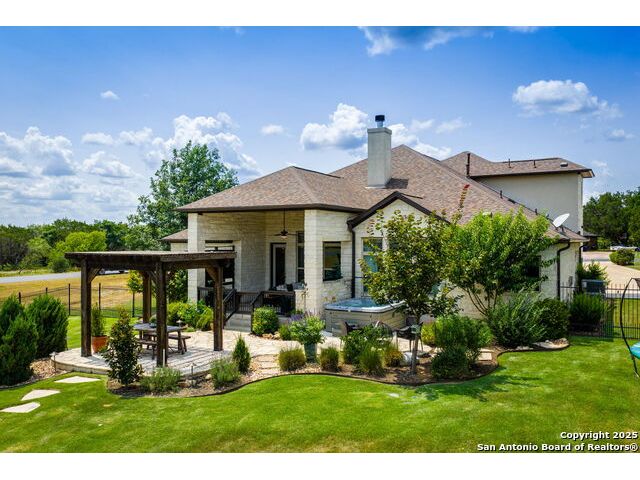 Tucked into a quiet corner of the prestigious Havenwood at Hunter's Crossing, this exceptional home offers a rare blend of space, comfort, and thoughtful design - all just minutes from Gruene, the Guadalupe River, and everything New Braunfels has to offer. Set on a generous 1+ acre corner lot in one of the area's most sought-after gated communities, it's the perfect balance of Hill Country privacy and convenience. Inside, the heart of the home is a spacious kitchen designed to impress. With a large center island, stainless appliances, gas cooking, and a stunning brick backsplash. A walk-in pantry adds everyday convenience, while the layout flows easily into the dining area - surrounded by windows and bathed in natural light. The living room features high coffered ceilings and a cozy gas fireplace. Throughout the downstairs, wood-look tile flooring adds warmth and durability, including a bold herringbone entry that sets the tone the moment you walk in. Fresh paint and updated lighting throughout the home bring a modern, clean feel. The primary suite is a private retreat, with beamed ceilings and stunning backyard views that make every morning feel like a getaway. Three additional bedrooms and two more full bathrooms are thoughtfully arranged on the main floor, offering flexibility and comfort for family or guests. A separate home office provides a polished and productive workspace, while a large bonus room with its own half bath is ideal for a media room, playroom, or second living area. Step outside to enjoy the covered patio with a built-in grill, newly added pergola, spa, and custom stonework creating a peaceful, private backyard. If you've been searching for a home that offers timeless style, smart updates, and room to grow - all within a secure, beautifully maintained Hill Country community - this is one you don't want to miss.