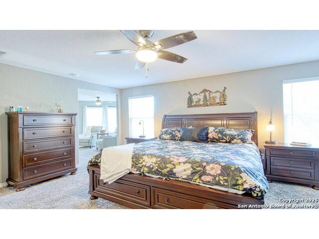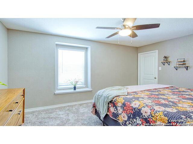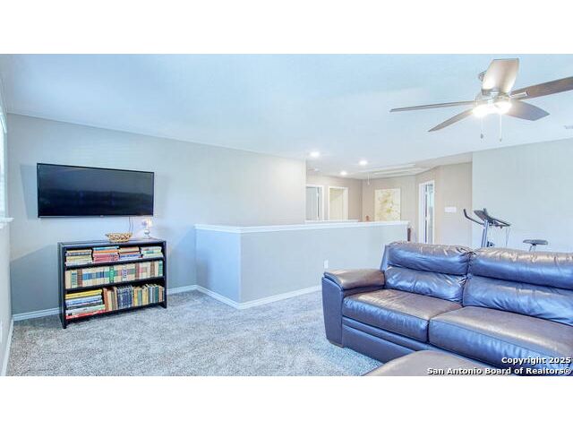 Nestled in a private community in the heart of the Texas Hill Country, this stunning two-story home in Helotes offers comfort, style, and serenity. With 3 bedrooms, 2.5 baths, and thoughtful upgrades throughout, this home features an open-concept layout, soaring ceilings, and fresh designer paint in tasteful, neutral tones. All bedrooms include spacious walk-in closets. The gourmet kitchen boasts a large island, bar seating, tile backsplash, gas cooking, and upgraded cabinetry. Brand-new, upgraded carpet adds comfort throughout the living spaces. The primary suite includes a private sitting area and a spacious en suite with an oversized glass walk-in shower and dual vanities. A downstairs study offers work-from-home flexibility, while the upstairs loft provides space for a second living area, playroom, home gym, or creative retreat. Step outside to your own backyard oasis-complete with stamped cement patio, custom patio covering, and lush landscaping. A privacy fence, mesh screen, and mature hedges ensure seclusion, while a large shade tree creates the perfect backdrop for family gatherings or peaceful evenings enjoying the Hill Country sunset. Recent updates include a new water heater, reverse osmosis system, and water softener.