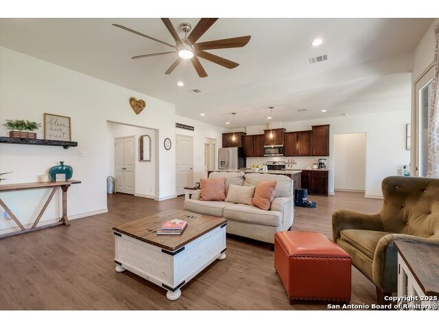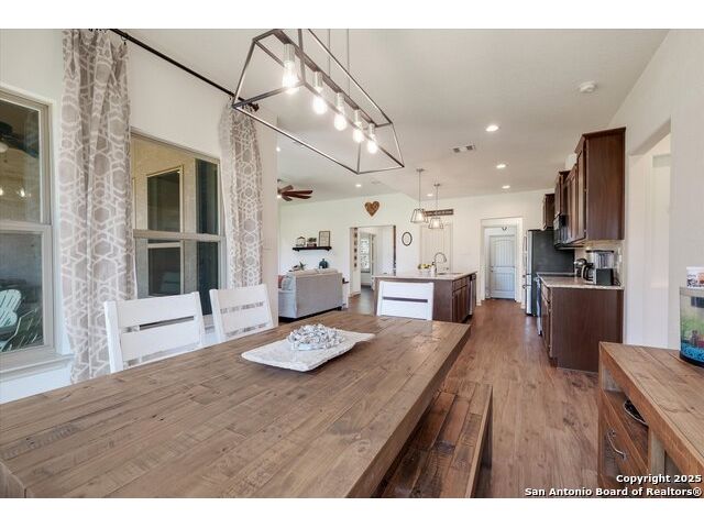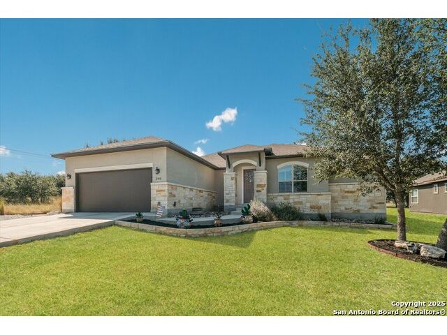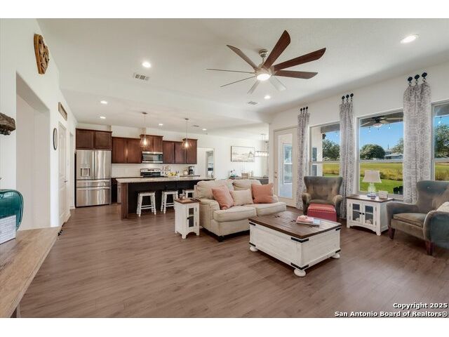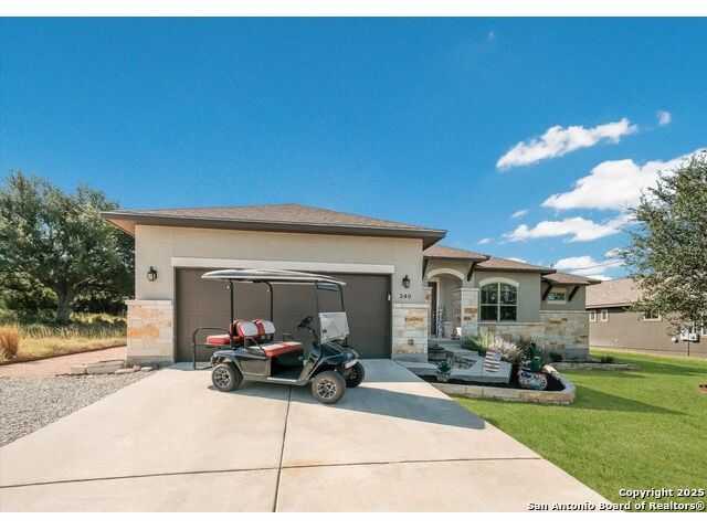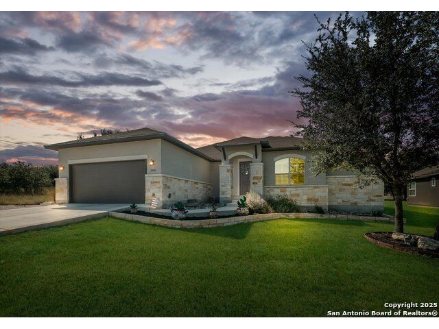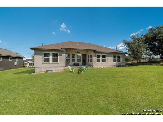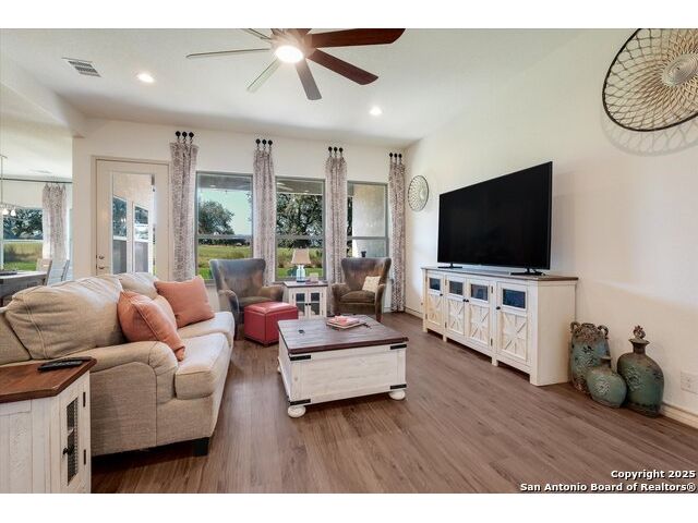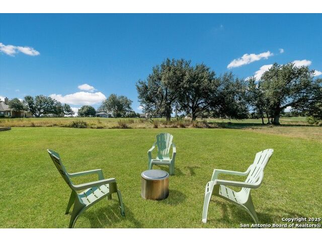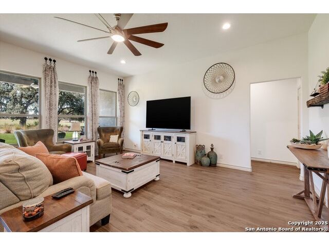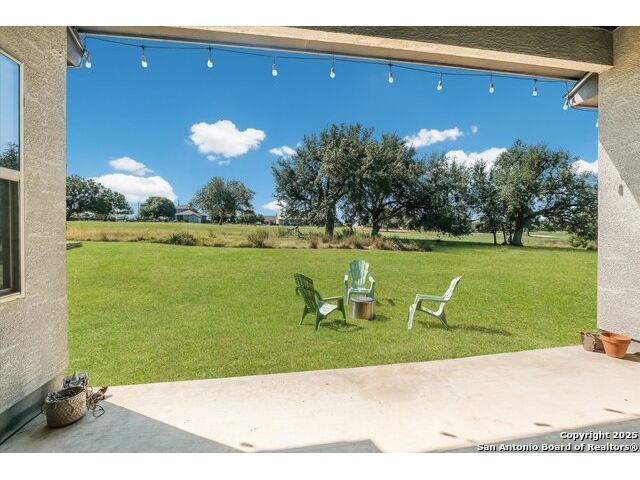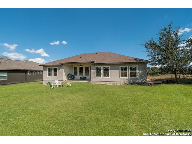 Welcome to this stunning, open-concept home built in 2019 and offered by the original owners, perfectly situated on the 14th hole of the award-winning Vaaler Creek Golf Course in the highly sought-after Rockin' J Ranch community in Blanco, Texas. Nestled in the scenic Texas Hill Country, Rockin' J Ranch offers breathtaking vistas, canyons, creeks, abundant wildlife, and dark starry nights perfect for stargazing. From the back door and covered patio, take in sweeping views of the tee box, fairway, and green from your huge lot near the top of a hill, while enjoying the security of controlled access with a gated, camera-monitored entrance. Inside, soaring ceilings and abundant natural light create a welcoming atmosphere. The gourmet kitchen features gleaming granite countertops and flows seamlessly into the living area, making it ideal for entertaining. This thoughtfully designed home offers 4 bedrooms, 2.5 bathrooms, and a luxurious primary suite with recessed ceilings, an oversized shower, and large his-and-hers closets. Premium upgrades include plantation shutters, stone-walled flower beds with river rock borders, a sprinkler system, wood-look vinyl flooring throughout (with tile in bathrooms), Arlo security cameras, and a professionally installed water softener. Outdoor living is elevated with a stone fire pit and well-maintained landscaping. A deep-bay 2-car garage provides ample storage, and the home conveys with both a golf cart (new batteries) and a gun safe. As a Rockin' J Ranch homeowner, you'll enjoy three rounds of golf per month at the acclaimed Vaaler Creek Golf Club, along with access to a Junior Olympic pool, fishing pier, hiking and biking trails, parks, and a community clubhouse. Just minutes from historic Blanco and within 40 miles of Austin, San Antonio, and charming Hill Country towns, this home offers a perfect balance of luxury, recreation, and convenience. Don't miss your chance to live where championship golf meets Texas Hill Country beauty-schedule your showing today!