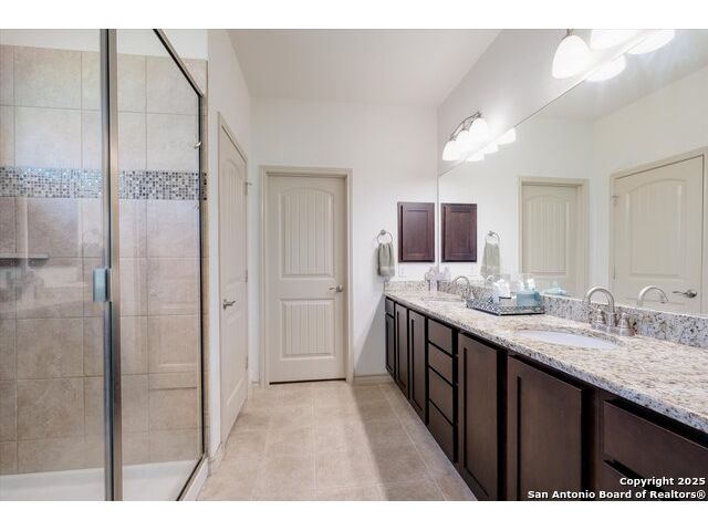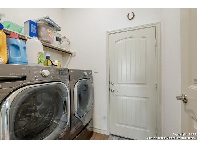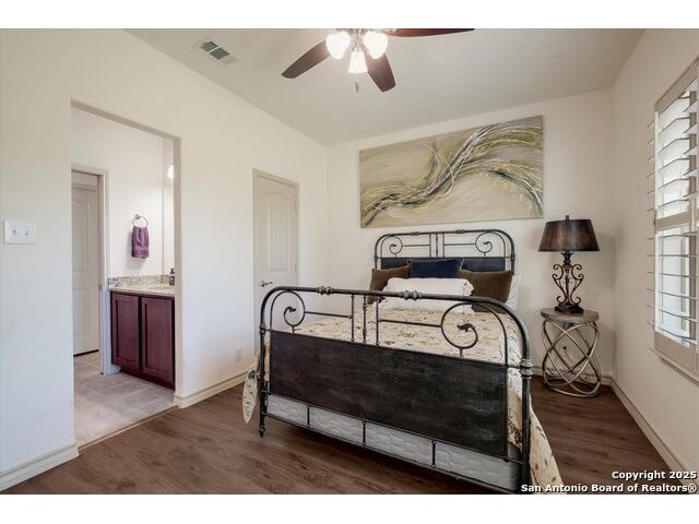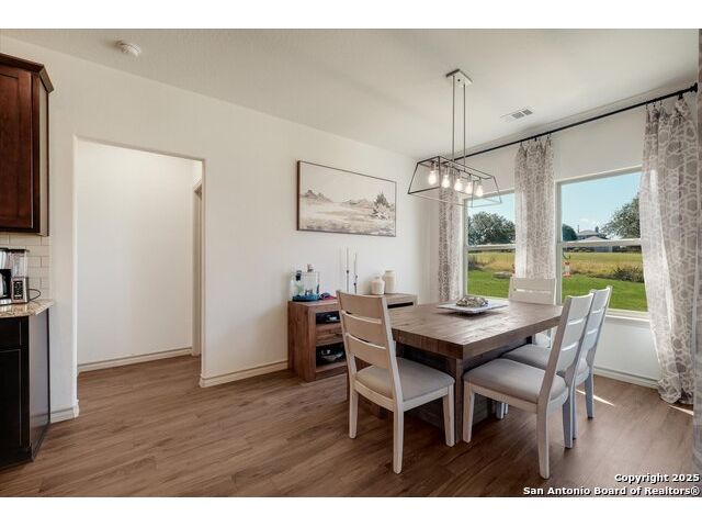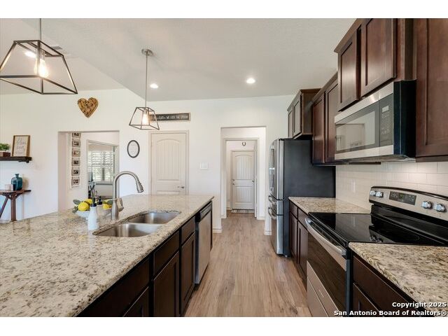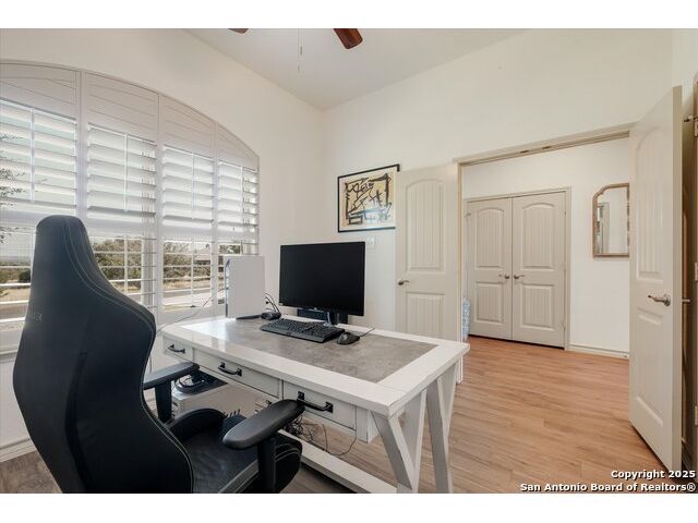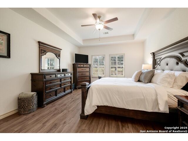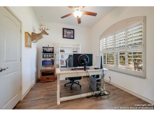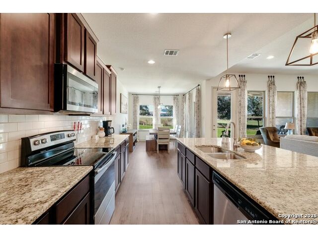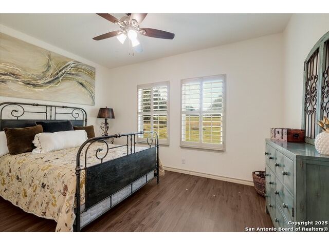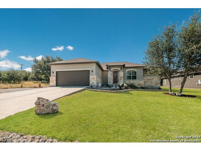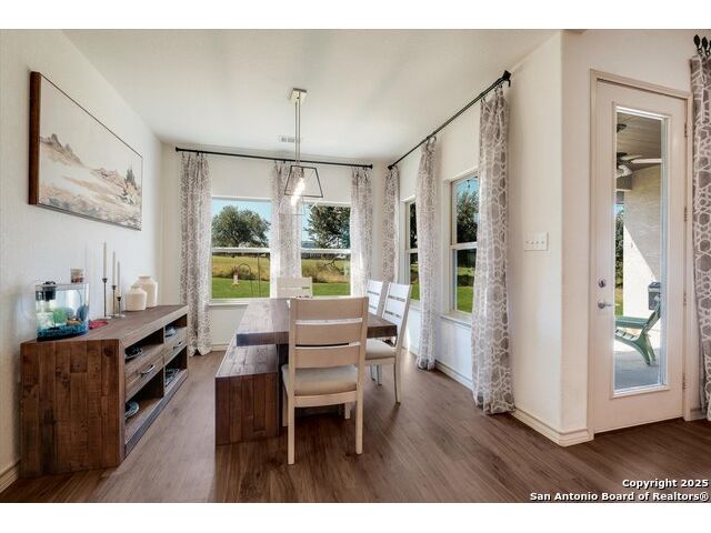 Welcome to this stunning, open-concept home built in 2019 and offered by the original owners, perfectly situated on the 14th hole of the award-winning Vaaler Creek Golf Course in the highly sought-after Rockin' J Ranch community in Blanco, Texas. Nestled in the scenic Texas Hill Country, Rockin' J Ranch offers breathtaking vistas, canyons, creeks, abundant wildlife, and dark starry nights perfect for stargazing. From the back door and covered patio, take in sweeping views of the tee box, fairway, and green from your huge lot near the top of a hill, while enjoying the security of controlled access with a gated, camera-monitored entrance. Inside, soaring ceilings and abundant natural light create a welcoming atmosphere. The gourmet kitchen features gleaming granite countertops and flows seamlessly into the living area, making it ideal for entertaining. This thoughtfully designed home offers 4 bedrooms, 2.5 bathrooms, and a luxurious primary suite with recessed ceilings, an oversized shower, and large his-and-hers closets. Premium upgrades include plantation shutters, stone-walled flower beds with river rock borders, a sprinkler system, wood-look vinyl flooring throughout (with tile in bathrooms), Arlo security cameras, and a professionally installed water softener. Outdoor living is elevated with a stone fire pit and well-maintained landscaping. A deep-bay 2-car garage provides ample storage, and the home conveys with both a golf cart (new batteries) and a gun safe. As a Rockin' J Ranch homeowner, you'll enjoy three rounds of golf per month at the acclaimed Vaaler Creek Golf Club, along with access to a Junior Olympic pool, fishing pier, hiking and biking trails, parks, and a community clubhouse. Just minutes from historic Blanco and within 40 miles of Austin, San Antonio, and charming Hill Country towns, this home offers a perfect balance of luxury, recreation, and convenience. Don't miss your chance to live where championship golf meets Texas Hill Country beauty-schedule your showing today!