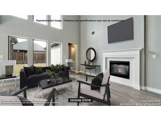 Home office with French doors and formal dining room set at two-story entry. Kitchen and morning area open to two-story family room with a wood mantel fireplace and wall of windows. Kitchen features corner walk-in pantry, 5-burner gas cooktop and generous island with built-in seating space. First-floor primary suite. Dual vanity, freestanding tub, separate glass-enclosed shower and large walk-in closet in primary bath. A second bedroom is downstairs. Upstairs features a game room and two secondary bedrooms. Extended covered backyard patio. Mud room off two-car garage.