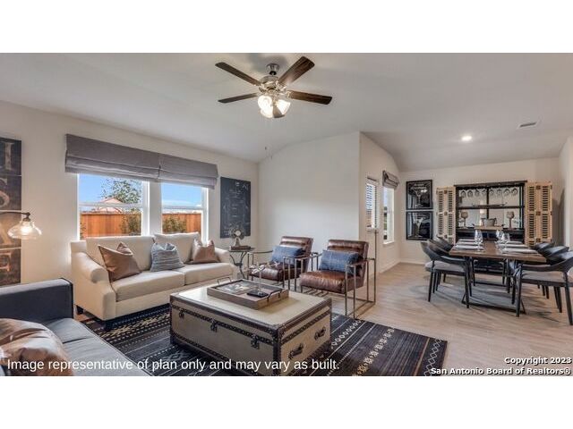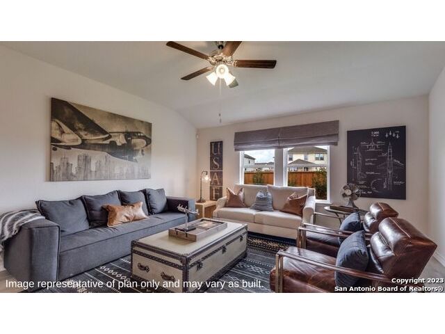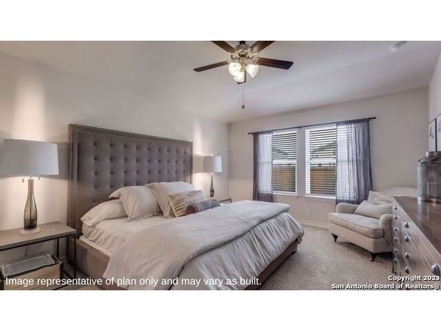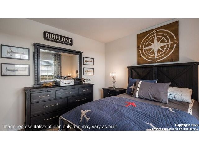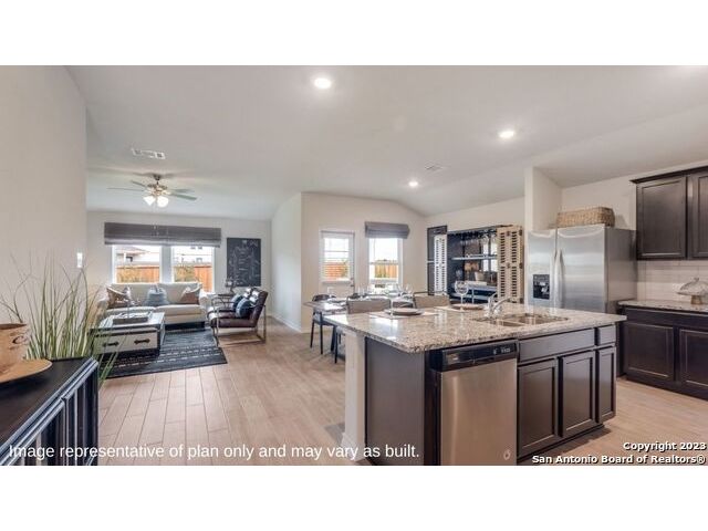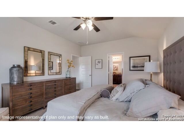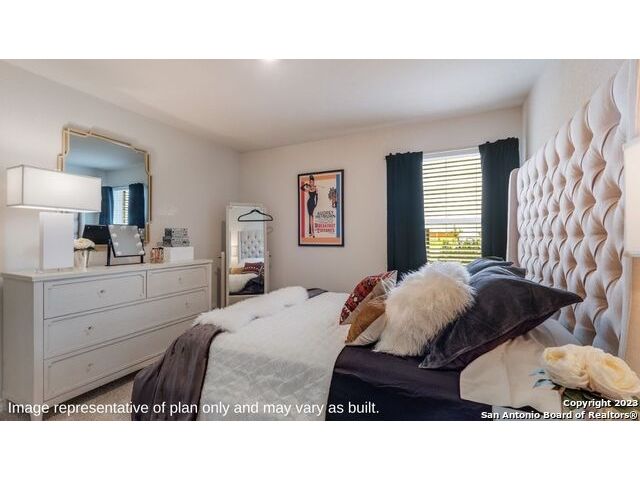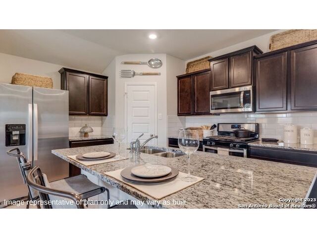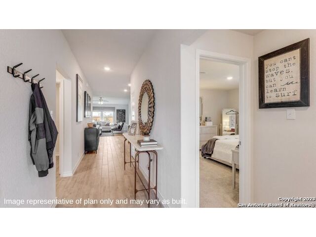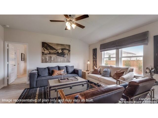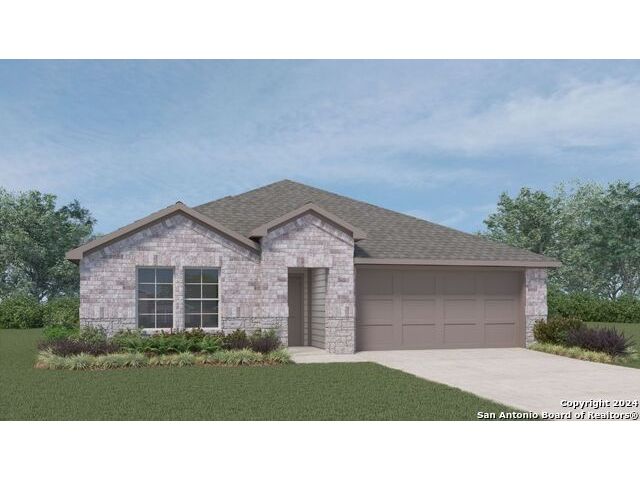 The Irvine is a charming single story home featured in Riverstone at Westpointe in San Antonio, TX. Featuring 2 classic front exterior, this 4 bedroom, 2 bathroom home also offers 1796 square feet of living space and a 2-car garage. A front patio (per plan) welcomes you down a long entry foyer before opening into a blended kitchen, dining, and family room area. The gourmet kitchen features spacious quartz countertops with classic white subway tile backsplash, gleaming stainless steel appliances, a natural gas cooking range, shaker style cabinetry and a corner walk-in pantry. A spacious island with a deep, single basin sink overlooks the living and dining room area. You'll never miss a moment of action with this floor plan layout! Enjoy the private main bedroom suite situated off the living room, featuring quality carpet, a ceiling fan and large windows for abundant natural light. Your ensuite bathroom includes dual vanity sinks with a cultured marble countertop, a tiled walk-in shower and a spacious walk-in closet. Enjoy additional privacy with a separate door for the toilet. Your secondary bedrooms are all located towards the front of the home and feature quality carpet flooring and a closet. These rooms can be used as bedrooms, offices, work out spaces or other bonus rooms! Additional features of this home include, tall nine foot ceilings, pre-plumb for a water softener loop, two inch faux wood blinds throughout and hard surface flooring in the kitchen, living room, dining area, bathrooms and utilty room. The Irvine comes with a covered rear patio (per plan) giving view to the professionally irrigated and landscaped yard complete with bermuda sod. You'll enjoy added security in your new home with our Home is Connected features. Using one central hub that talks to all the devices in your home, you can control the lights, thermostat and locks, all from your cellular device.