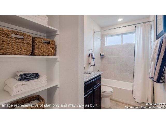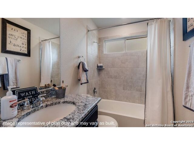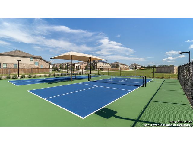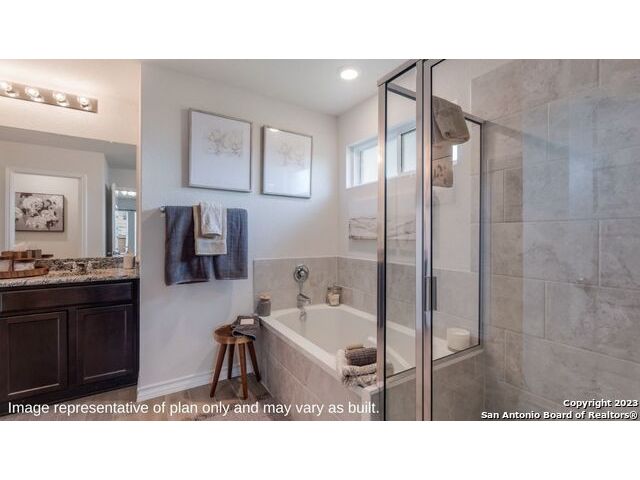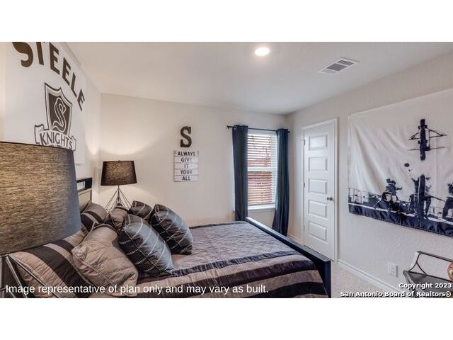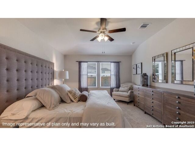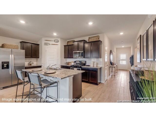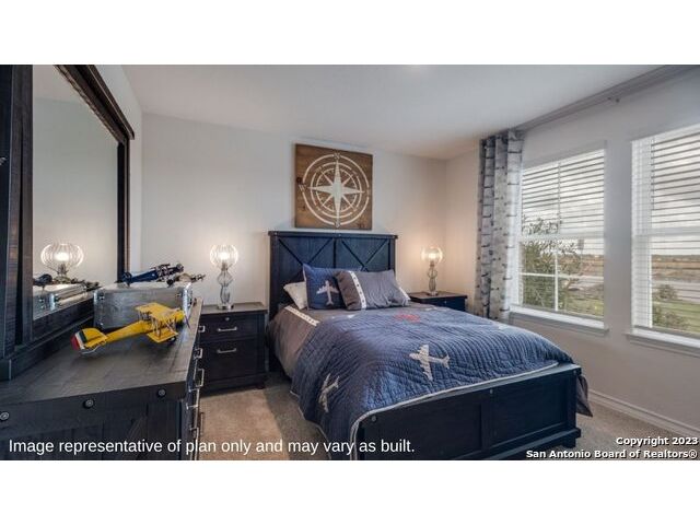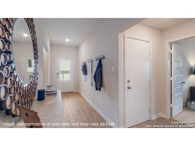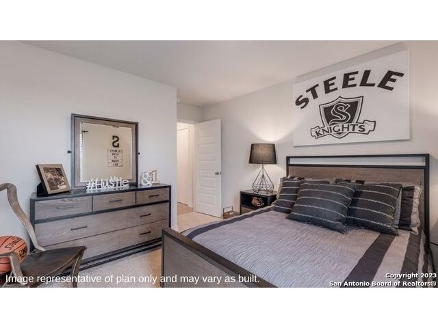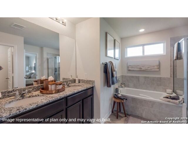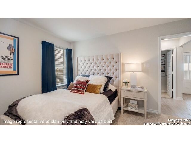 The Irvine is a charming single story home featured in Riverstone at Westpointe in San Antonio, TX. Featuring 2 classic front exterior, this 4 bedroom, 2 bathroom home also offers 1796 square feet of living space and a 2-car garage. A front patio (per plan) welcomes you down a long entry foyer before opening into a blended kitchen, dining, and family room area. The gourmet kitchen features spacious quartz countertops with classic white subway tile backsplash, gleaming stainless steel appliances, a natural gas cooking range, shaker style cabinetry and a corner walk-in pantry. A spacious island with a deep, single basin sink overlooks the living and dining room area. You'll never miss a moment of action with this floor plan layout! Enjoy the private main bedroom suite situated off the living room, featuring quality carpet, a ceiling fan and large windows for abundant natural light. Your ensuite bathroom includes dual vanity sinks with a cultured marble countertop, a tiled walk-in shower and a spacious walk-in closet. Enjoy additional privacy with a separate door for the toilet. Your secondary bedrooms are all located towards the front of the home and feature quality carpet flooring and a closet. These rooms can be used as bedrooms, offices, work out spaces or other bonus rooms! Additional features of this home include, tall nine foot ceilings, pre-plumb for a water softener loop, two inch faux wood blinds throughout and hard surface flooring in the kitchen, living room, dining area, bathrooms and utilty room. The Irvine comes with a covered rear patio (per plan) giving view to the professionally irrigated and landscaped yard complete with bermuda sod. You'll enjoy added security in your new home with our Home is Connected features. Using one central hub that talks to all the devices in your home, you can control the lights, thermostat and locks, all from your cellular device.