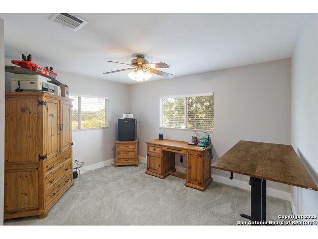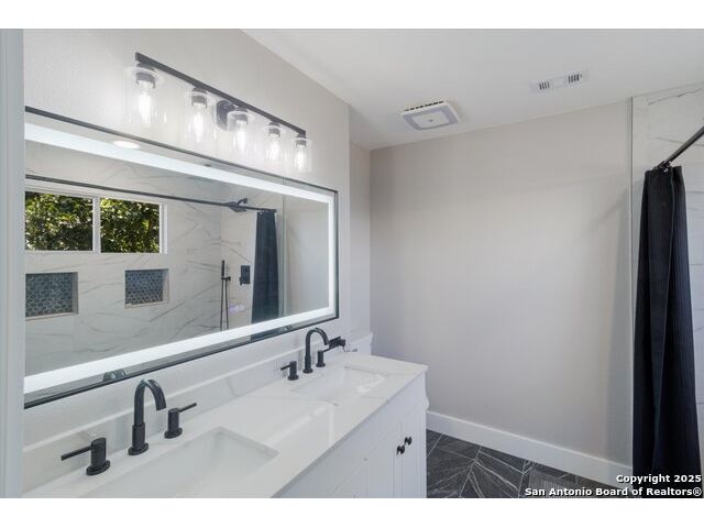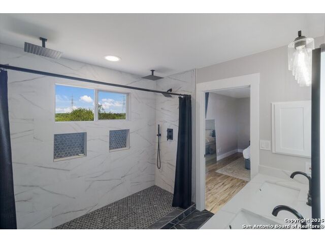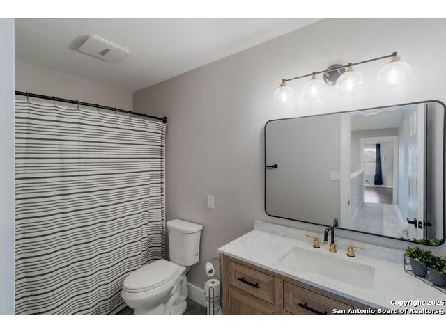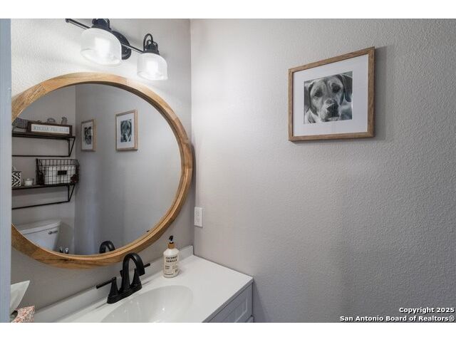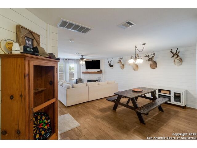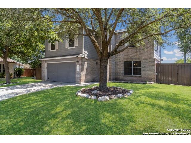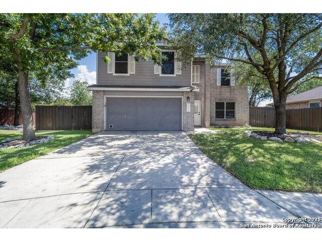 Welcome to this thoughtfully renovated 3-bedroom, 2.5-bath home located in the desirable gated community of Cedar Springs in Helotes, TX. Nestled at the end of a quiet cul-de-sac and surrounded by nature, this property offers a peaceful retreat with the convenience of city living. Inside, you'll find tasteful upgrades throughout, including modern wood-look tile flooring, shiplap accent walls, and designer finishes. The stylish kitchen features stainless steel appliances, quartz countertops, a classic subway tile backsplash, and a farmhouse sink overlooking serene country views. The open-concept living and dining area is anchored by a cozy wood-burning fireplace, creating an ideal space for entertaining. Upstairs, the split-bedroom layout includes a spacious second living area-perfect for a study, playroom, or media space. The generous primary suite includes a sitting area with scenic views and a fully updated en-suite bath featuring a large walk-in shower with dual showerheads, double vanity, and an LED backlit mirror. Secondary bedrooms and the flex space have newly installed carpet. Step outside to enjoy a private backyard with a large covered patio, garden beds, a gas glass firepit, and a storage shed. The attached garage is a handyman's dream, equipped with built-in cabinetry, workbenches, counters, a sink, and ample tool storage. Cedar Springs offers a range of community amenities including a pool, clubhouse, playground, sports courts, and newly added pickleball courts. Located within the highly rated Northside ISD and close to shopping, dining, and major highways-this move-in-ready home is one you don't want to miss!