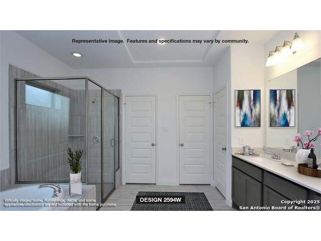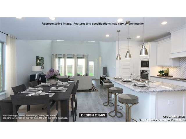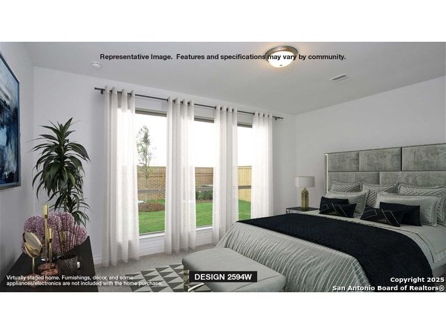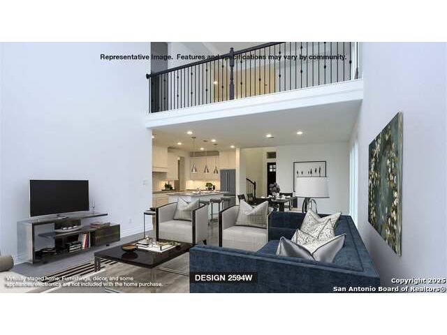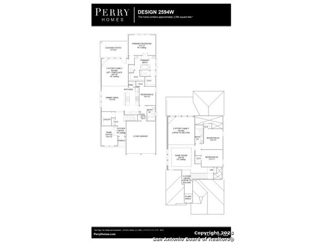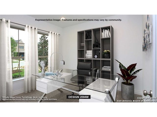 Home office with French doors set at two-story entry. Dining area opens to kitchen and adjacent two-story family room. Kitchen features walk-in pantry, 5-burner gas cooktop and generous island with built-in seating space. Family room features wall of windows. First-floor primary suite includes primary bath with dual vanity, garden tub, separate glass-enclosed shower and two walk-in closets. An additional bedroom is downstairs. A game room and two secondary bedrooms are upstairs. Covered backyard patio and 5-zone sprinkler system. Mud room off two-car garage.