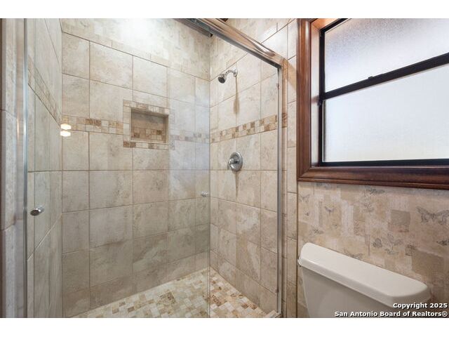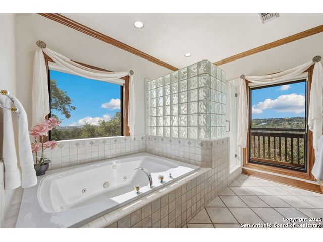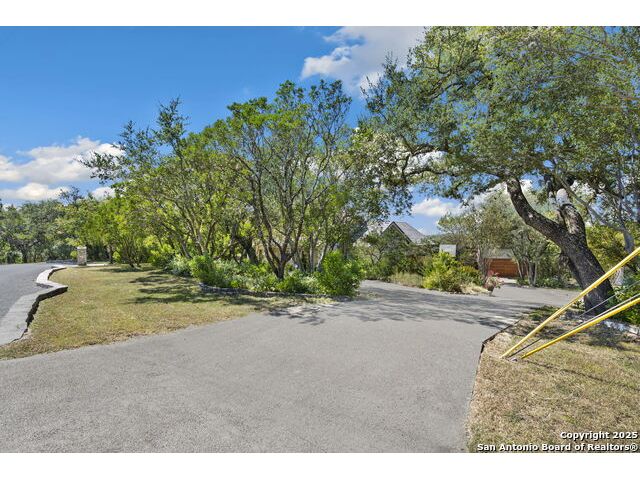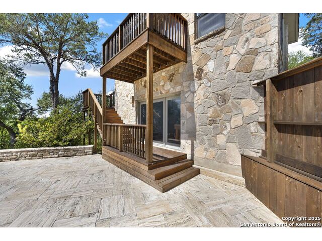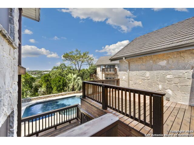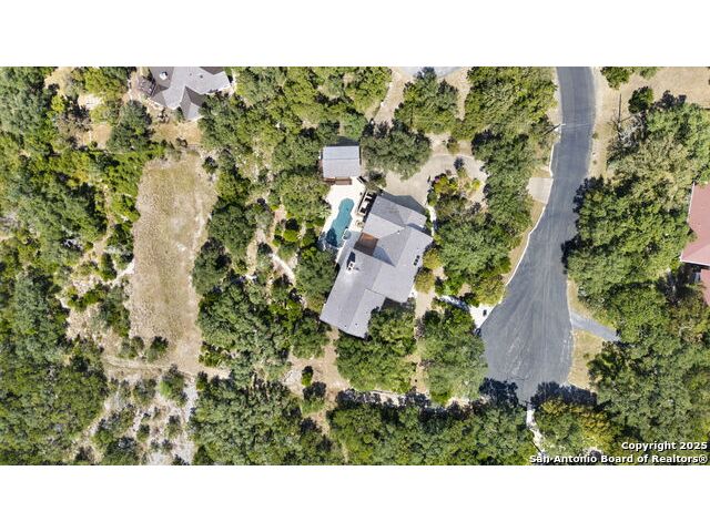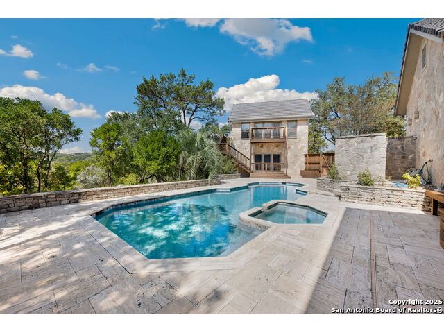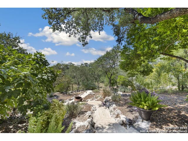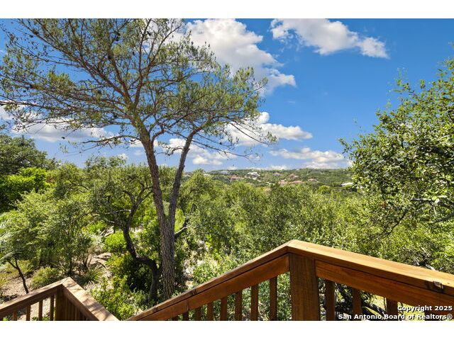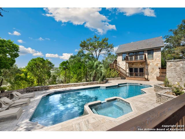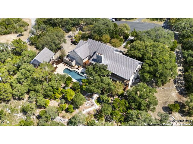 Picture arriving at this Texas Hill Country home tucked into a beautifully treed setting, with an inviting outdoor oasis waiting quietly behind the house. A separate detached studio or flex space adds versatility to the property. Easy guest suite with an additional of a bathroom. The sparkling, geometric-shaped pool glistens in the sunlight, bordered by stone hardscaping and natural landscaping that create a peaceful sense of retreat. Multiple seating areas invite you to imagine long afternoons by the raised spa or gatherings with friends on the generous decking. Tiered planters, mature greenery, and stone retaining walls blend seamlessly with the Hill Country scenery. Following the stone pathway toward the covered front entry, you reach a beautifully detailed front door with sidelights-an elegant welcome that hints at the craftsmanship throughout the home. Crossing the threshold, you enter a foyer filled with natural light leading you toward the upper level, where the first living room becomes the heart of the home. Up a short set of wide wood steps, this dramatic gathering space opens under a vaulted tongue-and-groove ceiling with exposed beams. A floor-to-ceiling stone fireplace anchors the room, while large windows frame the surrounding treetops. Double glass doors lead to an elevated deck with sweeping Hill Country vistas-an ideal spot for morning coffee or unwinding in the evening. Just off this room, the wood-paneled study offers a quiet retreat, featuring extensive built-ins, shelving, cabinetry, and desk areas. The top level continues into the primary suite, a peaceful bedroom framed by a vaulted ceiling and a wall of windows. Double doors open to a balcony. In the en-suite bath, two large picture windows bring the scenery indoors, with dual vanities, a separate glass-block shower, a soaking tub, and a large walk-in closet with built-ins. Descending back to the main level, you will discover the kitchen. A center island anchors the room, skylights brighten the workspace, and granite countertops pair with travertine backsplashes. Stainless steel appliances, including a gas cooktop, and abundant cabinetry support everyday cooking. Just beyond, the breakfast area-with its floor-to-ceiling windows-creates an inviting spot for casual dining or stepping onto the deck for fresh air. To the right of the foyer, the formal dining room features warm wood flooring, a chandelier, and a full wall of glass-front cabinetry, ideal for hosting and offering direct access to the kitchen. Still on this level, you'll find a private secondary bedroom with its own en-suite bath. Nearby, the laundry room offers a sink, plenty of storage, and workspace, and from here, you enter the oversized garage, where the finished floor and built-in cabinetry make staying organized easy. From the kitchen, step down to the lower level where you will find the second living room that centers around a full stone fireplace with an extended mantel, along with built-in cabinetry, a wet bar, and durable tile flooring. You will also enjoy direct access to the pool area, blending indoor comfort with outdoor enjoyment. Beyond this living area, a hallway leads to three secondary bedrooms. Two share an updated Jack-and-Jill bath with separate vanities and a shared walk-in shower. The third bedroom has its own private en-suite bath, and each bedroom includes ceiling fans and large windows with natural light and views. Finally, the setting of this home enhances the experience further. Though close to every service and amenity San Antonio provides, its rural character offers wildlife, serenity, and the freedom of no HOA-giving you the rare opportunity to enjoy both convenience and nature.
